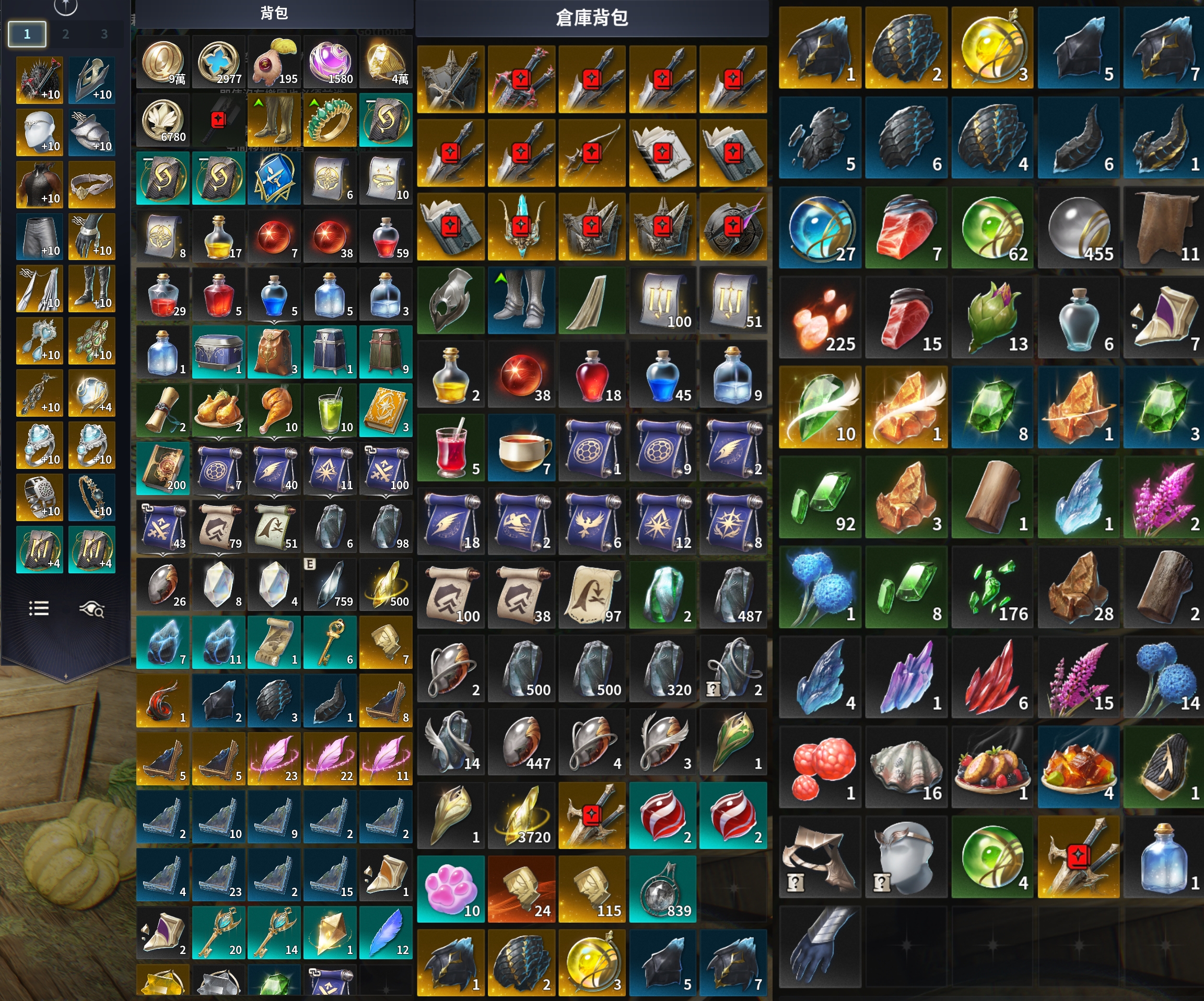 背包與倉庫雖未清理但滿載珍貴道具與材料,資源豐厚。