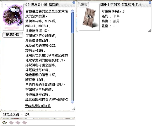 +14思念者斗篷(技能後延遲15%、刺王卡)