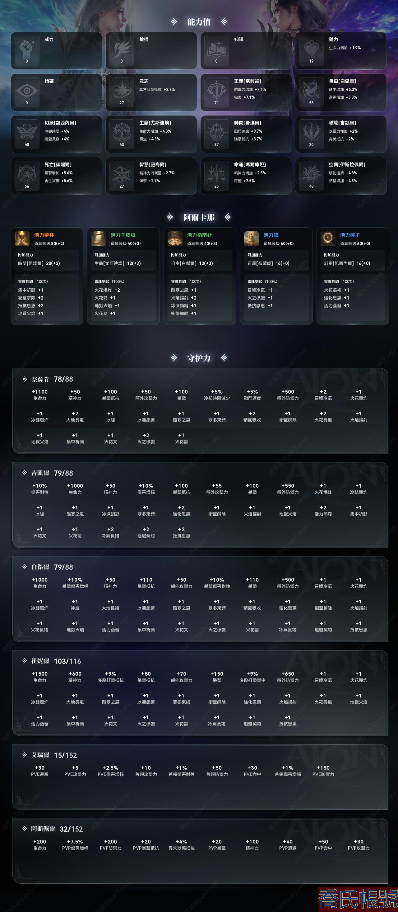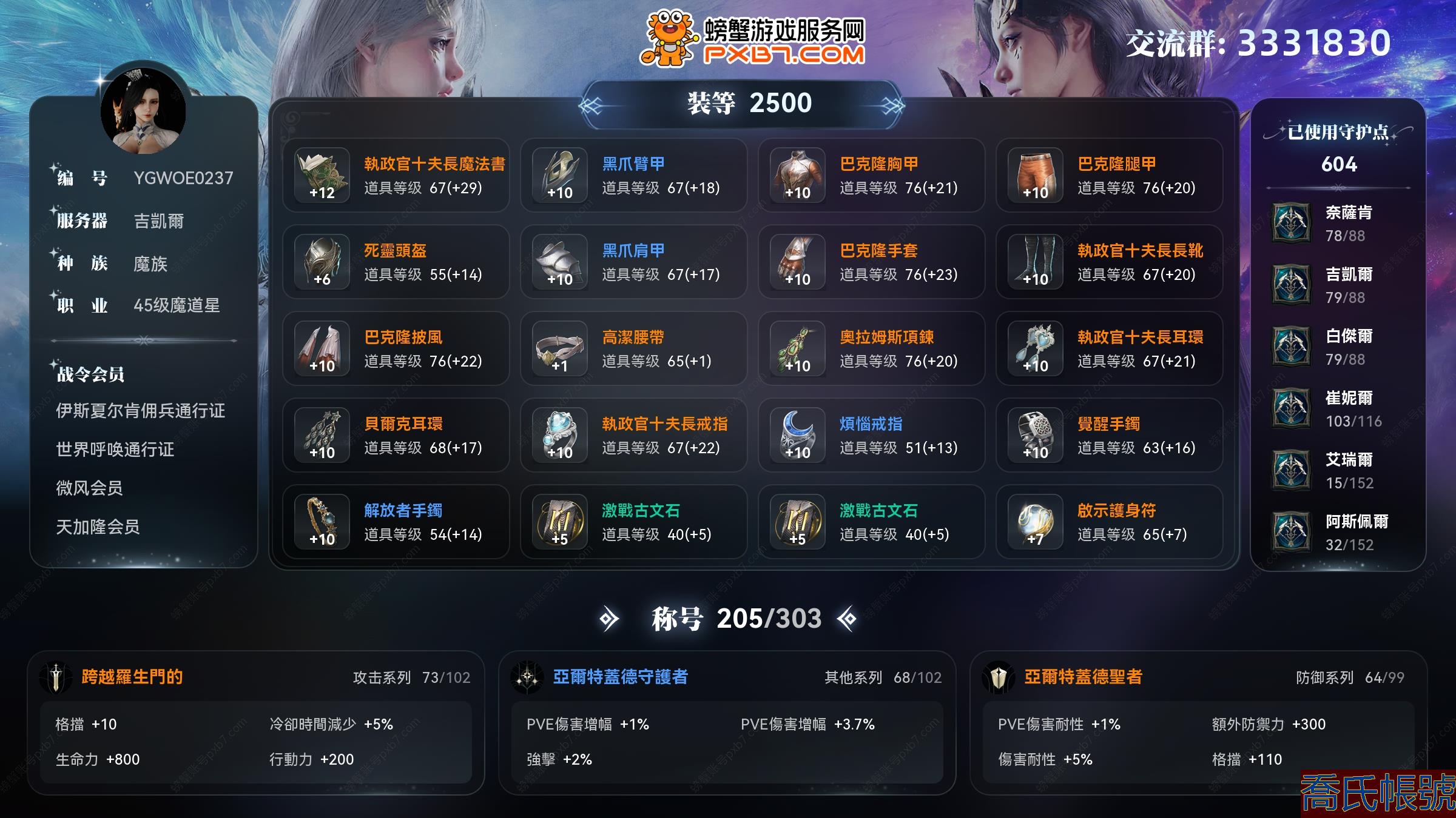 【OBYGWOE023742】【吉凱爾】45級魔族女魔道星,裝等2500,守護力604,支線進度全滿,封印副本全種族進度全滿,羽毛進度滿級,戰令會員:伊斯夏爾肯傭兵通行證,世界呼喚通行證,微風會員,天加隆會員,稱號:跨越羅生門的,亞爾特蓋德守護者,亞爾特蓋德聖者,時裝:雪花透膚裝;翅膀:森林精靈翅膀;主力技能全16級,一張金卡