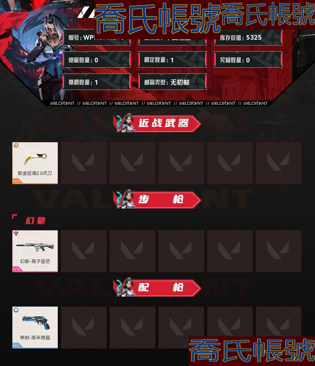 帳號 無段位,刀皮數量1,槍皮數量2(絕版0,限定1,究極0,尊爵1);庫存價值:5
