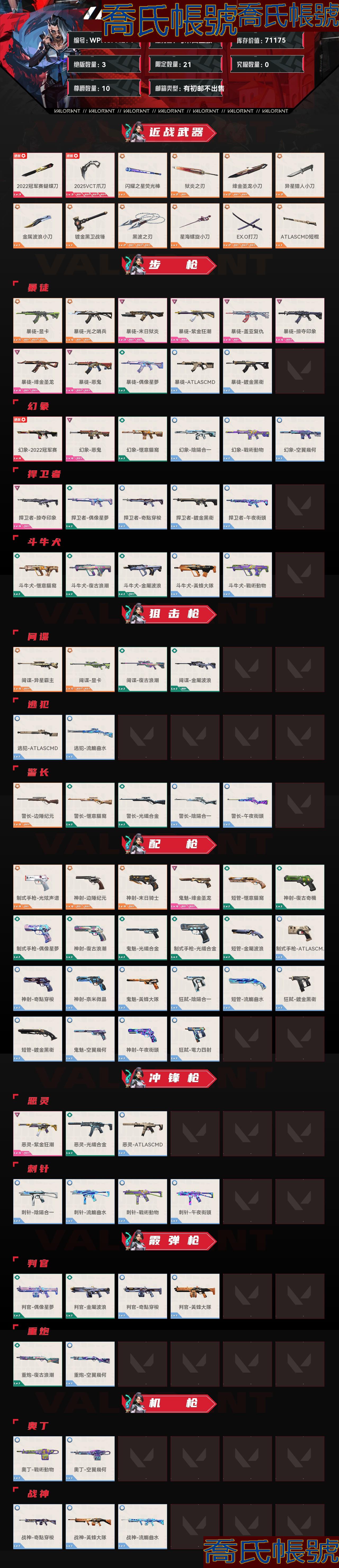 【OBWPKGM427142】白金,刀皮數量12,槍皮數量78(絕版3,限定21,究極0,尊爵10);庫存價值:71175;【刀皮】:近戰武器-2022冠軍賽蝴蝶刀,近戰武器-2025VCT爪刀,近戰武器-閃耀之星熒光棒,近戰武器-獄炎之刃,近戰武器-緋金聖龍,近戰武器-異星獵人,近戰武器-金屬波浪,近戰武器-鍍金黑衛戰錘,近戰武器-黑波之刃,近戰武器-星海螺旋,近戰武器-EX.O打刀,近戰武器-ATLASCMD短棍;【槍皮】:幻象-2022冠軍賽,制式手槍-光炫聲譜,神射-邊陲紀元,神射-末日騎士,暴徒-顯示卡,暴徒-光之哨兵,間諜-異星霸主,間諜-顯示卡,警長-邊陲紀元,鬼魅-緋金聖龍,惡靈-紫金狂潮,暴徒-末日獄炎,暴徒-紫金狂潮,暴徒-蓋亞復仇,暴徒-掠奪印象,暴徒-緋金聖龍,暴徒-惡鬼,幻象-惡鬼,捍衛者-掠奪印象,鬥牛犬-愜意貓窩,幻象-愜意貓窩,警長-愜意貓窩,短管-愜意貓窩,神射-復古奇機,暴徒-偶像星夢,制式手槍-偶像星夢,捍衛者-偶像星夢,判官-偶像星夢,間諜-復古浪潮,神射-復古浪潮,鬥牛犬-復古浪潮,重炮-復古浪潮,鬼魅-光纖合金,警長-光纖合金,惡靈-光纖合金,制式手槍-光纖合金,間諜-金屬波浪,短管-金屬波浪,判官-金屬波浪,鬥牛犬-金屬波浪,暴徒-ATLASCMD,制式手槍-ATLASCMD,逃犯-ATLASCMD,惡靈-ATLASCMD,捍衛者-奇點穿梭,判官-奇點穿梭,戰神-奇點穿梭,神射-奇點穿梭,神射-奈米微晶,鬥牛犬-黃蜂大隊,判官-黃蜂大隊,鬼魅-黃蜂大隊,戰神-黃蜂大隊,警長-陰陽合一,幻象-陰陽合一,刺針-陰陽合一,狂弒-陰陽合一,戰神-流觴曲水,逃犯-流觴曲水,刺針-流觴曲水,短管-流觴曲水,暴徒-鍍金黑衛,捍衛者-鍍金黑衛,狂弒-鍍金黑衛,短管-鍍金黑衛,幻象-戰術動物,奧丁-戰術動物,鬥牛犬-戰術動物,刺針-戰術動物,鬼魅-空翼幾何,重炮-空翼幾何,幻象-空翼幾何,奧丁-空翼幾何,刺針-午夜街頭,警長-午夜街頭,捍衛者-午夜街頭,神射-午夜街頭,狂弒-電力四射;【熱門玩家卡面】:非你莫屬蘇法玩家卡面,偶像星夢玩家卡面,2025VCT太平洋聯賽玩家卡面,2025VCT美洲聯賽玩家卡面,Champions2022NICE玩家卡面,Champions戰隊玩家卡面,布魯諾將軍玩家卡面,Champions2022玩家卡面,輕裝上街玩家卡面,2025VCT歐非洲中東聯賽玩家卡面,勢不可擋蓋克玩家卡面,衝煮咖啡玩家卡面,緋金聖龍玩家卡面,歷歷在目玩家卡面,2025VCTCN聯賽玩家卡面,勢不可擋薇蝮玩家卡面;【熱門吊飾】:電吉他吊飾,九品之蓮吊飾,Champions2022吊飾,糖葫蘆吊飾,打不破吊飾,虎福臨門吊飾,2025VCTCN聯賽吊飾,後記幸運星吊飾,口袋婕提吊飾,偶像星夢吊飾,2025VCT美洲聯賽吊飾,幸運星吊飾,2025VCT太平洋聯賽吊飾,口袋吊飾,緋金聖龍吊飾,機轟雷擊吊飾,科爾賓之光吊飾,戰術甩爪企鵝丹丹吊飾,九品之蓮吊飾,機轟雷擊吊飾,口袋婕提吊飾,Champions2022吊飾,糖葫蘆吊飾,熒光棒吊飾,2025VCT美洲聯賽吊飾,偶像星夢吊飾,特戰英豪紀念幣吊飾,熒光棒吊飾,後記幸運星吊飾,Champions2022棒球帽吊飾,口袋吊飾,幸運星吊飾,Champions2022棒球帽吊飾,電吉他吊飾,緋金聖龍吊飾,科爾賓之光吊飾,2025VCT太平洋聯賽吊飾,2025VCT歐非洲中東聯賽吊飾,虎福臨門吊飾,打不破吊飾,2025VCTCN聯賽吊飾,2025VCT歐非洲中東聯賽吊飾,特戰英豪紀念幣吊飾,戰術甩爪企鵝丹丹吊飾;【熱門塗鴉】:一箱喵塗鴉,尷尬叛奇塗鴉,呆萌舞獅塗鴉,小丑貓咪塗鴉,糗大了塗鴉,一球煙霧塗鴉,傳遞愛意塗鴉,戰術動物塗鴉,悲喜臉譜塗鴉,打得好塗鴉,睡眼惺忪塗鴉,美味火鍋塗鴉,給贊塗鴉,霓虹愛心塗鴉,緋金聖龍塗鴉,超潮塗鴉,雙擊點贊塗鴉,永別了間諜塗鴉,鳥人搖擺塗鴉,Champions2022塗鴉,融合拍檔塗鴉,閒來無事打毛線塗鴉,偶像星夢塗鴉,行禮如儀塗鴉,Champions2022婕提差距塗鴉,童趣旋刃塗鴉,糟了下雨了塗鴉,歐門貓舞塗鴉,宙是這麼酷塗鴉,GLHF塗鴉,我的刀咧塗鴉,又被閃瞎塗鴉; VCT爪刀+一堆精品刀