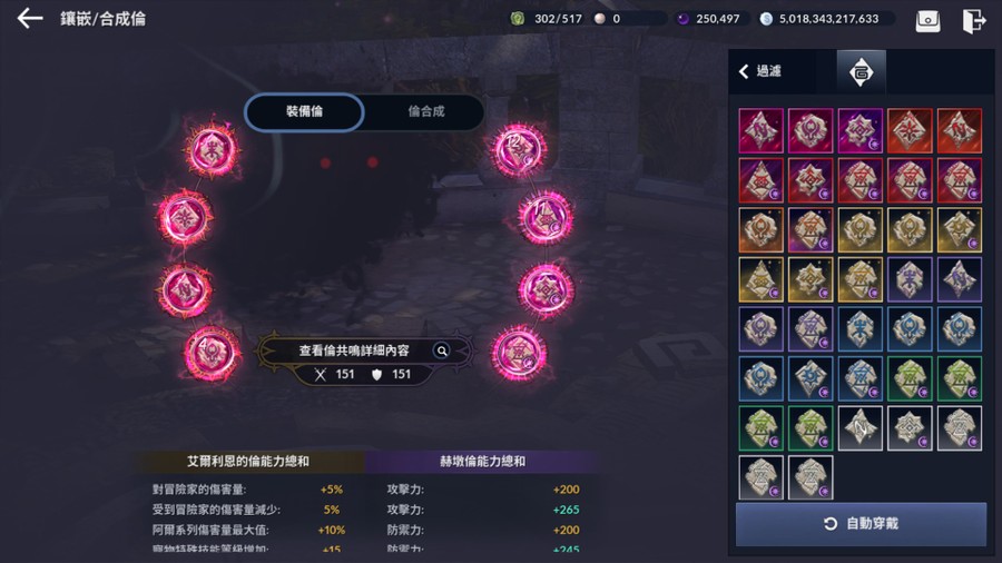 ●主角色武防裝備--- +8混沌主武器 / +8黎明輔助武器 / +8黎明頭盔 / +8黎明盔甲 / +8黎明鞋子 / +8黎明手套(全太古記憶刻印 / 全鑲滿嵌混沌水晶x30 / 全魔力刻印滿,全+100攻擊/+100防禦_頂),+8空虛項鍊(已覺醒) / +8空虛戒指(已覺醒) / +8空虛耳環(已覺醒) / +8空虛腰帶(已覺醒) / +8空虛手鐲(已覺醒)(全太古記憶刻印 / 全鑲滿精緻的混沌水晶x15 / 各部位飾品之魔力刻印_全+90以上攻擊/+90以上防禦),黑精靈倫(全太古黑精靈倫, +12武力之倫 / +11鐵甲之倫 / +2能量之倫 / 經驗之倫 / 戰爭之倫 / 意志之倫 / 阿爾之倫 / +6同行之倫 ,套用第15個倫共鳴_頂),+29協調的煉金石(鑲嵌+10混沌煉金石:突破 & +10混沌煉金石:幸運 & +9混沌煉金石:激烈 & +9混沌煉金石:勇猛,仍保留大量資源給您自由彈性選擇要衝的煉金石),+10空虛拉夫利普文物 & +10空虛阿爾文物(全太古以上紋樣,其中鑲嵌 2張燦爛太古紋樣刻印書 & 2張 燦爛的混沌紋樣刻印書_頂數值+133攻/+71防 & 6張混沌紋樣刻印書 ; 系列突破分別為+6/+6),+24空虛的徽章,混沌光源石 (四種分別突破數值如圖所示;+14太古光源石=+0混沌光源石;+15太古光源石=+2混沌光源石;+16太古光源石=+4混沌光源石;製作介面可察看轉換,+15以上光源石才建議太古升為混沌,因可開箱取得),+2傳承之環 (混沌等級),+8渾沌的龜裂圖騰 (結合3個+8圖騰),+7夜幕靈魂石/+5月光靈魂石(近期更新的新裝備機制)