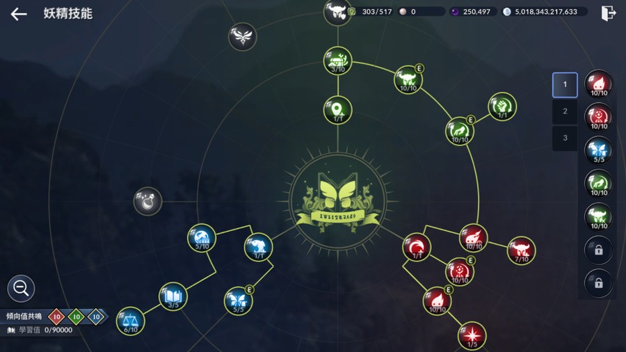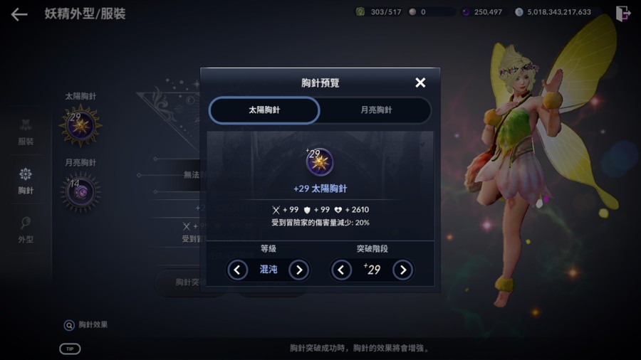 ●妖精-已解鎖 沙漠的痕跡/蛤蜊自動拾取 & 黑石塊祭壇自動奉獻 & 黑暗能量經驗值增加 等...10多種實用技能(多數等級頂),省去手動撿拾/點選 的麻煩,掛大沙漠也讓純水的效益更高些! (太陽胸針為混沌階級以上,如圖)