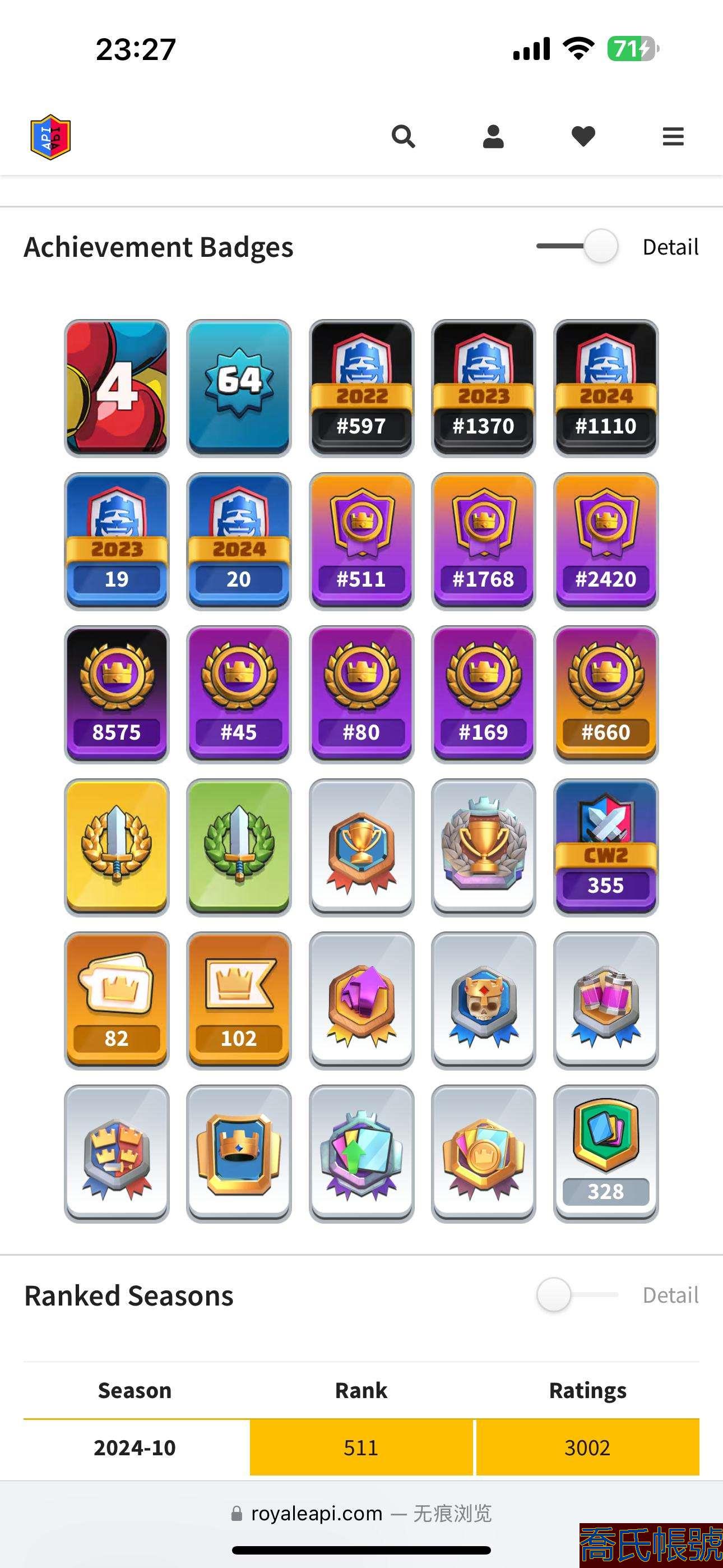 【OBHHVZH951542】角色等級:64|獎盃數量:10000|競技場等級:10|超凡數量:31|滿級數量:75|按熱門表情:咪咪咪,陰陽臉,擦杯獎|皇室戰爭64級雙表情!錦標賽全球top45,2024年20勝 皇室戰爭64級雙表情!錦標賽全球top45,2024年20勝