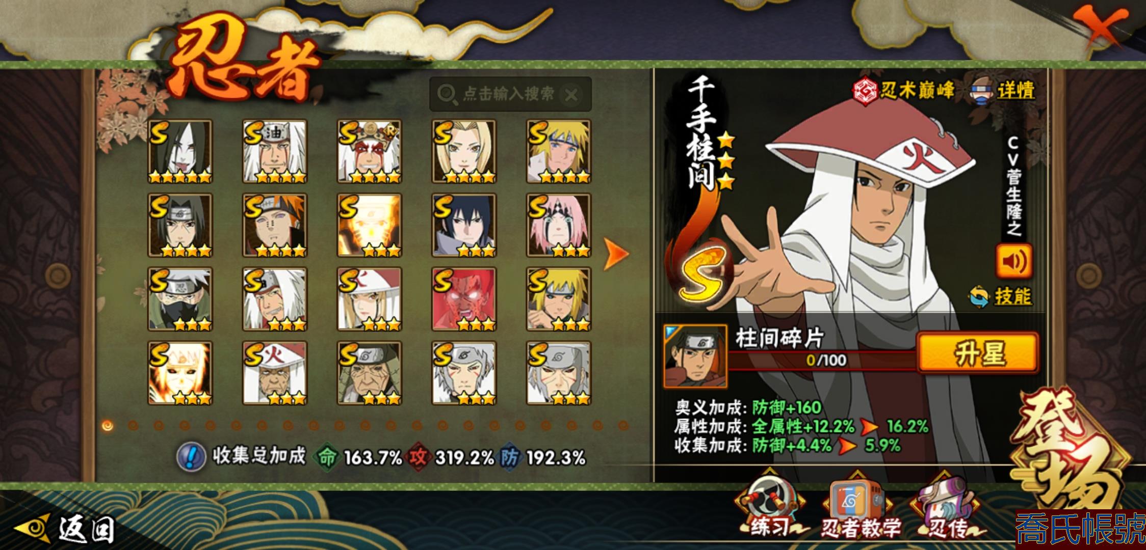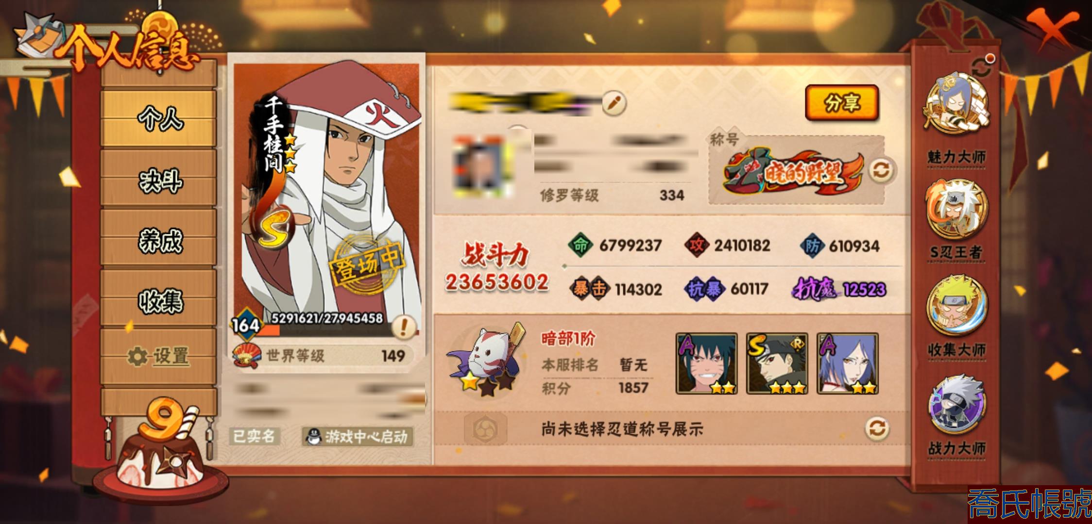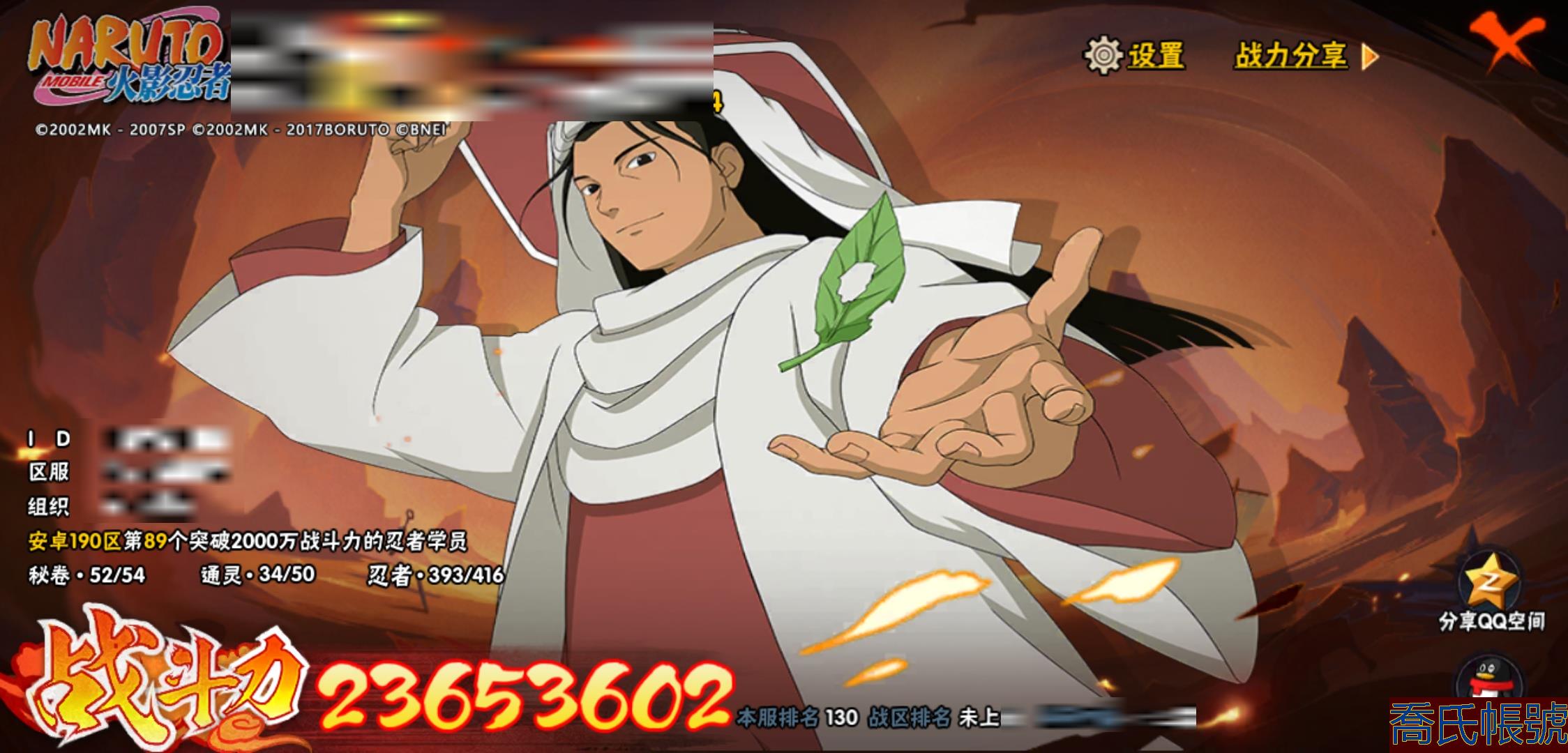 【OBHHVZH070142】戰鬥力:2365W+;段位:暗部1階;本服排名:130;戰區排名:未上榜;VIP15級;S忍47個;A忍95個;通靈獸34個;S忍:大蛇丸(5星),自來也(4星),舞之豪傑自來也(4星),綱手(4星),波風水門(4星),須佐能乎宇智波鼬(4星),天道佩恩(4星),九喇嘛連結漩渦鳴人,永恆萬花筒宇智波佐助,忍界大戰春野櫻,須佐能乎旗木卡卡西,傳說中的三忍自來也,百豪綱手,死門邁特凱,穢土轉生波風水門,九喇嘛連結波風水門,猿飛日斬,穢土轉生猿飛日斬,千手扉間,穢土轉生千手扉間,千手柱間,穢土轉生千手柱間,木葉創立千手柱間,穢土轉生宇智波斑,宇智波斑,木葉創立宇智波斑,穢土轉生解宇智波斑,穢土轉生宇智波鼬,須佐能乎宇智波止水,神秘面具男,白面具宇智波斑,忍界大戰宇智波帶土,紅夜之刃神秘面具男,二代目水影鬼燈幻月,四代目雷影艾,忍界大戰艾,三代目雷影艾,穢土轉生金角銀角,三代目土影大野木,穢土轉生半藏,二代目土影無,忍界大戰大野木,超佩恩天道,穢土轉生長門,仙人模式藥師兜,大筒木桃式,大筒木金式;A忍:邁特凱(5星),猿飛阿斯瑪(5星),蠍(5星),幹柿鬼鮫(5星),疾風傳我愛羅(4星),近松十人衛千代(4星),飛段(4星),死司憑血飛段(4星),須佐能乎宇智波佐助(3星),旗木卡卡西(3星),宇智波止水(3星),青年波風水門(3星),青年艾(3星),小南(3星),宇智波鼬(3星),迪達拉(3星),仙人模式漩渦鳴人,初始形態機械鳴人,忍者之路神秘面具男,九尾查克拉漩渦鳴人,萬花筒寫輪眼宇智波佐助,疾風傳咒印宇智波佐助,宇智波泉奈,百豪春野櫻,忍界大戰秋道丁次,忍界大戰日向寧次,忍界大戰李洛克,忍界大戰天天,最終章日向雛田,幻之真容旗木卡卡西,萬花筒寫輪眼旗木卡卡西,忍界大戰旗木卡卡西,元氣夏日旗木卡卡西,驚門邁特凱,忍界大戰邁特凱,穢土轉生猿飛阿斯瑪,七夕限定猿飛阿斯瑪,地陸,新春限定宇智波止水,志村團藏,火影繼承人猿飛日斬,三忍之師猿飛日斬,新春限定波風水門,忍界大戰我愛羅,新春限定我愛羅,忍界大戰勘九郎,夏日泳裝照美冥,五代目水影照美冥,俠隱江湖照美冥,穢土轉生桃地再不斬,漂泊武士桃地再不斬,桃地再不斬,奇拉比,忍界大戰奇拉比,達魯伊,青年三船,三船,妖怪奇譚綱手,漂泊武士千手扉間,半蛇斗篷藥師兜,不風,不緣,不動,青年長門,漂泊浪客佩恩六道,夏日泳裝小南,漂泊浪客小南,新春限定小南,絕,角都,曉創生角都,地怨虞角都,曉大蛇丸,緋流琥蠍,百機操演蠍,曉創生蠍,新春限定宇智波鼬,夏日限定宇智波鼬,鮫肌融合幹柿鬼鮫,穢土轉生迪達拉,新春限定迪達拉,阿飛,曉創生飛段,暴怒宇智波帶土,漂泊浪客宇智波帶土,加藤斷,俠隱江湖大野木,忍者大戰黃土,火之意志繼承者卑留呼,羈絆神農,猿飛木葉丸,桃式顯現漩渦博人,六代目水影長十郎,五代目雷影達魯伊,四代目土影黑土;通靈獸:忍犬,藍蛇,蛤蟆吉,忍龜,鐮鼬,蛞蝓,猿魔,山椒魚,蜃,蛤蟆仙人,鮫鯊,蛤蟆健,烏鴉,蛤蟆龍,熊貓,蛤蟆廣,砂之守鶴,二尾又旅,夢貘,鷹,怒鬼無臂,鵺,怒鬼,變色龍,六尾犀犬,蜘蛛,萬蛇,怒鬼爪,祥瑞金烏,守鶴,蛤蟆文太,烏鴉夏日限定,辛牙;時裝:百戰宇智波鼬須佐能乎,百戰波風水門,百戰佩恩天道,蜀面豪傑舞之豪傑自來也,百戰大蛇丸,狂野鮫鯊幹柿鬼鮫,桀驁之刃猿飛阿斯瑪,斑之附身神秘面具男忍者之路,滄瀾狂侍佩恩·六道漂泊浪客,龍吟浪客千手扉間漂泊武士,太極靈韻日向花火武當宗師,純白之心白,血霧怪人幹柿鬼鮫,初代目火影千手柱間,紅月映雪宇智波鼬新春限定,菁英忍者旗木卡卡西少年,憤怒的伊始宇智波帶土暴怒,龍的傳人李洛克截拳宗師,火之意志綱手百豪,熊貓少女天天峨眉宗師,睿勇新星千手扉間少年,夏日衝浪旗木卡卡西元氣夏日,風靈素錦猿飛未來,驚雷掠影達魯伊五代目雷影,萬炎焚空迪達拉新春限定,流沙騰龍我愛羅新春限定,土之固守大野木三代目土影,飛瀑流泉長十郎六代目水影,風之守護我愛羅忍界大戰,剎那的藝術迪達拉,雷電之力艾四代目雷影,隱藏內心的面具旗木卡卡西暗部,千雪霜華照美冥俠隱江湖,編織虛實宇智波鼬,神使之花小南新春限定,烈火華服宇智波止水新春限定,烈土霓裳黑土四代目土影,水之妖姬照美冥五代目水影,緋櫻綻放春野櫻百豪,智勇記者宇智波佐良娜,命定之戰宇智波佐助疾風傳;【190】393忍者準全忍 三個場景有妙木山 有紫狗648奧義,四星閻王
