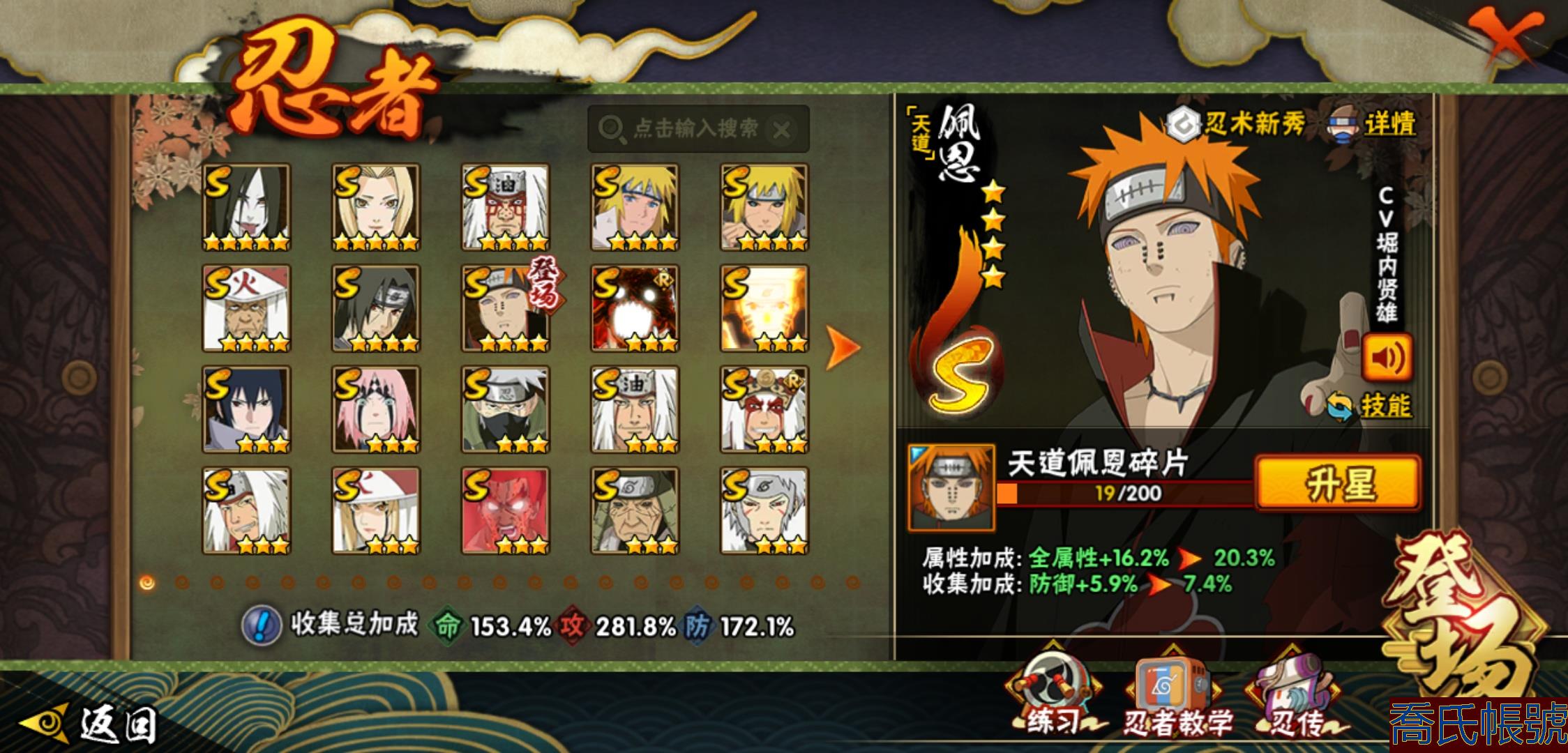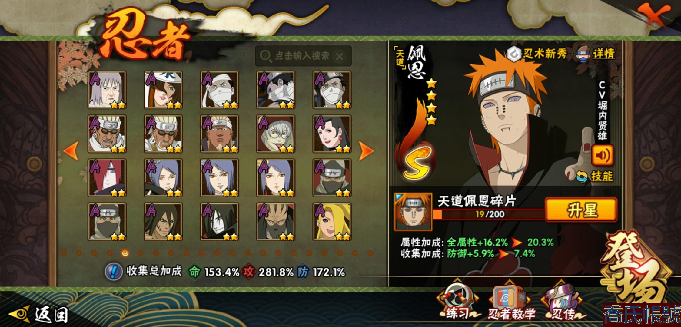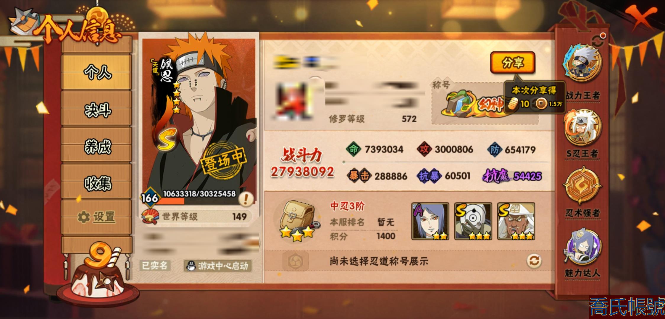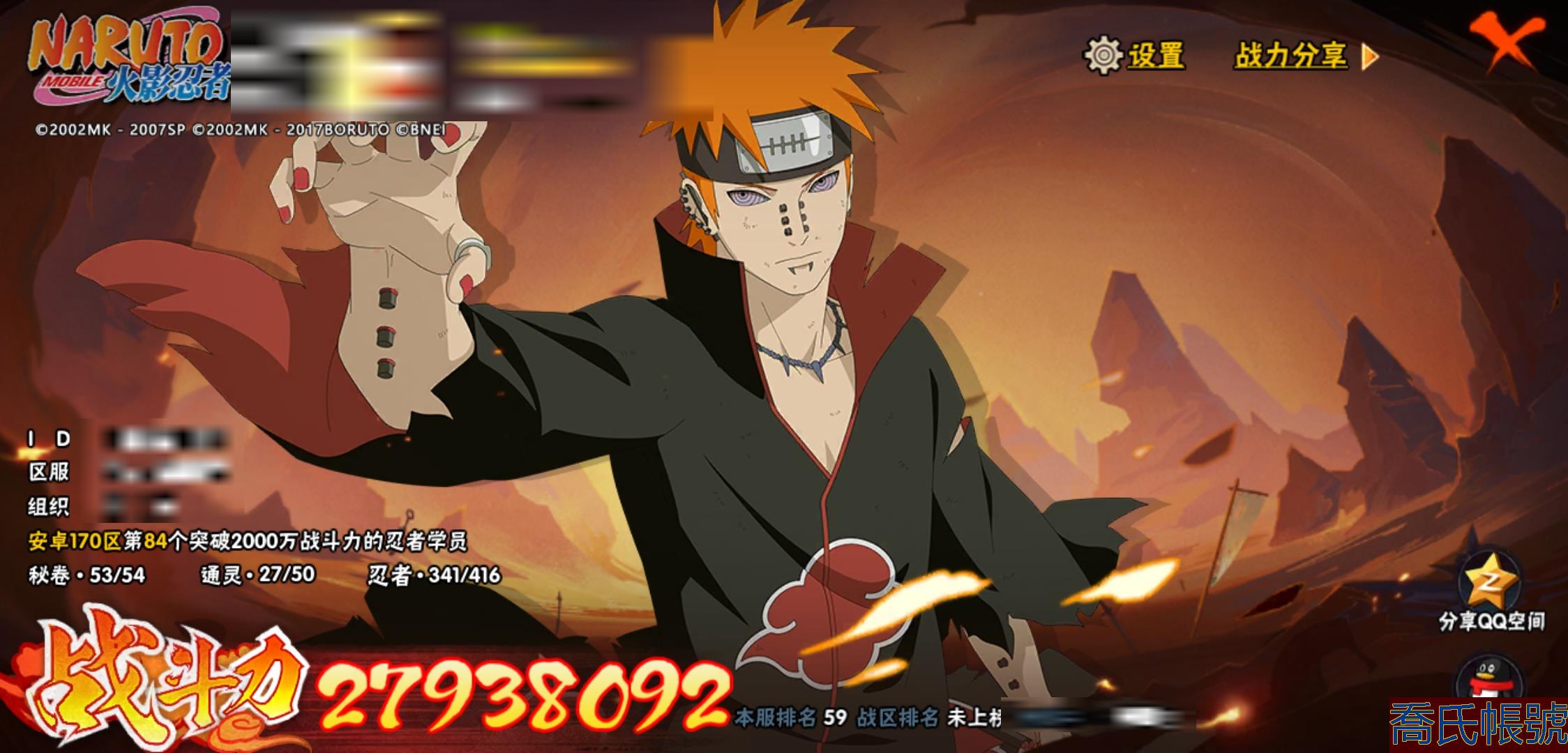 【OBHHVZH404842】戰鬥力:2793W+;段位:中忍3階;本服排名:59;戰區排名:未上榜;VIP13級;S忍51個;A忍56個;通靈獸27個;S忍:大蛇丸(5星),綱手(5星),仙人模式自來也(4星),波風水門(4星),穢土轉生波風水門(4星),猿飛日斬(4星),須佐能乎宇智波鼬(4星),天道佩恩(4星),暴怒第六尾漩渦鳴人,九喇嘛連結漩渦鳴人,永恆萬花筒宇智波佐助,忍界大戰春野櫻,須佐能乎旗木卡卡西,自來也,舞之豪傑自來也,傳說中的三忍自來也,百豪綱手,死門邁特凱,穢土轉生猿飛日斬,千手扉間,穢土轉生千手扉間,千手柱間,穢土轉生千手柱間,木葉創立千手柱間,宇智波斑,穢土轉生宇智波斑,木葉創立宇智波斑,穢土轉生解宇智波斑,穢土轉生宇智波鼬,須佐能乎宇智波止水,神秘面具男,白面具宇智波斑,忍界大戰宇智波帶土,紅夜之刃神秘面具男,四代目風影羅砂,穢土轉生三代目風影,二代目水影鬼燈幻月,四代目雷影艾,忍界大戰艾,三代目雷影艾,穢土轉生金角銀角,三代目土影大野木,二代目土影無,穢土轉生半藏,忍界大戰大野木,超佩恩天道,穢土轉生長門,仙人模式藥師兜,最終章大筒木舍人,大筒木桃式,大筒木金式;A忍:邁特凱(5星),猿飛阿斯瑪(5星),蠍(5星),幹柿鬼鮫(5星),疾風傳我愛羅(4星),飛段(4星),死司憑血飛段(4星),宇智波止水(3星),忍界大戰土臺(3星),宇智波鼬(3星),迪達拉(3星),猿飛木葉丸(3星),初始形態機械鳴人,仙人模式漩渦鳴人,九尾查克拉漩渦鳴人,萬花筒寫輪眼宇智波佐助,須佐能乎宇智波佐助,宇智波泉奈,百豪春野櫻,忍界大戰秋道丁次,忍界大戰日向寧次,忍界大戰李洛克,最終章日向雛田,萬花筒寫輪眼旗木卡卡西,穢土轉生猿飛阿斯瑪,志村團藏,新春限定波風水門,青年波風水門,忍界大戰我愛羅,近松十人衛千代,五代目水影照美冥,漂泊武士桃地再不斬,穢土轉生桃地再不斬,桃地再不斬,奇拉比,忍界大戰奇拉比,青年艾,半蛇斗篷藥師兜,不緣,青年長門,小南,夏日泳裝小南,新春限定小南,角都,地怨虞角都,曉大蛇丸,緋流琥蠍,穢土轉生迪達拉,加藤斷,俠隱江湖大野木,羈絆神農,桃式顯現漩渦博人,五代目雷影達魯伊,六代目水影長十郎,四代目土影黑土,夏日限定黑土;通靈獸:忍犬,藍蛇,蛤蟆吉,忍龜,鐮鼬,猿魔,山椒魚,蜃,蛤蟆仙人,鮫鯊,蛤蟆健,烏鴉,蛞蝓,蛤蟆龍,蛤蟆廣,砂之守鶴,夢貘,怒鬼,鷹,怒鬼無臂,蜘蛛,辛牙,熊貓,怒鬼爪,,萬蛇;時裝:百戰宇智波鼬須佐能乎,百戰波風水門,百戰大蛇丸,狂野鮫鯊幹柿鬼鮫,桀驁之刃猿飛阿斯瑪,百戰佩恩天道,蜀面豪傑舞之豪傑自來也,太極靈韻日向花火武當宗師,飛瀑流泉長十郎六代目水影,睿勇新星千手扉間少年,傳說的光芒波風水門,驚雷掠影達魯伊五代目雷影,命定之戰宇智波佐助疾風傳,可愛睡衣漩渦鳴人,隱藏內心的面具旗木卡卡西暗部,烈土霓裳黑土四代目土影,風之守護我愛羅忍界大戰,土之固守大野木三代目土影,緋櫻綻放春野櫻百豪,血紅辣椒旋渦玖辛奈少女png,雷電之力艾四代目雷影,血霧怪人幹柿鬼鮫,智勇記者宇智波佐良娜,熊貓少女天天峨眉宗師,驕陽翠羽照美冥夏日泳裝,純白之心白,剎那的藝術迪達拉,菁英忍者旗木卡卡西少年,龍的傳人李洛克截拳宗師,水之妖姬照美冥五代目水影,火之意志綱手百豪,編織虛實宇智波鼬;【170】51s 57a