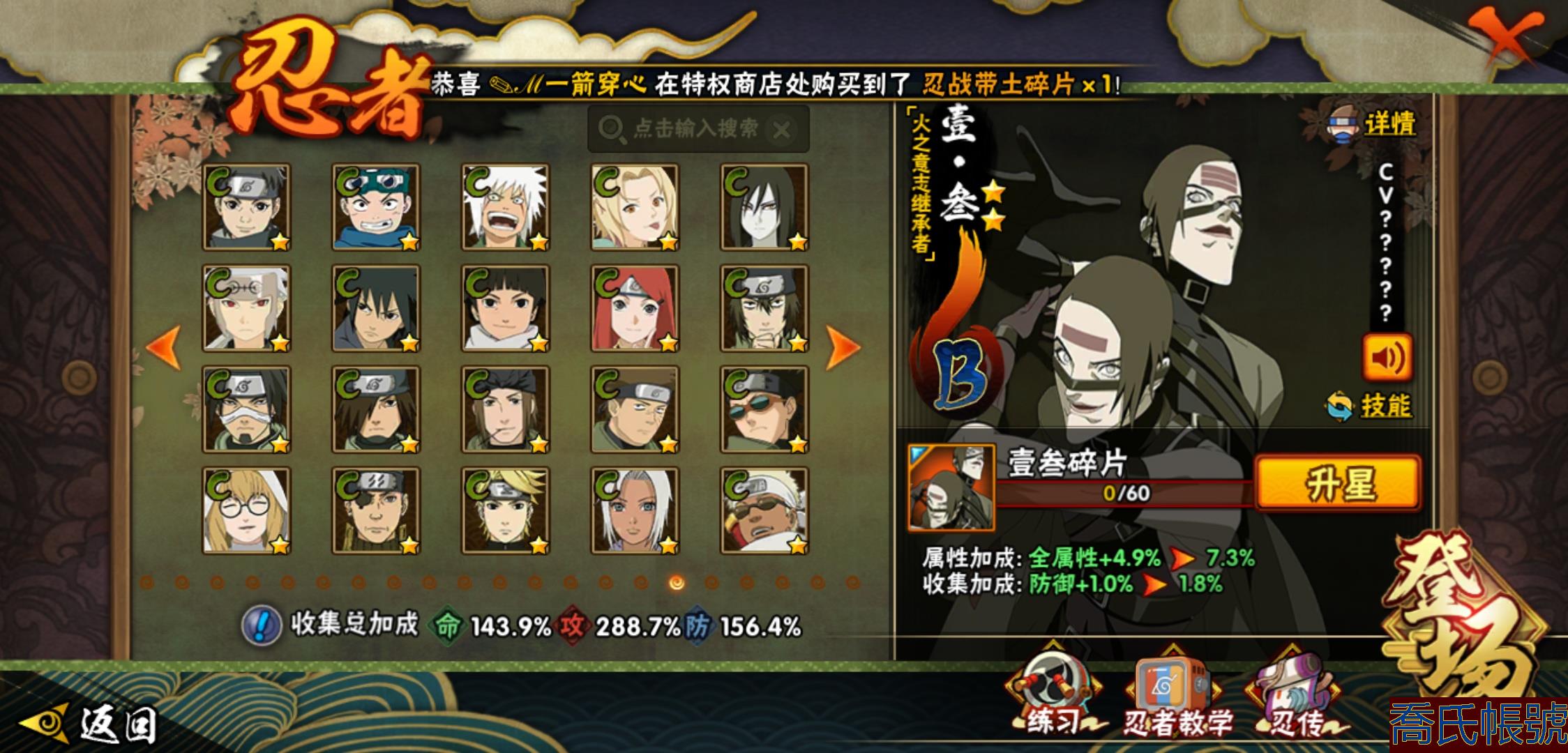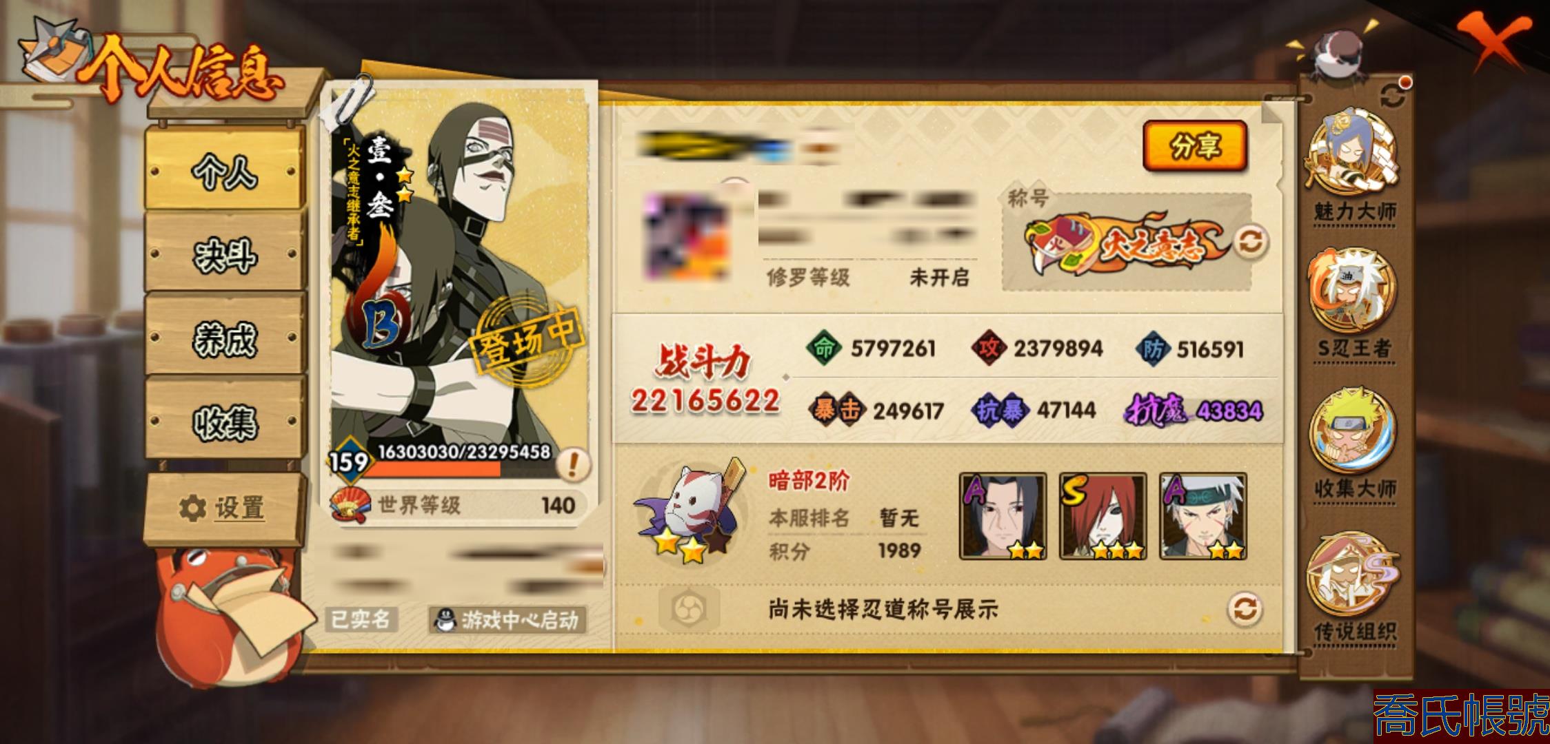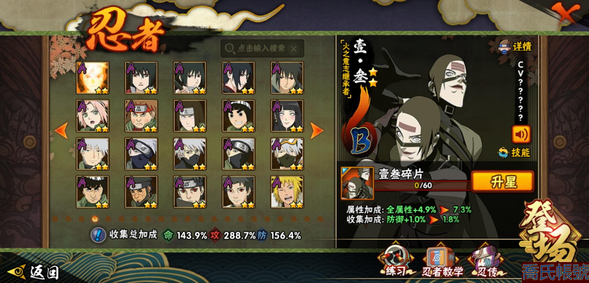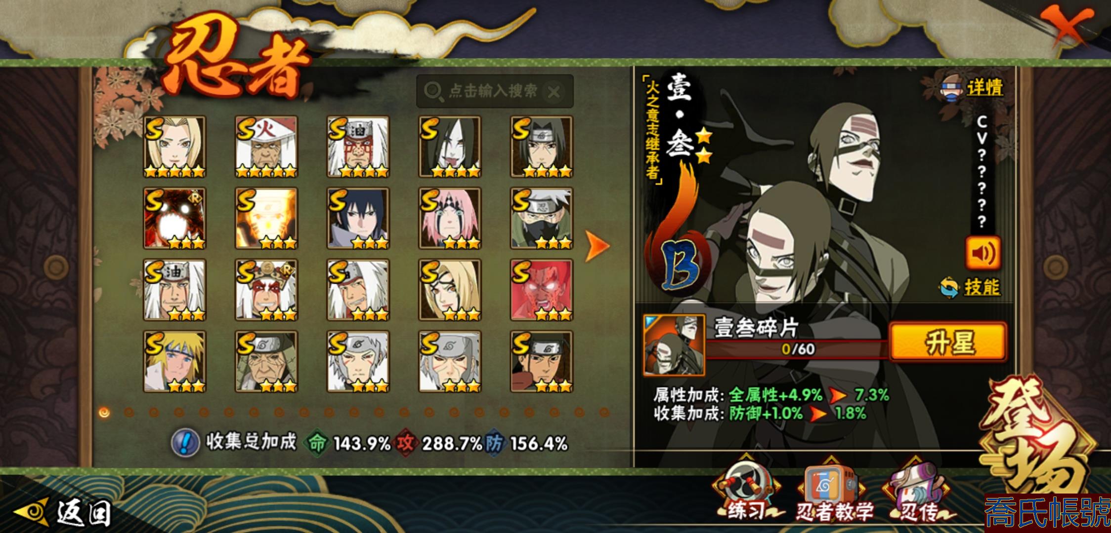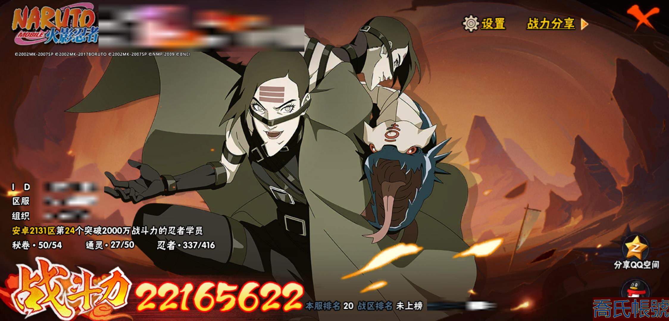 【OBHHVZH623942】戰鬥力:2216W+;段位:暗部2階;本服排名:20;戰區排名:未上榜;VIP14級;S忍49個;A忍80個;通靈獸27個;S忍:綱手(5星),猿飛日斬(5星),仙人模式自來也(4星),大蛇丸(4星),須佐能乎宇智波鼬(4星),暴怒第六尾漩渦鳴人,九喇嘛連結漩渦鳴人,永恆萬花筒宇智波佐助,忍界大戰春野櫻,須佐能乎旗木卡卡西,自來也,舞之豪傑自來也,傳說中的三忍自來也,百豪綱手,死門邁特凱,波風水門,穢土轉生猿飛日斬,千手扉間,穢土轉生千手扉間,千手柱間,穢土轉生千手柱間,木葉創立千手柱間,宇智波斑,穢土轉生宇智波斑,木葉創立宇智波斑,穢土轉生解宇智波斑,穢土轉生宇智波鼬,須佐能乎宇智波止水,神秘面具男,白面具宇智波斑,五影會談宇智波斑,忍界大戰宇智波帶土,紅夜之刃神秘面具男,四代目風影羅砂,初代目風影烈鬥,二代目水影鬼燈幻月,四代目雷影艾,忍界大戰艾,三代目雷影艾,三代目土影大野木,忍界大戰大野木,二代目土影無,天道佩恩,超佩恩天道,穢土轉生長門,仙人模式藥師兜,最終章大筒木舍人,大筒木桃式,大筒木金式;A忍:邁特凱(5星),猿飛阿斯瑪(5星),蠍(5星),幹柿鬼鮫(5星),疾風傳我愛羅(4星),飛段(4星),忍界大戰土臺(3星),四代目土影黑土(3星),仙人模式漩渦鳴人,忍者之路神秘面具男,初始形態機械鳴人,九尾查克拉漩渦鳴人,萬花筒寫輪眼宇智波佐助,須佐能乎宇智波佐助,俠隱江湖宇智波佐助,宇智波泉奈,百豪春野櫻,忍界大戰秋道丁次,忍界大戰日向寧次,忍界大戰李洛克,最終章日向雛田,幻之真容旗木卡卡西,旗木卡卡西,萬花筒寫輪眼旗木卡卡西,忍界大戰旗木卡卡西,元氣夏日旗木卡卡西,忍界大戰邁特凱,穢土轉生猿飛阿斯瑪,宇智波止水,新春限定宇智波止水,新春限定波風水門,青年波風水門,忍界大戰我愛羅,新春限定我愛羅,忍界大戰勘九郎,近松十人衛千代,五代目水影照美冥,夏日泳裝照美冥,俠隱江湖照美冥,桃地再不斬,漂泊武士桃地再不斬,穢土轉生桃地再不斬,忍界大戰奇拉比,奇拉比,青年艾,俠隱江湖綱手,漂泊武士千手扉間,半蛇斗篷藥師兜,俠隱江湖藥師兜,不風,不緣,不動,青年長門,漂泊浪客佩恩六道,小南,夏日泳裝小南,漂泊浪客小南,黑絕,地怨虞角都,穢土轉生角都,曉大蛇丸,新春限定大蛇丸,緋流琥蠍,宇智波鼬,新春限定宇智波鼬,夏日限定宇智波鼬,迪達拉,穢土轉生迪達拉,新春限定迪達拉,死司憑血飛段,惡靈之影飛段,暴怒宇智波帶土,漂泊浪客宇智波帶土,羈絆神農,猿飛木葉丸,五代目雷影達魯伊,桃式顯現漩渦博人,六代目水影長十郎,仙人模式巳月,夏日限定黑土;通靈獸:忍犬,藍蛇,蛤蟆吉,忍龜,鐮鼬,猿魔,山椒魚,蜃,砂之守鶴,蛤蟆仙人,鮫鯊,蛤蟆健,烏鴉,熊貓,怒鬼,二尾又旅,怒鬼無臂,蛤蟆龍,蛞蝓,蛤蟆廣,怒鬼爪,夢貘,鷹,辛牙,蜘蛛;時裝:百戰宇智波鼬須佐能乎,百戰波風水門,鋼鐵之軀邁特凱,百戰大蛇丸,狂野鮫鯊幹柿鬼鮫,桀驁之刃猿飛阿斯瑪,百戰佩恩天道,蜀面豪傑舞之豪傑自來也,晴浪礁歌黑土夏日限定,太極靈韻日向花火武當宗師,燼影絕蹤宇智波佐助俠隱江湖,剎寂鬼人桃地再不斬漂泊武士,滄瀾狂侍佩恩·六道漂泊浪客,飛瀑流泉長十郎六代目水影,睿勇新星千手扉間少年,傳說的光芒波風水門,驚雷掠影達魯伊五代目雷影,命定之戰宇智波佐助疾風傳,隱藏內心的面具旗木卡卡西暗部,烈土霓裳黑土四代目土影,夏日衝浪旗木卡卡西元氣夏日,風之守護我愛羅忍界大戰,憤怒的伊始宇智波帶土暴怒,土之固守大野木三代目土影,緋櫻綻放春野櫻百豪,千雪霜華照美冥俠隱江湖,血霧怪人幹柿鬼鮫,智勇記者宇智波佐良娜,熊貓少女天天峨眉宗師,剎那的藝術迪達拉,菁英忍者旗木卡卡西少年,龍的傳人李洛克截拳宗師,水之妖姬照美冥五代目水影,編織虛實宇智波鼬;【2131】