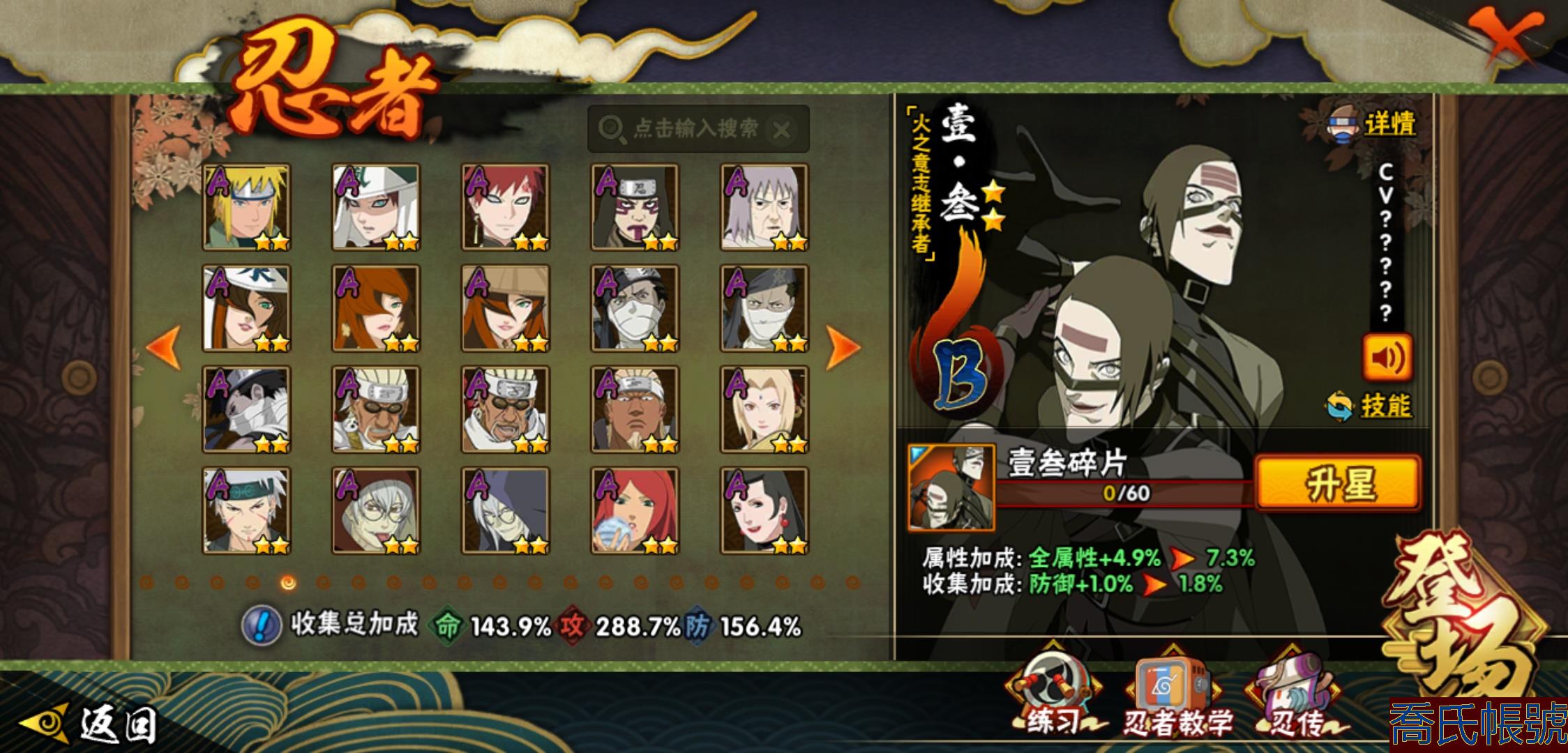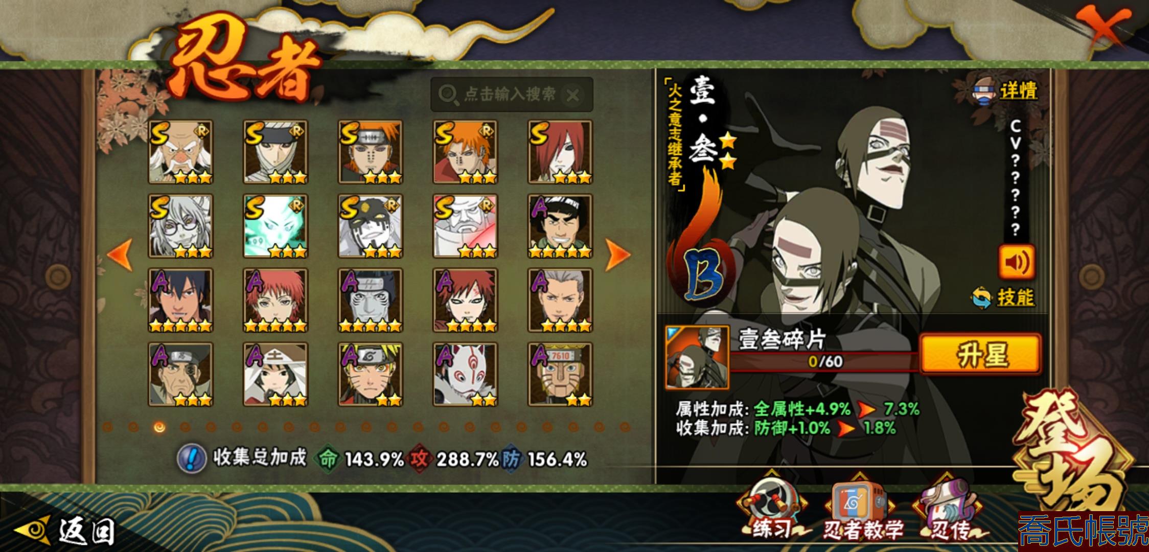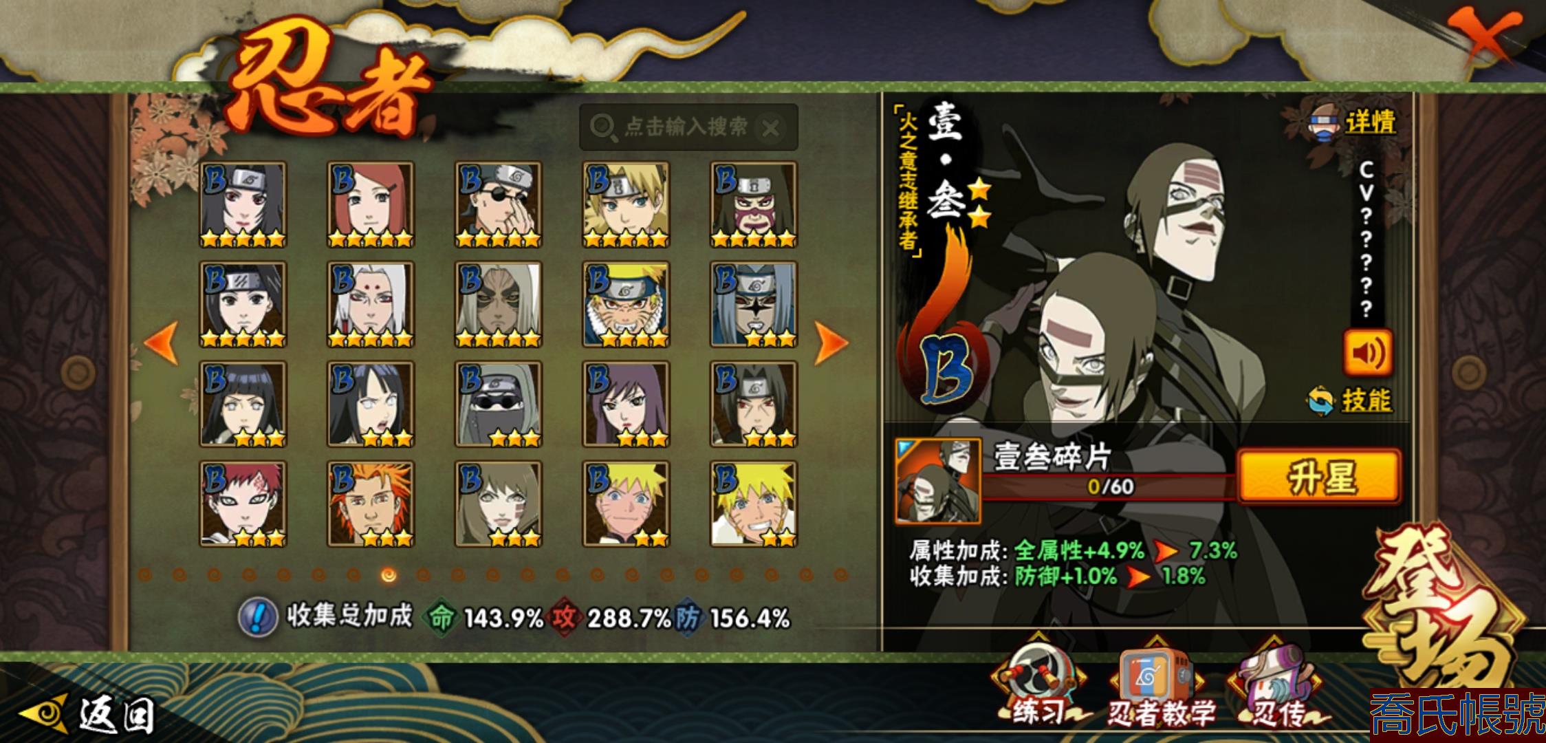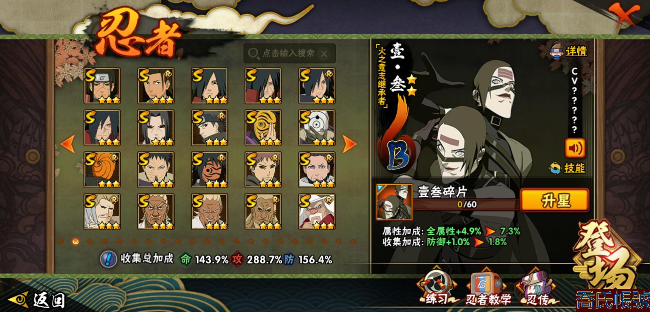 【OBHHVZH623942】戰鬥力:2216W+;段位:暗部2階;本服排名:20;戰區排名:未上榜;VIP14級;S忍49個;A忍80個;通靈獸27個;S忍:綱手(5星),猿飛日斬(5星),仙人模式自來也(4星),大蛇丸(4星),須佐能乎宇智波鼬(4星),暴怒第六尾漩渦鳴人,九喇嘛連結漩渦鳴人,永恆萬花筒宇智波佐助,忍界大戰春野櫻,須佐能乎旗木卡卡西,自來也,舞之豪傑自來也,傳說中的三忍自來也,百豪綱手,死門邁特凱,波風水門,穢土轉生猿飛日斬,千手扉間,穢土轉生千手扉間,千手柱間,穢土轉生千手柱間,木葉創立千手柱間,宇智波斑,穢土轉生宇智波斑,木葉創立宇智波斑,穢土轉生解宇智波斑,穢土轉生宇智波鼬,須佐能乎宇智波止水,神秘面具男,白面具宇智波斑,五影會談宇智波斑,忍界大戰宇智波帶土,紅夜之刃神秘面具男,四代目風影羅砂,初代目風影烈鬥,二代目水影鬼燈幻月,四代目雷影艾,忍界大戰艾,三代目雷影艾,三代目土影大野木,忍界大戰大野木,二代目土影無,天道佩恩,超佩恩天道,穢土轉生長門,仙人模式藥師兜,最終章大筒木舍人,大筒木桃式,大筒木金式;A忍:邁特凱(5星),猿飛阿斯瑪(5星),蠍(5星),幹柿鬼鮫(5星),疾風傳我愛羅(4星),飛段(4星),忍界大戰土臺(3星),四代目土影黑土(3星),仙人模式漩渦鳴人,忍者之路神秘面具男,初始形態機械鳴人,九尾查克拉漩渦鳴人,萬花筒寫輪眼宇智波佐助,須佐能乎宇智波佐助,俠隱江湖宇智波佐助,宇智波泉奈,百豪春野櫻,忍界大戰秋道丁次,忍界大戰日向寧次,忍界大戰李洛克,最終章日向雛田,幻之真容旗木卡卡西,旗木卡卡西,萬花筒寫輪眼旗木卡卡西,忍界大戰旗木卡卡西,元氣夏日旗木卡卡西,忍界大戰邁特凱,穢土轉生猿飛阿斯瑪,宇智波止水,新春限定宇智波止水,新春限定波風水門,青年波風水門,忍界大戰我愛羅,新春限定我愛羅,忍界大戰勘九郎,近松十人衛千代,五代目水影照美冥,夏日泳裝照美冥,俠隱江湖照美冥,桃地再不斬,漂泊武士桃地再不斬,穢土轉生桃地再不斬,忍界大戰奇拉比,奇拉比,青年艾,俠隱江湖綱手,漂泊武士千手扉間,半蛇斗篷藥師兜,俠隱江湖藥師兜,不風,不緣,不動,青年長門,漂泊浪客佩恩六道,小南,夏日泳裝小南,漂泊浪客小南,黑絕,地怨虞角都,穢土轉生角都,曉大蛇丸,新春限定大蛇丸,緋流琥蠍,宇智波鼬,新春限定宇智波鼬,夏日限定宇智波鼬,迪達拉,穢土轉生迪達拉,新春限定迪達拉,死司憑血飛段,惡靈之影飛段,暴怒宇智波帶土,漂泊浪客宇智波帶土,羈絆神農,猿飛木葉丸,五代目雷影達魯伊,桃式顯現漩渦博人,六代目水影長十郎,仙人模式巳月,夏日限定黑土;通靈獸:忍犬,藍蛇,蛤蟆吉,忍龜,鐮鼬,猿魔,山椒魚,蜃,砂之守鶴,蛤蟆仙人,鮫鯊,蛤蟆健,烏鴉,熊貓,怒鬼,二尾又旅,怒鬼無臂,蛤蟆龍,蛞蝓,蛤蟆廣,怒鬼爪,夢貘,鷹,辛牙,蜘蛛;時裝:百戰宇智波鼬須佐能乎,百戰波風水門,鋼鐵之軀邁特凱,百戰大蛇丸,狂野鮫鯊幹柿鬼鮫,桀驁之刃猿飛阿斯瑪,百戰佩恩天道,蜀面豪傑舞之豪傑自來也,晴浪礁歌黑土夏日限定,太極靈韻日向花火武當宗師,燼影絕蹤宇智波佐助俠隱江湖,剎寂鬼人桃地再不斬漂泊武士,滄瀾狂侍佩恩·六道漂泊浪客,飛瀑流泉長十郎六代目水影,睿勇新星千手扉間少年,傳說的光芒波風水門,驚雷掠影達魯伊五代目雷影,命定之戰宇智波佐助疾風傳,隱藏內心的面具旗木卡卡西暗部,烈土霓裳黑土四代目土影,夏日衝浪旗木卡卡西元氣夏日,風之守護我愛羅忍界大戰,憤怒的伊始宇智波帶土暴怒,土之固守大野木三代目土影,緋櫻綻放春野櫻百豪,千雪霜華照美冥俠隱江湖,血霧怪人幹柿鬼鮫,智勇記者宇智波佐良娜,熊貓少女天天峨眉宗師,剎那的藝術迪達拉,菁英忍者旗木卡卡西少年,龍的傳人李洛克截拳宗師,水之妖姬照美冥五代目水影,編織虛實宇智波鼬;【2131】