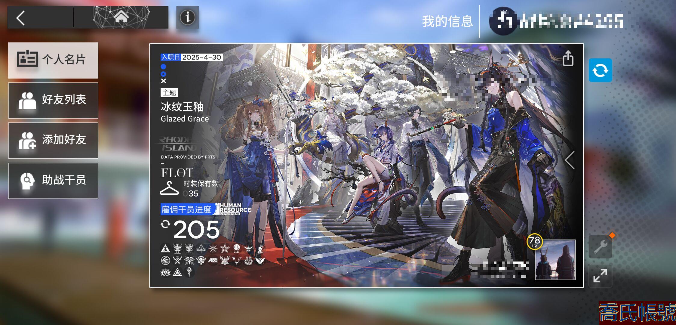 【OBMFICP610542】78級,34六星,21精二,3精一,合成玉數量:20330,源石數量:258,聯動幹員數量:5,時裝數量:35,精二六星:焰影葦草,酒神,新約能天使,仇白,塞雷婭,司霆驚蟄,塑心,聖聆初雪,遙,山,豐川祥子,史爾特爾,電弧,邏各斯,滌火傑西卡,斬業星熊,澄閃,瑪恩納,烏爾比安,凜御銀灰,伊內絲;精一六星:能天使,歌蕾蒂婭,斥罪;六星幹員:焰影葦草,酒神,新約能天使,仇白,塞雷婭,司霆驚蟄,塑心,聖聆初雪,遙,山,豐川祥子,史爾特爾,電弧,邏各斯,滌火傑西卡,斬業星熊,澄閃,瑪恩納,烏爾比安,凜御銀灰,伊內絲,能天使,歌蕾蒂婭,斥罪,弒君者,森蚺,魔王,溯光星源,流明,黑鍵,淬羽赫默,伺夜,鈴蘭,信仰攪拌機;聯動幹員:若葉睦,祐天寺若麥,三角初華,八幡海鈴,豐川祥子;時裝:超新星·維什戴爾,無我唯識·塑心,遠行前的野餐·純燼艾雅法拉,夏日餮宴·水月,糖果暴擊·奧達,家傳秘方·暴行,蒼茫怒號·瑪恩納,最初的頌歌·PhonoR-0,礫瓦·泥岩,相位面容·錫人,花房茶話會·澄閃,主修領域·地靈,悠然假日HD29·安比爾,繪聲繪影·深海色,喜夜侍者·澄閃,偽裝·宴,無痕行者·安德切爾,返航·歌蕾蒂婭,縱身一躍·傑克,安息處的怪盜·卡達,荒原行者·普羅旺斯,鐵律·塞雷婭,霜息·赫默,意志·德克薩斯,見習聯結者·阿米婭,幽靜·白麵鴞,未知的旅行·遠山,十字郡·芬,悠然假日HDm06·安賽爾;【官方賬號】