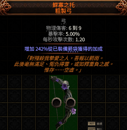 道具 【弓、冥使之琴】 冥使之琴 +3額外箭矢|鰥寡之托+箭袋加成|迷霧低語者+2連鎖|【初始拓荒】