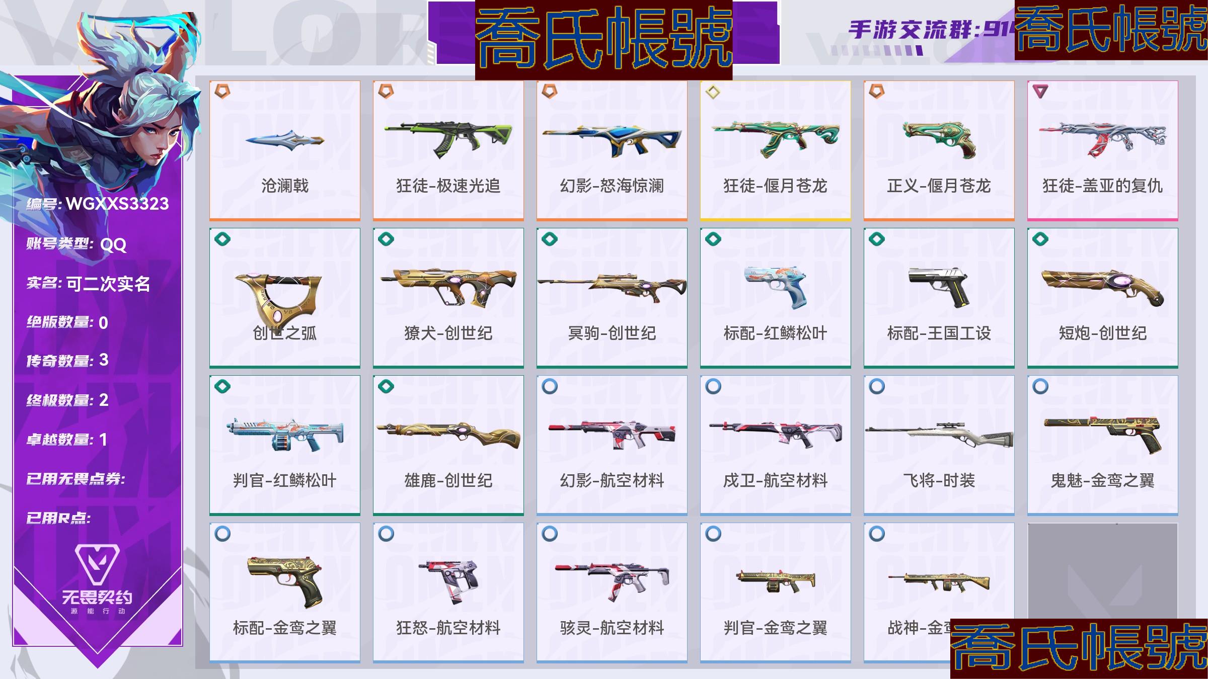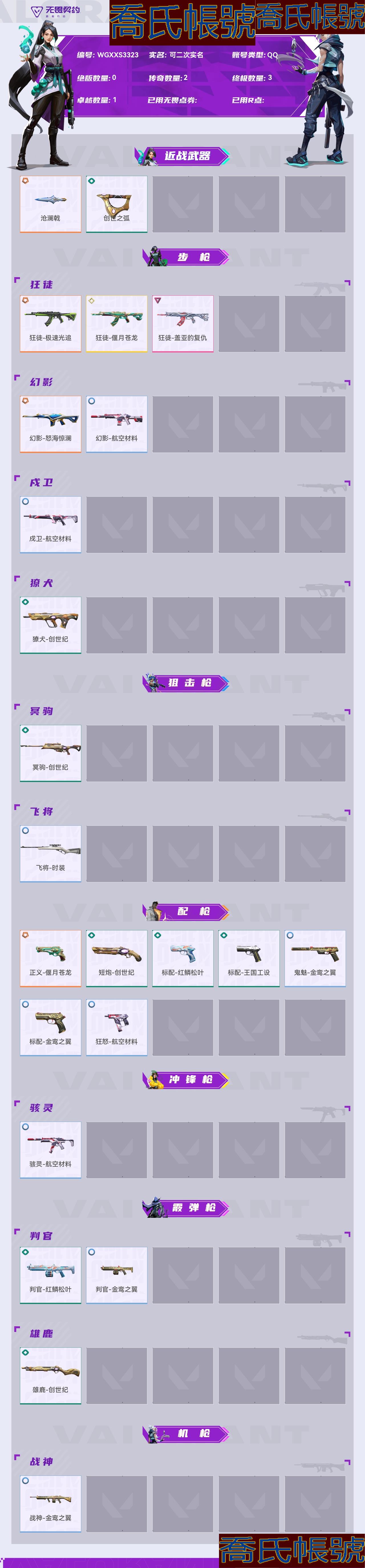 【OBWGXXS332342】Lv127|超凡III, 刀皮數量2,槍皮數量21(絕版0傳奇3終極2卓越1);【刀皮】:近戰武器-滄瀾戟,近戰武器-創世之弧; 【槍皮】:狂徒-極速光追,幻影-怒海驚瀾,狂徒-偃月蒼龍,正義-偃月蒼龍,狂徒-蓋亞的復仇,獠犬-創世紀,冥駒-創世紀,標配-紅鱗松葉,標配-王國工設,短炮-創世紀,判官-紅鱗松葉,雄鹿-創世紀,幻影-航空材料,戍衛-航空材料,飛將-時裝,鬼魅-金鸞之翼,標配-金鸞之翼,狂怒-航空材料,駭靈-航空材料,判官-金鸞之翼,戰神-金鸞之翼;【熱門卡面】:終章休息時間幽影卡面,火線卡面,KO對煉獄卡面,堆雪人卡面,勢不可擋蝰蛇卡面,創世紀卡面,賢者之淚卡面,金鸞之翼卡面,萬聖夜卡面,休息時間幽影卡面,尚勃勒工牌卡面,裂土之疆卡面,科迪亞鋼鐵卡面;【熱門掛飾】:終章燃燒垃圾箱掛飾,拍立得掛飾,歡樂之襪掛飾,海島假日掛飾,糖果手杖掛飾,創世紀掛飾,魔法小貓掛飾,燃燒垃圾箱掛飾,恐怖蜥蜴掛飾;【熱門噴漆】:倒計時開始噴漆,特雷弗明白了噴漆,調大音量噴漆,種草噴漆,金鸞之翼噴漆,禁止雄鹿噴漆,拿走我的錢噴漆,志願者噴漆,這就太不行了噴漆,飛天掃帚小貓噴漆,芮娜致意噴漆,燃起來了噴漆,甜糖麥芬噴漆,夜露思苦噴漆,食腐鳥噴漆;【皮膚可能含有某些特權皮膚,具體以遊戲內實際擁有為準】