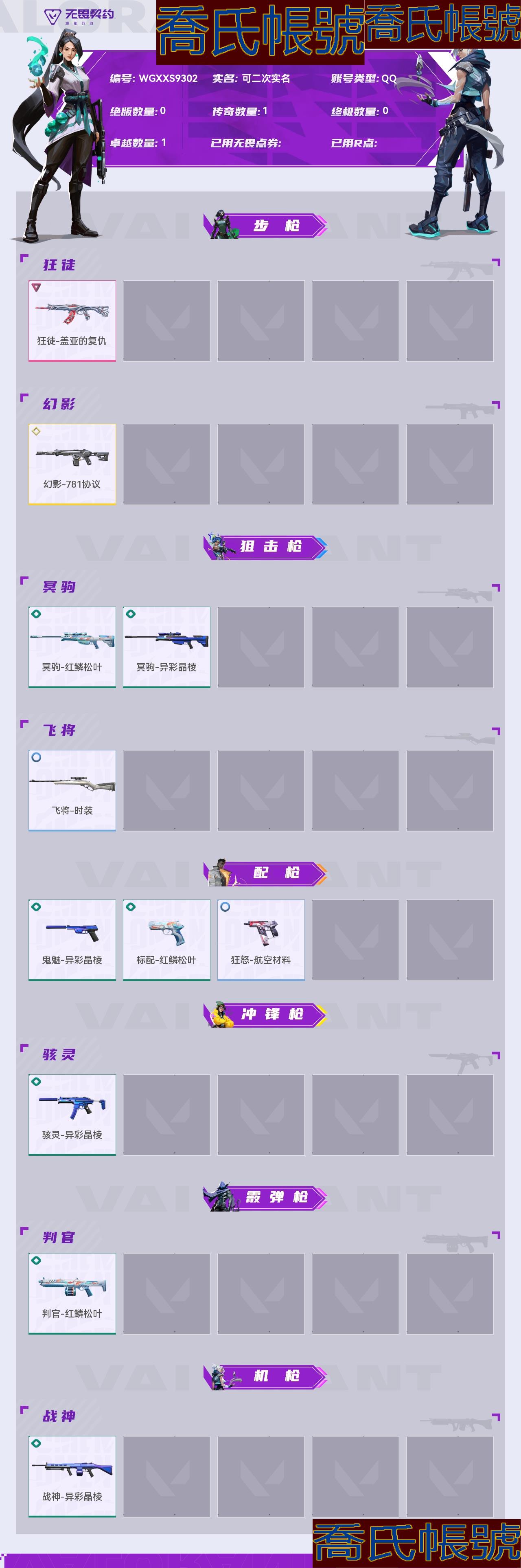 【OBWGXXS930242】Lv117|超凡II, 刀皮數量0,槍皮數量11(絕版0傳奇0終極1卓越1); 【槍皮】:幻影-781協議,狂徒-蓋亞的復仇,冥駒-紅鱗松葉,冥駒-異彩晶稜,鬼魅-異彩晶稜,標配-紅鱗松葉,駭靈-異彩晶稜,判官-紅鱗松葉,戰神-異彩晶稜,飛將-時裝,狂怒-航空材料;【熱門卡面】:終章休息時間幽影卡面,火線卡面,裂土之疆卡面,科迪亞鋼鐵卡面;【熱門掛飾】:終章燃燒垃圾箱掛飾,拍立得掛飾,雙面黑貓掛飾,糖果手杖掛飾,恐怖蜥蜴掛飾;【熱門噴漆】:種草噴漆,食腐鳥噴漆;【皮膚可能含有某些特權皮膚,具體以遊戲內實際擁有為準】