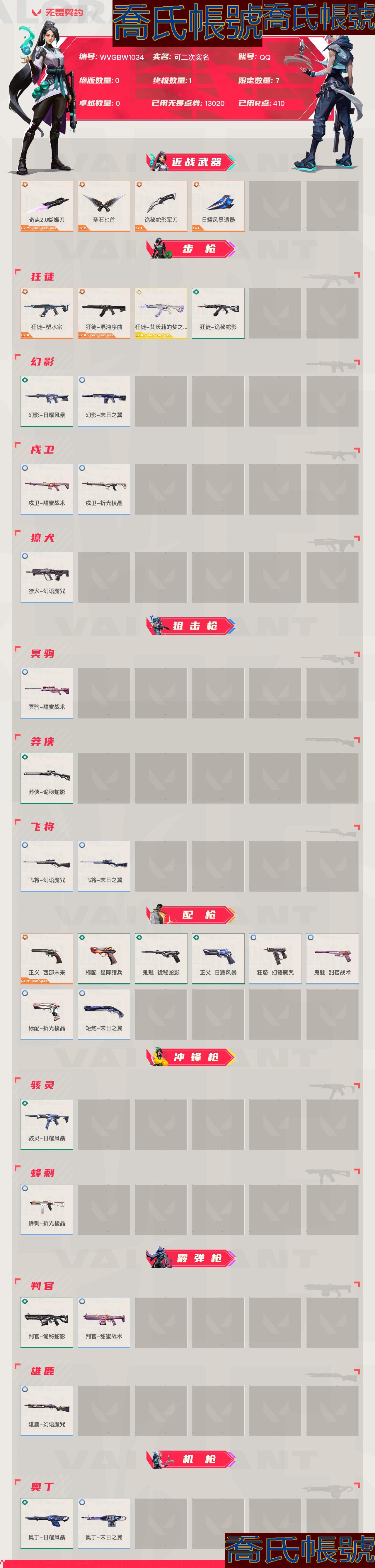 【OBWVGBW103442】Lv74|鉑金I, 刀皮數量4,槍皮數量28(絕版0限定7終極1卓越0);皮膚資產價值13020,已用R點410;【刀皮】:近戰武器-奇點2.0蝴蝶刀,近戰武器-聖石匕首,近戰武器-詭秘蛇影軍刀,近戰武器-日耀風暴遺器; 【槍皮】:正義-西部未來,狂徒-塑水宗,狂徒-混沌序曲,狂徒-艾沃莉的夢之翼,標配-星際獵兵,鬼魅-詭秘蛇影,判官-詭秘蛇影,狂徒-詭秘蛇影,莽俠-詭秘蛇影,幻影-日耀風暴,正義-日耀風暴,駭靈-日耀風暴,奧丁-日耀風暴,幻影-末日之翼,戍衛-甜蜜戰術,戍衛-折光稜晶,獠犬-幻語魔咒,冥駒-甜蜜戰術,飛將-幻語魔咒,飛將-末日之翼,鬼魅-甜蜜戰術,標配-折光稜晶,短炮-末日之翼,狂怒-幻語魔咒,蜂刺-折光稜晶,判官-甜蜜戰術,雄鹿-幻語魔咒,奧丁-末日之翼;【熱門掛飾】:神中神掛飾;【熱門噴漆】:買裝還是存錢噴漆,捷風跳PEEK噴漆;【皮膚可能含有某些特權皮膚,具體以遊戲內實際擁有為準】