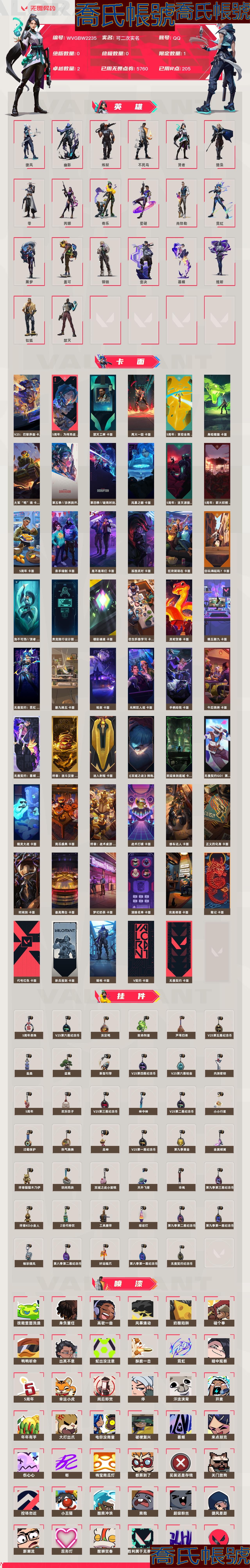 【OBWVGBW223542】Lv104|鉑金II, 刀皮數量1,槍皮數量7(絕版0限定1終極0卓越2);皮膚資產價值5760,已用R點205;【刀皮】:近戰武器-威龍之刃; 【槍皮】:狂徒-蓋亞的復仇,戍衛-天界神兵,狂怒-火線,正義-超限快閃記憶體,正義-奈米打擊,鬼魅-星雲暗湧,鬼魅-撲稜撲稜;【熱門卡面】:勢不可擋賢者卡面,雙城之戰擁抱卡面;【熱門掛飾】:神中神掛飾,金屬蝶翼掛飾,雙城之戰小蛋糕掛飾,終章KO小金人掛飾,袖珍捷風掛飾;【熱門噴漆】:開麥噴漆,電你沒商量噴漆,來點朋克噴漆,買裝還是存錢噴漆,小丑貓噴漆,醒獅賀春噴漆;【皮膚可能含有某些特權皮膚,具體以遊戲內實際擁有為準】自己的一手號