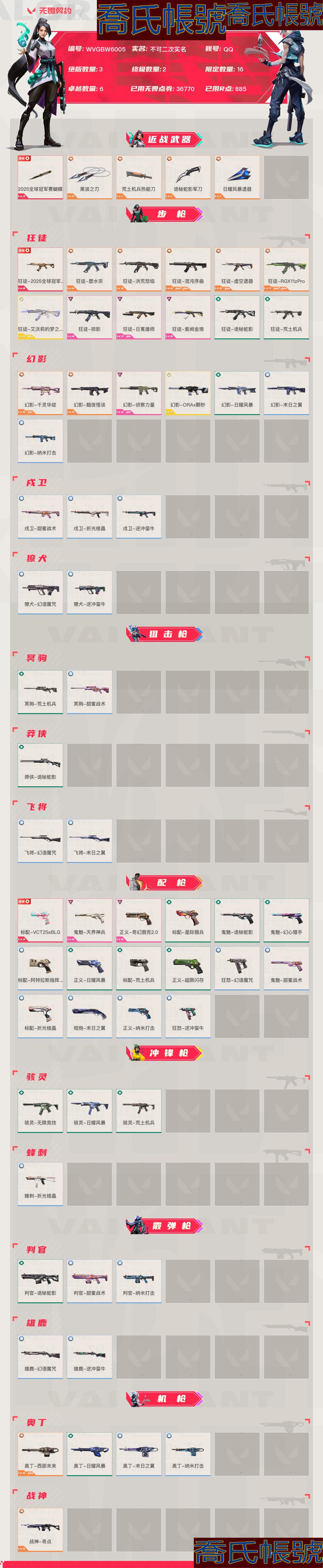 【OBWVGBW600542】Lv170|鑽石II, 刀皮數量5,槍皮數量59(絕版3限定16終極2卓越6);皮膚資產價值36770,已用R點885;【刀皮】:近戰武器-2025全球冠軍賽蝴蝶刀,近戰武器-黑波之刃,近戰武器-荒土機兵熱能刀,近戰武器-詭秘蛇影軍刀,近戰武器-日耀風暴遺器; 【槍皮】:標配-VCT25xBLG,狂徒-2025全球冠軍賽,狂徒-塑水宗,狂徒-洪荒怒焰,狂徒-混沌序曲,狂徒-虛空遺器,狂徒-RGX11zPro,幻影-千靈華綻,幻影-黯夜怪談,奧丁-西部未來,戰神-奇點,狂徒-艾沃莉的夢之翼,鬼魅-天界神兵,正義-奇幻朋克2.0,狂徒-掠影,狂徒-日冕雄師,狂徒-紫闕金琅,幻影-偵察力量,標配-星際獵兵,鬼魅-詭秘蛇影,駭靈-無限競技,判官-詭秘蛇影,狂徒-詭秘蛇影,莽俠-詭秘蛇影,幻影-ORAx顆秒,狂徒-荒土機兵,幻影-日耀風暴,冥駒-荒土機兵,正義-日耀風暴,正義-超限快閃記憶體,鬼魅-幻心獵手,標配-阿特拉斯指揮部,標配-荒土機兵,駭靈-日耀風暴,駭靈-荒土機兵,奧丁-日耀風暴,幻影-末日之翼,幻影-奈米打擊,戍衛-甜蜜戰術,戍衛-折光稜晶,戍衛-逆衝蠻牛,獠犬-幻語魔咒,獠犬-逆衝蠻牛,冥駒-甜蜜戰術,飛將-幻語魔咒,飛將-末日之翼,正義-奈米打擊,鬼魅-甜蜜戰術,標配-折光稜晶,短炮-末日之翼,狂怒-幻語魔咒,狂怒-逆衝蠻牛,蜂刺-折光稜晶,判官-甜蜜戰術,判官-奈米打擊,雄鹿-幻語魔咒,雄鹿-逆衝蠻牛,奧丁-末日之翼,奧丁-奈米打擊;【熱門卡面】:VCT25xBLG卡面,萬聖夜卡面,分崩離析卡面,雙城之戰擁抱卡面,雙城之戰金克絲卡面;【熱門掛飾】:神中神掛飾,VCTxBLG掛飾,雙城之戰小蛋糕掛飾,終章KO小金人掛飾,蓄勢待滾掛飾;【熱門噴漆】:幽影貓貓舞噴漆,捷風跳PEEK噴漆,VCTxBLG噴漆,比心噴漆,買裝還是存錢噴漆,鼻尖上的蝴蝶噴漆,小丑貓噴漆;【皮膚可能含有某些特權皮膚,具體以遊戲內實際擁有為準】有黑波之刃,顯示卡ak,25冠軍套,上班沒時間玩了賣掉