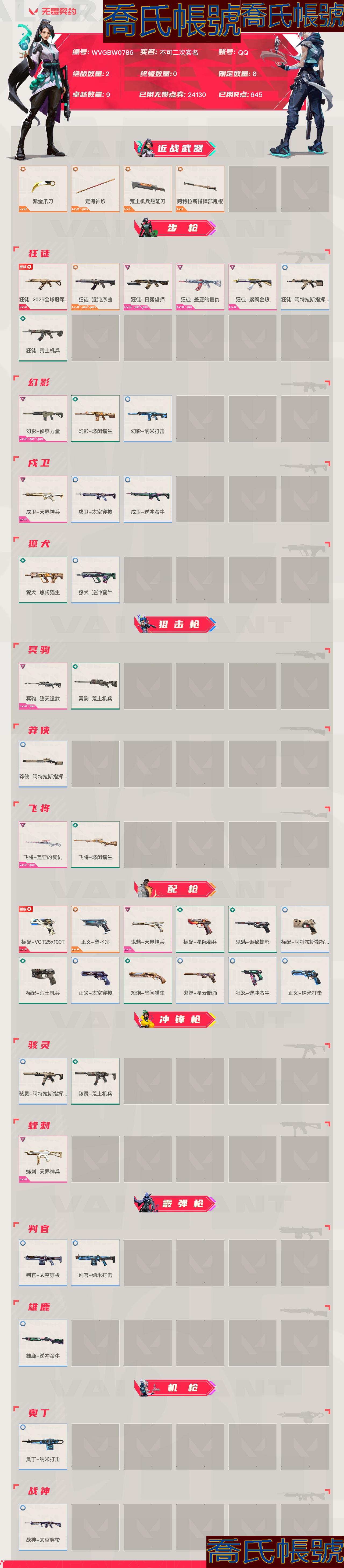 【OBWVGBW078642】Lv106|未定級, 刀皮數量4,槍皮數量40(絕版2限定8終極0卓越9);皮膚資產價值24130,已用R點645;【刀皮】:近戰武器-紫金爪刀,近戰武器-定海神珍,近戰武器-荒土機兵熱能刀,近戰武器-阿特拉斯指揮部甩棍; 【槍皮】:標配-VCT25x100T,狂徒-2025全球冠軍賽,正義-塑水宗,狂徒-混沌序曲,鬼魅-天界神兵,蜂刺-天界神兵,狂徒-日冕雄師,狂徒-蓋亞的復仇,狂徒-紫闕金琅,幻影-偵察力量,戍衛-天界神兵,冥駒-墮天遺武,飛將-蓋亞的復仇,標配-星際獵兵,鬼魅-詭秘蛇影,狂徒-阿特拉斯指揮部,狂徒-荒土機兵,冥駒-荒土機兵,莽俠-阿特拉斯指揮部,標配-阿特拉斯指揮部,標配-荒土機兵,駭靈-阿特拉斯指揮部,駭靈-荒土機兵,幻影-悠閒貓生,幻影-奈米打擊,戍衛-太空穿梭,戍衛-逆衝蠻牛,獠犬-悠閒貓生,獠犬-逆衝蠻牛,飛將-悠閒貓生,正義-太空穿梭,正義-奈米打擊,鬼魅-星雲暗湧,短炮-悠閒貓生,狂怒-逆衝蠻牛,判官-太空穿梭,判官-奈米打擊,雄鹿-逆衝蠻牛,奧丁-奈米打擊,戰神-太空穿梭;【熱門卡面】:VCT25x100T卡面,雙城之戰金克絲卡面,分崩離析卡面,雙城之戰姐妹卡面,雙城之戰擁抱卡面;【熱門掛飾】:VCTx100T掛飾,神中神掛飾,第九季超凡掛飾,雙城之戰小蛋糕掛飾,雙城之戰魄羅掛飾,冬日絮語掛飾;【熱門噴漆】:VCTx100T噴漆,鼻尖上的蝴蝶噴漆,買裝還是存錢噴漆;【皮膚可能含有某些特權皮膚,具體以遊戲內實際擁有為準】