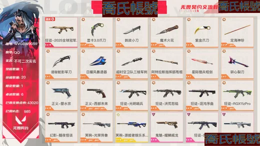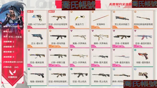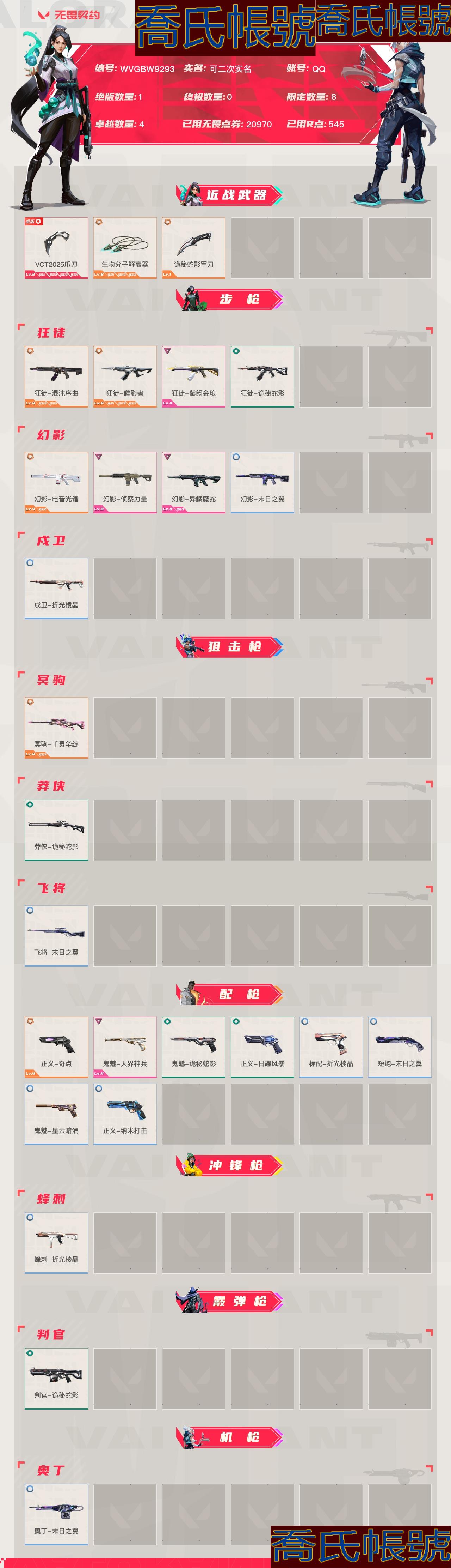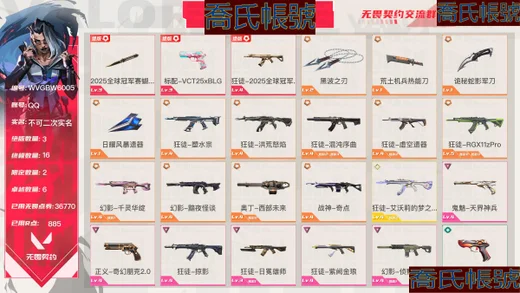 【OBWVGBW929342】Lv144|黃金II, 刀皮數量3,槍皮數量23(絕版1限定8終極0卓越4);皮膚資產價值20970,已用R點545;【刀皮】:近戰武器-VCT2025爪刀,近戰武器-生物分子解離器,近戰武器-詭秘蛇影軍刀; 【槍皮】:正義-奇點,狂徒-混沌序曲,狂徒-噬影者,幻影-電音光譜,冥駒-千靈華綻,鬼魅-天界神兵,狂徒-紫闕金琅,幻影-偵察力量,幻影-異鱗魔蛇,鬼魅-詭秘蛇影,判官-詭秘蛇影,狂徒-詭秘蛇影,莽俠-詭秘蛇影,正義-日耀風暴,幻影-末日之翼,戍衛-折光稜晶,飛將-末日之翼,正義-奈米打擊,鬼魅-星雲暗湧,標配-折光稜晶,短炮-末日之翼,蜂刺-折光稜晶,奧丁-末日之翼;【熱門卡面】:雙城之戰金克絲卡面,超能偶像卡面,VCT2025CN聯賽卡面,VCT2025太平洋聯賽卡面,VCT2025美洲聯賽卡面,VCT2025EMEA聯賽卡面;【熱門掛飾】:雙城之戰魄羅掛飾,神中神掛飾,VCT2025CN聯賽掛飾,VCT2025太平洋聯賽掛飾,VCT2025EMEA聯賽掛飾,VCT2025美洲聯賽掛飾;【熱門噴漆】:燥起來噴漆,紅牌退場噴漆,一切安好噴漆,無人之境噴漆,電音光譜噴漆,福星高照噴漆,買裝還是存錢噴漆;【皮膚可能含有某些特權皮膚,具體以遊戲內實際擁有為準】