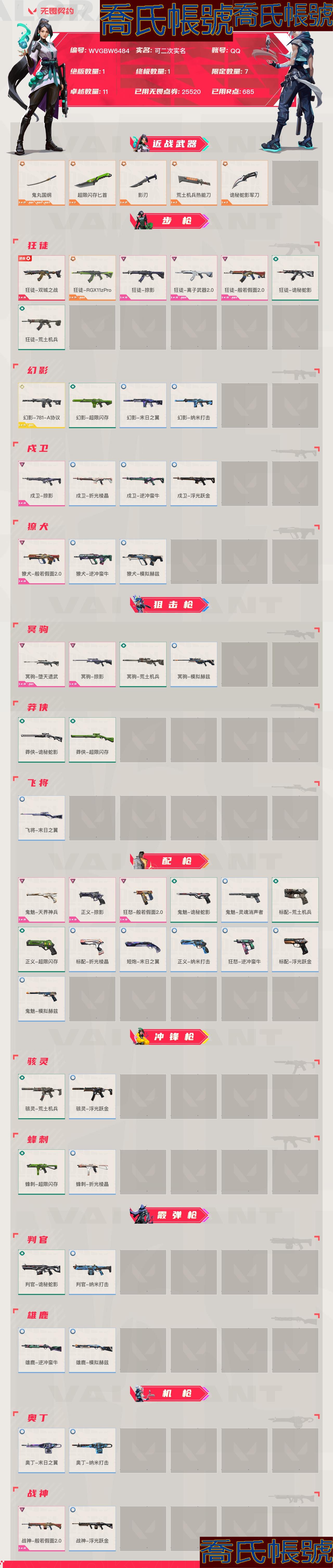 【OBWVGBW648442】Lv94|鑽石III, 刀皮數量5,槍皮數量50(絕版1限定7終極1卓越11);皮膚資產價值25520,已用R點685;【刀皮】:近戰武器-鬼丸國綱,近戰武器-超限快閃記憶體匕首,近戰武器-影刃,近戰武器-荒土機兵熱能刀,近戰武器-詭秘蛇影軍刀; 【槍皮】:狂徒-雙城之戰,狂徒-RGX11zPro,幻影-781-A協議,鬼魅-天界神兵,正義-掠影,狂怒-般若假面2.0,狂徒-掠影,狂徒-離子武器2.0,狂徒-般若假面2.0,戍衛-掠影,獠犬-般若假面2.0,冥駒-墮天遺武,冥駒-掠影,戰神-般若假面2.0,鬼魅-詭秘蛇影,判官-詭秘蛇影,狂徒-詭秘蛇影,莽俠-詭秘蛇影,鬼魅-靈魂消聲者,狂徒-荒土機兵,幻影-超限快閃記憶體,冥駒-荒土機兵,莽俠-超限快閃記憶體,正義-超限快閃記憶體,標配-荒土機兵,駭靈-荒土機兵,蜂刺-超限快閃記憶體,幻影-末日之翼,幻影-奈米打擊,戍衛-折光稜晶,戍衛-逆衝蠻牛,戍衛-浮光躍金,獠犬-逆衝蠻牛,獠犬-模擬赫茲,冥駒-模擬赫茲,飛將-末日之翼,正義-奈米打擊,鬼魅-模擬赫茲,標配-折光稜晶,標配-浮光躍金,短炮-末日之翼,狂怒-逆衝蠻牛,駭靈-浮光躍金,蜂刺-折光稜晶,判官-奈米打擊,雄鹿-逆衝蠻牛,雄鹿-模擬赫茲,奧丁-末日之翼,奧丁-奈米打擊,戰神-浮光躍金;【熱門卡面】:分崩離析卡面,雙城之戰擁抱卡面;【熱門掛飾】:V25第六幕神話掛飾,神中神掛飾,第九季超凡掛飾,雙城之戰小蛋糕掛飾,終章KO小金人掛飾,袖珍捷風掛飾,傳世蓮華掛飾;【熱門噴漆】:鼻尖上的蝴蝶噴漆,掠影噴漆,讓我進去噴漆,皮蛋呼呼噴漆,小丑貓噴漆,買裝還是存錢噴漆,雙擊點贊噴漆,醒獅賀春噴漆;【皮膚可能含有某些特權皮膚,具體以遊戲內實際擁有為準】
