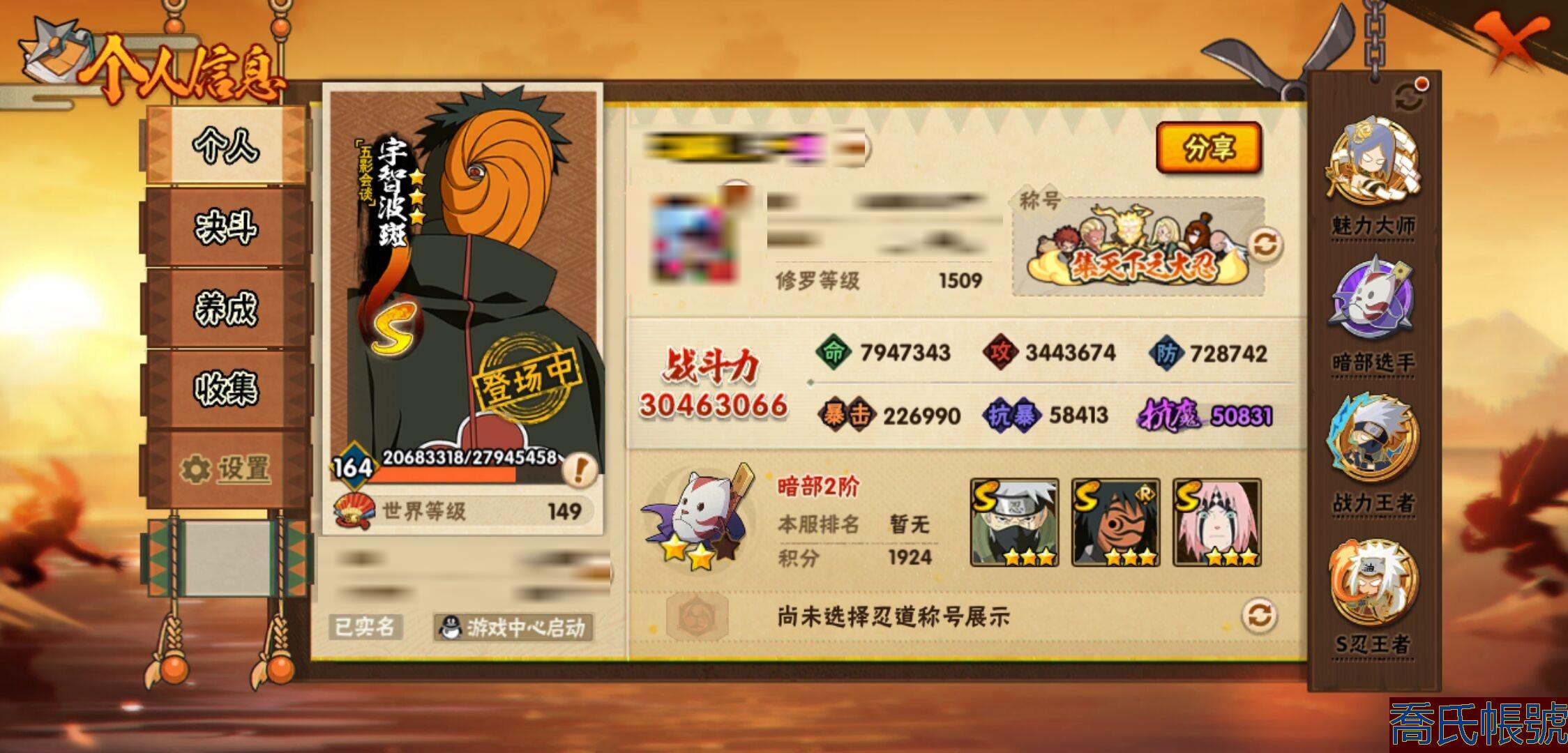 【OBHQTMS097442】戰鬥力:3046W+;段位:暗部2階;本服排名:18;戰區排名:未上榜;VIP15級;S忍54個;A忍104個;通靈獸33個;S忍:仙人模式自來也(5星),大蛇丸(5星),綱手(5星),猿飛日斬(5星),須佐能乎宇智波鼬(5星),自來也(4星),舞之豪傑自來也(4星),死門邁特凱(4星),波風水門(4星),穢土轉生千手柱間(4星),穢土轉生解宇智波斑(4星),天道佩恩(4星),暴怒第六尾漩渦鳴人,九喇嘛連結漩渦鳴人,永恆萬花筒宇智波佐助,忍界大戰春野櫻,須佐能乎旗木卡卡西,傳說中的三忍自來也,百豪綱手,九喇嘛連結波風水門,穢土轉生波風水門,穢土轉生猿飛日斬,穢土轉生千手扉間,千手扉間,千手柱間,木葉創立千手柱間,穢土轉生宇智波斑,宇智波斑,木葉創立宇智波斑,穢土轉生宇智波鼬,須佐能乎宇智波止水,神秘面具男,五影會談宇智波斑,白面具宇智波斑,忍界大戰宇智波帶土,紅夜之刃神秘面具男,四代目風影羅砂,穢土轉生三代目風影,初代目風影烈鬥,二代目水影鬼燈幻月,四代目雷影艾,忍界大戰艾,三代目雷影艾,穢土轉生金角銀角,三代目土影大野木,穢土轉生半藏,二代目土影無,忍界大戰大野木,超佩恩天道,穢土轉生長門,仙人模式藥師兜,最終章大筒木舍人,大筒木桃式,大筒木金式;A忍:邁特凱(5星),猿飛阿斯瑪(5星),疾風傳我愛羅(5星),蠍(5星),幹柿鬼鮫(5星),飛段(5星),死司憑血飛段(5星),旗木卡卡西(4星),五代目水影照美冥(4星),仙人模式漩渦鳴人(3星),須佐能乎宇智波佐助(3星),百豪春野櫻(3星),忍界大戰秋道丁次(3星),忍界大戰日向寧次(3星),宇智波止水(3星),青年波風水門(3星),青年艾(3星),忍界大戰土臺(3星),青年長門(3星),小南(3星),宇智波鼬(3星),迪達拉(3星),六代目水影長十郎(3星),五代目雷影達魯伊(3星),四代目土影黑土(3星),初始形態機械鳴人,忍者之路神秘面具男,九尾查克拉漩渦鳴人,萬花筒寫輪眼宇智波佐助,疾風傳咒印宇智波佐助,俠隱江湖宇智波佐助,宇智波泉奈,忍界大戰李洛克,忍界大戰天天,最終章日向雛田,幻之真容旗木卡卡西,萬花筒寫輪眼旗木卡卡西,忍界大戰旗木卡卡西,元氣夏日旗木卡卡西,驚門邁特凱,忍界大戰邁特凱,青春爆炸邁特凱,穢土轉生猿飛阿斯瑪,七夕限定猿飛阿斯瑪,地陸,新春限定宇智波止水,志村團藏,火影繼承人猿飛日斬,新春限定波風水門,忍界大戰我愛羅,新春限定我愛羅,忍界大戰勘九郎,近松十人衛千代,夏日泳裝照美冥,俠隱江湖照美冥,穢土轉生桃地再不斬,漂泊武士桃地再不斬,桃地再不斬,奇拉比,忍界大戰奇拉比,達魯伊,青年三船,三船,俠隱江湖綱手,妖怪奇譚綱手,漂泊武士千手扉間,俠隱江湖藥師兜,半蛇斗篷藥師兜,不風,不緣,不動,漂泊浪客佩恩六道,夏日泳裝小南,新春限定小南,漂泊浪客小南,絕,黑絕,角都,曉創生角都,地怨虞角都,穢土轉生角都,曉大蛇丸,新春限定大蛇丸,緋流琥蠍,百機操演蠍,曉創生蠍,新春限定宇智波鼬,夏日限定宇智波鼬,鮫肌融合幹柿鬼鮫,穢土轉生迪達拉,新春限定迪達拉,阿飛,惡靈之影飛段,曉創生飛段,暴怒宇智波帶土,漂泊浪客宇智波帶土,加藤斷,俠隱江湖大野木,忍者大戰黃土,火之意志繼承者卑留呼,羈絆神農,猿飛木葉丸,桃式顯現漩渦博人,夏日限定黑土;通靈獸:忍犬,藍蛇,蛤蟆吉,忍龜,鐮鼬,猿魔,山椒魚,蜃,蛞蝓,熊貓,蛤蟆仙人,鮫鯊,蛤蟆健,烏鴉,蛤蟆龍,蛤蟆廣,夢貘,鷹,二尾又旅,,怒鬼,蜘蛛,砂之守鶴,祥瑞金烏,怒鬼無臂,怒鬼爪,萬蛇,蛞蝓俠隱江湖,辛牙,變色龍,鵺;時裝:狂野鮫鯊幹柿鬼鮫,蜀面豪傑舞之豪傑自來也,百戰佩恩天道,百戰大蛇丸,桀驁之刃猿飛阿斯瑪,鋼鐵之軀邁特凱,百戰宇智波鼬須佐能乎,百戰波風水門,終焉剎寂宇智波帶土漂泊浪客,冷玉豪情綱手俠隱江湖,斑之附身神秘面具男忍者之路,詭刃寒芒藥師兜俠隱江湖,龍吟浪客千手扉間漂泊武士,太極靈韻日向花火武當宗師,仲夏微光宇智波鼬夏日限定,雷電之力艾四代目雷影,飛瀑流泉長十郎六代目水影,傳說的光芒波風水門,風之守護我愛羅忍界大戰,純白之心白,紅月映雪宇智波鼬新春限定,水之妖姬照美冥五代目水影,菁英忍者旗木卡卡西少年,編織虛實宇智波鼬,可愛睡衣漩渦鳴人,龍的傳人李洛克截拳宗師,緋櫻綻放春野櫻百豪,血霧怪人幹柿鬼鮫,血紅辣椒旋渦玖辛奈少女png,千雪霜華照美冥俠隱江湖,剎那的藝術迪達拉,命定之戰宇智波佐助疾風傳,土之固守大野木三代目土影,烈火華服宇智波止水新春限定,熊貓少女天天峨眉宗師,烈土霓裳黑土四代目土影,神使之花小南新春限定,初代目火影千手柱間,火之意志綱手百豪,憤怒的伊始宇智波帶土暴怒,風靈素錦猿飛未來,驚雷掠影達魯伊五代目雷影,隱藏內心的面具旗木卡卡西暗部,睿勇新星千手扉間少年,驕陽翠羽照美冥夏日泳裝;【623】有妙木山328差一個,qq有120q幣