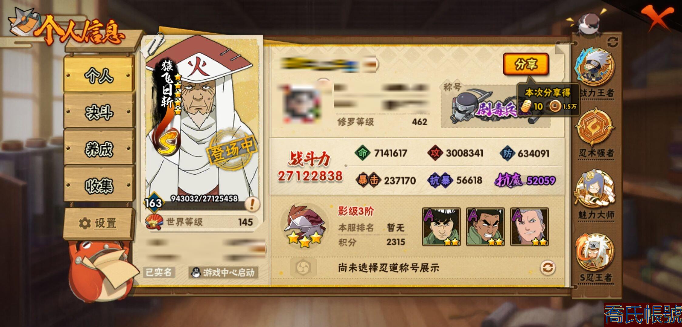 【OBHQTMS496542】戰鬥力:2712W+;段位:影級3階;本服排名:19;戰區排名:未上榜;VIP15級;S忍54個;A忍99個;通靈獸27個;S忍:仙人模式自來也(5星),綱手(5星),猿飛日斬(5星),白面具宇智波斑(5星),大蛇丸(4星),波風水門(4星),須佐能乎宇智波鼬(4星),初代目風影烈鬥(4星),天道佩恩(4星),暴怒第六尾漩渦鳴人,九喇嘛連結漩渦鳴人,永恆萬花筒宇智波佐助,忍界大戰春野櫻,須佐能乎旗木卡卡西,自來也,舞之豪傑自來也,傳說中的三忍自來也,百豪綱手,死門邁特凱,穢土轉生波風水門,九喇嘛連結波風水門,穢土轉生猿飛日斬,穢土轉生千手扉間,千手扉間,千手柱間,木葉創立千手柱間,穢土轉生千手柱間,宇智波斑,穢土轉生宇智波斑,木葉創立宇智波斑,穢土轉生解宇智波斑,穢土轉生宇智波鼬,須佐能乎宇智波止水,神秘面具男,五影會談宇智波斑,忍界大戰宇智波帶土,紅夜之刃神秘面具男,四代目風影羅砂,穢土轉生三代目風影,二代目水影鬼燈幻月,四代目雷影艾,忍界大戰艾,三代目雷影艾,穢土轉生金角銀角,三代目土影大野木,穢土轉生半藏,二代目土影無,忍界大戰大野木,超佩恩天道,穢土轉生長門,仙人模式藥師兜,最終章大筒木舍人,大筒木桃式,大筒木金式;A忍:邁特凱(5星),猿飛阿斯瑪(5星),疾風傳我愛羅(5星),蠍(5星),幹柿鬼鮫(5星),飛段(5星),死司憑血飛段(5星),旗木卡卡西(4星),宇智波止水(3星),奇拉比(3星),忍界大戰土臺(3星),半蛇斗篷藥師兜(3星),初始形態機械鳴人,仙人模式漩渦鳴人,九尾查克拉漩渦鳴人,萬花筒寫輪眼宇智波佐助,須佐能乎宇智波佐助,疾風傳咒印宇智波佐助,俠隱江湖宇智波佐助,宇智波泉奈,百豪春野櫻,忍界大戰秋道丁次,忍界大戰日向寧次,忍界大戰李洛克,忍界大戰天天,最終章日向雛田,幻之真容旗木卡卡西,萬花筒寫輪眼旗木卡卡西,忍界大戰旗木卡卡西,元氣夏日旗木卡卡西,忍界大戰邁特凱,驚門邁特凱,青春爆炸邁特凱,穢土轉生猿飛阿斯瑪,地陸,新春限定宇智波止水,志村團藏,火影繼承人猿飛日斬,三忍之師猿飛日斬,新春限定波風水門,青年波風水門,忍界大戰我愛羅,新春限定我愛羅,忍界大戰勘九郎,近松十人衛千代,五代目水影照美冥,俠隱江湖照美冥,夏日泳裝照美冥,穢土轉生桃地再不斬,桃地再不斬,漂泊武士桃地再不斬,忍界大戰奇拉比,青年艾,俠隱江湖綱手,妖怪奇譚綱手,漂泊武士千手扉間,俠隱江湖藥師兜,不風,不緣,不動,青年長門,漂泊浪客佩恩六道,小南,夏日泳裝小南,漂泊浪客小南,新春限定小南,絕,黑絕,曉創生角都,角都,地怨虞角都,穢土轉生角都,曉大蛇丸,新春限定大蛇丸,緋流琥蠍,百機操演蠍,曉創生蠍,宇智波鼬,新春限定宇智波鼬,夏日限定宇智波鼬,鮫肌融合幹柿鬼鮫,迪達拉,穢土轉生迪達拉,新春限定迪達拉,阿飛,曉創生飛段,暴怒宇智波帶土,漂泊浪客宇智波帶土,加藤斷,俠隱江湖大野木,忍者大戰黃土,火之意志繼承者卑留呼,羈絆神農,猿飛木葉丸,六代目水影長十郎,桃式顯現漩渦博人,五代目雷影達魯伊,四代目土影黑土,夏日限定黑土;通靈獸:忍犬,藍蛇,蛤蟆吉,忍龜,鐮鼬,猿魔,蛞蝓,山椒魚,熊貓,蜃,蛤蟆仙人,鮫鯊,蛤蟆健,烏鴉,,蛤蟆龍,二尾又旅,蛤蟆廣,夢貘,鷹,砂之守鶴,蜘蛛,辛牙,蛞蝓俠隱江湖,蛤蟆吾郎,萬蛇新春限定;時裝:桀驁之刃猿飛阿斯瑪,百戰宇智波鼬須佐能乎,狂野鮫鯊幹柿鬼鮫,鋼鐵之軀邁特凱,蜀面豪傑舞之豪傑自來也,百戰波風水門,百戰佩恩天道,百戰大蛇丸,冷玉豪情綱手俠隱江湖,終焉剎寂宇智波帶土漂泊浪客,仲夏微光宇智波鼬夏日限定,晴浪礁歌黑土夏日限定,太極靈韻日向花火武當宗師,烈土霓裳黑土四代目土影,土之固守大野木三代目土影,憤怒的伊始宇智波帶土暴怒,編織虛實宇智波鼬,龍的傳人李洛克截拳宗師,菁英忍者旗木卡卡西少年,水之妖姬照美冥五代目水影,命定之戰宇智波佐助疾風傳,智勇記者宇智波佐良娜,神使之花小南新春限定,隱藏內心的面具旗木卡卡西暗部,緋櫻綻放春野櫻百豪,血紅辣椒旋渦玖辛奈少女png,血霧怪人幹柿鬼鮫,驚雷掠影達魯伊五代目雷影,可愛睡衣漩渦鳴人,飛瀑流泉長十郎六代目水影,傳說的光芒波風水門,風之守護我愛羅忍界大戰,夏日衝浪旗木卡卡西元氣夏日,剎那的藝術迪達拉,驕陽翠羽照美冥夏日泳裝,紅月映雪宇智波鼬新春限定,雷電之力艾四代目雷影,純白之心白,火之意志綱手百豪,睿勇新星千手扉間少年,熊貓少女天天峨眉宗師;【1117】全328忍者,區裡一組,組織資源多,組織兌換幣多,組織忍者皮膚隨便換,號裡有4w7金幣,加上月卡的總共5w7金幣,可以秒下個高招s,cf號裡也有點配置,可議價。