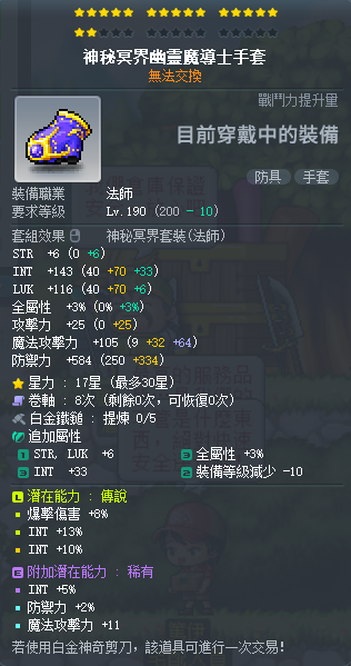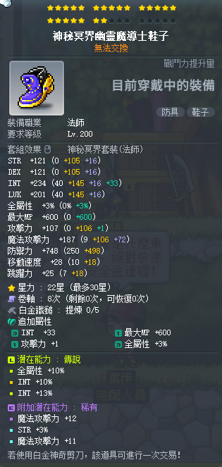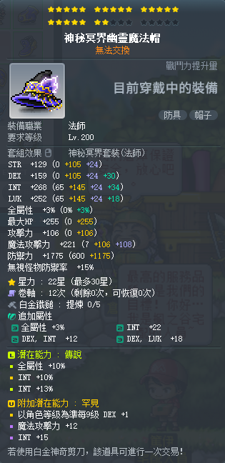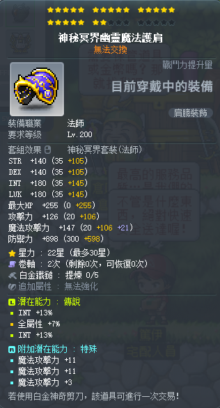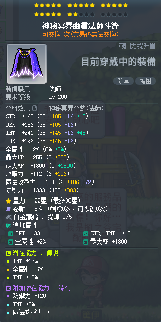 道具 【22星神秘防具】 200等 22星 33%含全屬 神秘冥界幽靈 法師防具整套含肩膀