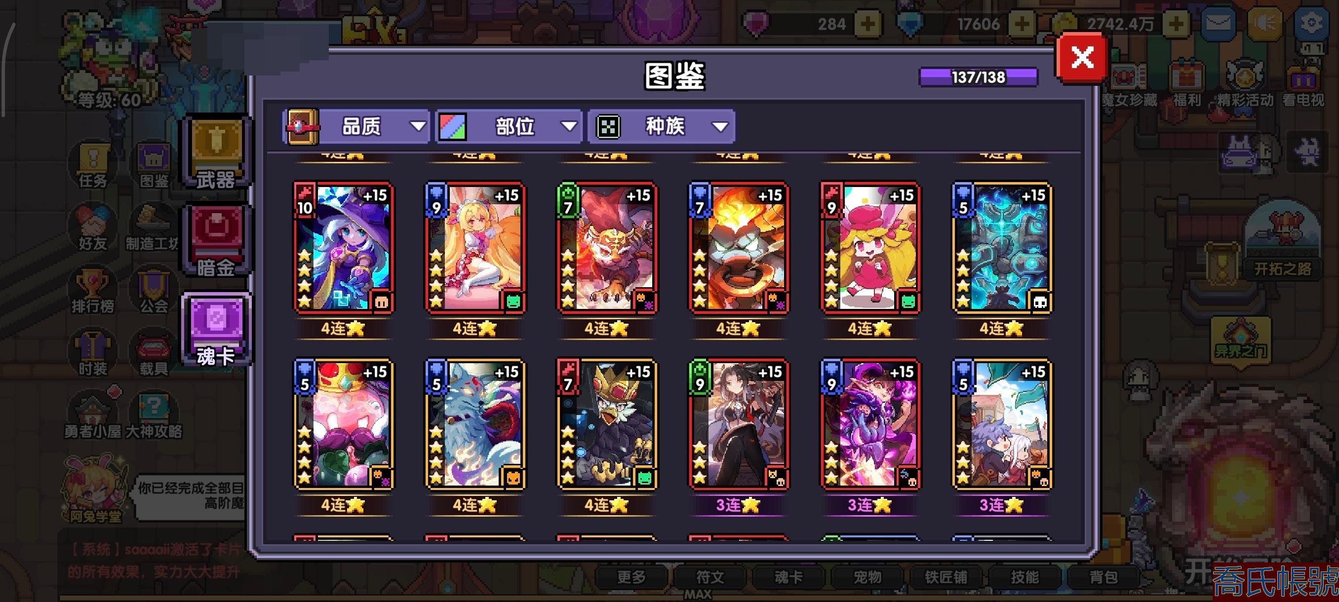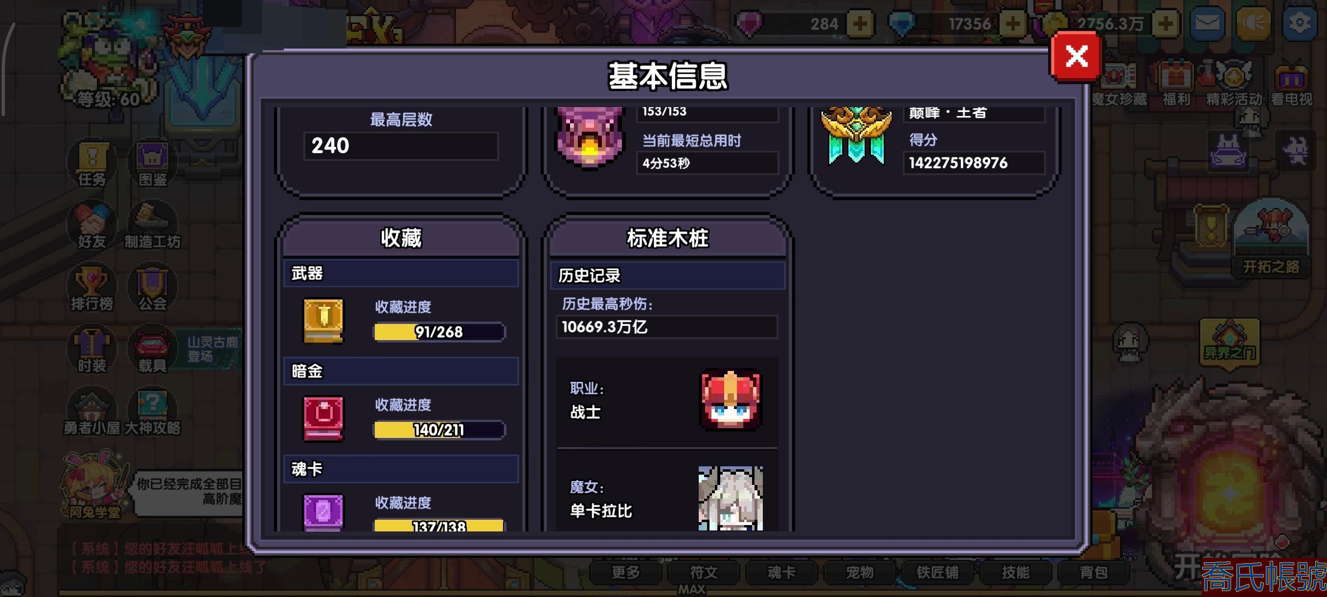 【OBWGXXS440542】賬號型別:taptap 六週年萬萬億戰士,大秘戰士榜二。進度號,活綁,還有284粉鑽,1.75w藍鑽,月卡、契約還有50天,本月執照已買,主流魂卡都有四星,還有一張4連星,套10,通畢火木水664,魂珠再來一次所羅門就能把對王魂珠補齊