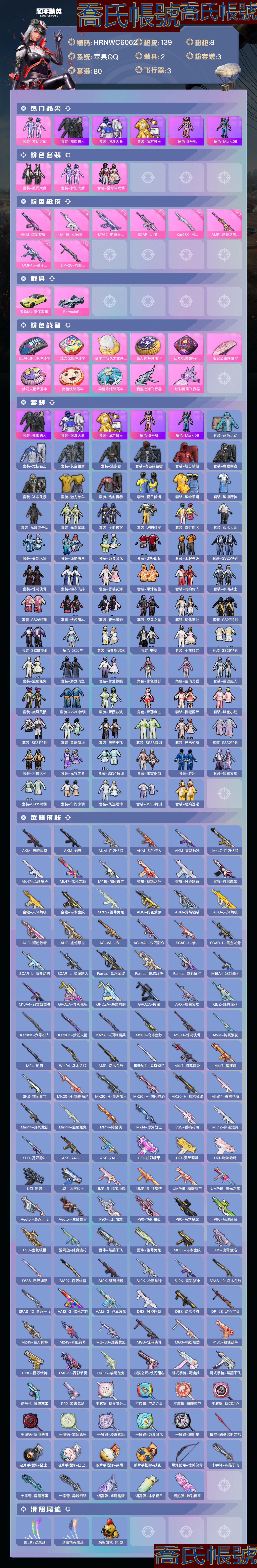 【OBHRNWC606242】熱力值:44260,3粉裝,8粉槍,2載具,11粉色戰備,80套裝,139槍械,171裝備,5滑翔尾翼,45降落傘;等級:Lv.57 歷史最高段位:絕世王牌21星 當前段位:不朽.星鑽Ⅳ;王牌印記8次 卓越印記3次 傳奇印記2次 絕世印記2次; 【熱門品類】:套裝-都市獵人,套裝-浪漫天命,套裝-派對舞王,角色-8號機,角色-Mark.06;【粉色套裝】:粉裝-數碼大師,粉裝-夢幻火箭,粉裝-星穹詠嘆調;【粉色槍械】:AKM-炫紫旋律[5級],M416-女媧靈識[3級],M762-電糖天使[5級],SCAR-L-夢幻火箭[6級],Kar98K-巳巳如意[5級],AMR-炫光之旅[3級],UMP45-量子極限[5級],DP-28-豹影疾電[5級];【粉色載具】:寶馬M4(聖保羅黃),FormulaEGen2(巔峰蘭);【粉色滑翔尾翼】:脆鯊七海飛行器,炫彩糖果飛行器;【粉色降落傘】:BEARBRICK降落傘,炫光之旅降落傘,喜羊羊與灰太狼降落傘,百萬伏特降落傘,初號機覺醒Ver.降落傘,臨安公主降落傘,夢幻火箭降落傘,豬豬俠降落傘,異瞳寒姬降落傘;【其他套裝】:套裝-藍色運動,套裝-競技名士,套裝-長空猛禽,套裝-漫步者,套裝-海島探路者,套裝-旭日情侶,套裝-鷹眼刺客,套裝-冰凍風暴,套裝-魅力單車,套裝-熱血青春,套裝-夏日傾情,套裝-繽紛果語,套裝-濱海廚神,套裝-龍魂突擊隊,套裝-元素星魂,套裝-冷血極客,套裝-WiFi精靈,套裝-霓虹街區,套裝-戰術大師,套裝-曼妙人魚,套裝-熱情海星,套裝-純真浪花,套裝-緋格組合,套裝-王牌教練,套裝-SS25特訓,套裝-驚鴻俠骨,套裝-錦衣飛揚,套裝-香桃花海,套裝-果汁能量,套裝-龍的傳人,套裝-冰河戰士,套裝-SS26特訓,套裝-快閃甜心,套裝-春光漫遊,套裝-空島之星,套裝-明鴛聖池,套裝-SS27特訓,套裝-SS28特訓,角色-冰公主,套裝-海鹽綿綿冰,套裝-蝶變,套裝-小熊娃娃,套裝-SS29特訓,套裝-雛菊兔兔,套裝-遊龍飛魚,套裝-蘿蘭蝴蝶,角色-緋色魅影,角色-紫俏靈貓,套裝-星途旅人,套裝-旋風靈鼠,套裝-SS30特訓,套裝-青團波波,角色-絳羽幽主,套裝-糖糖葫蘆,套裝-絨寶小鵝,套裝-SS31特訓,套裝-魚淵荷華,套裝-燕燕於飛,套裝-SS33特訓,套裝-巳巳如意,套裝-SS32特訓,套裝-大橘大利,套裝-元氣之夢,套裝-SS34特訓,套裝-朱霞熾焰,套裝-遊樂,套裝-凌霄紫焰,套裝-SS35特訓,套裝-午間小調,套裝-風跡短詩,套裝-SS36特訓,套裝-萌雞速遞;其他槍械:AKM-破曉戰魂,AKM-影襲,AKM-百萬伏特,AKM-龍的傳人,AKM-霓彩脈衝,Mk47-百萬伏特,Mk47-風跡短詩,Mk47-炫光之旅,M416-糯團青竹,蜜獾-糖糖葫蘆,蜜獾-風跡短詩,蜜獾-緋穹魔姬,蜜獾-天降萌嘰,蜜獾-烏木金紋,M762-雛菊兔兔,AUG-甜蜜菠蘿,AUG-異域銀裝,AUG-天降萌嘰,AUG-耀粉歌者,AUG-金蛇鎮世,AC-VAL-六號稻草人,AC-VAL-快閃甜心,SCAR-L-拳皇狂花道,SCAR-L-黃金龍骨,SCAR-L-海鹽豹豹,SCAR-L-星途旅人,Famas-烏木金紋,Famas-鏡域雙華,Famas-霓彩脈衝,M16A4-冰河戰士,M16A4-幻世戰舞者,GROZA-異彩先驅,GROZA-海鹽豹豹,GROZA-影襲,ARX-凌霄紫焰,QBZ-純真浪花,Kar98K-六號樹人,Kar98K-夢幻火箭,Kar98K-頂峰精英,M200-烏木金紋,M200-驚鴻俠骨,AWM-純真浪花,M24-影襲,Win94-烏木金紋,AMR-烏木金紋,莫辛納甘-風跡短詩,M417-驚鴻俠骨,M417-豬豬俠,SKS-糯團青竹,MK20-H-糖糖葫蘆,MK20-H-星途旅人,MK20-H-快閃甜心,MK20-H-烏木金紋,Mini14-香桃花海,Mini14-穿刺龍蝦,Mini14-雛菊兔兔,Mk14-豬豬俠,Mk14-冰河戰士,VSS-香桃花海,MK12-風跡短詩,SLR-霓彩脈衝,AKS-74U-烏木金紋,AKS-74U-雞智如我,UZI-炫彩糖果,UZI-天降萌嘰,UZI-啾咪啾咪,UZI-影襲,UZI-冰河戰士,UMP45-絨寶小鵝,UMP45-豬豬俠,UMP45-糖糖葫蘆,UMP45-炫光之旅,Vector-燕燕於飛,Vector-生命誓言,P90-巳巳如意,P90-快閃甜心,P90-烏木金紋,P90-玩趣呆呆,P90-金蛇鎮世,湯姆遜-純真浪花,野牛-燕燕於飛,野牛-雛菊兔兔,MP5K-烏木金紋,JS9-凌霄紫焰,S686-巳巳如意,S1897-百萬伏特,S12K-破曉戰魂,S12K-極意拳鋒,S12K-霓彩脈衝,SPAS-12-烏木金紋,SPAS-12-燕燕於飛,AA12-G-炫光之旅,AA12-G-純真浪花,DBS-風跡短詩,DBS-烏木金紋,DP-28-甜心寶貝,M249-百萬伏特,M249-彩虹符號,MG-36-凌霄紫焰,MG3-驚鴻俠骨,MG3-桃粉嫣然,P18C-糖糖葫蘆,P18C-百萬伏特,TMP-9-霓彩節奏,R1895-雛菊兔兔,沙漠之鷹-快閃甜心,蠍式手槍-奶油夢幻熊,蠍式手槍-燕燕於飛,信號槍-異瞳寒姬,P92-凌霄紫焰,平底鍋-精靈夢葉羅麗,平底鍋-空島之星,平底鍋-糖糖葫蘆,平底鍋-快閃甜心,平底鍋-驚鴻俠骨,平底鍋-雛菊兔兔,平底鍋-凌霄紫焰,平底鍋-純真浪花,平底鍋-超新星,撬棍-朗基努斯之槍,破片手榴彈-星途旅人,破片手榴彈-巳巳如意,破片手榴彈-呆爆全場,破片手榴彈-拽到爆炸,爆炸獵弓-驚鴻俠骨,十字弩-燕燕於飛,十字弩-異瞳寒姬,十字弩-異域銀裝,煙霧彈-鳶尾晶夢,煙霧彈-冰氧夏日,鋁熱彈-炫彩糖果;【其他滑翔尾翼】:破刃行動尾跡,頂峰精英尾跡,雞智如我飛行器;【其他降落傘】:天涯共此時降落傘,海鹽豹豹降落傘,和平使命降落傘,驚鴻俠骨降落傘,星途旅人降落傘,風跡短詩降落傘,SS31王牌降落傘,燕燕於飛降落傘,糖糖葫蘆降落傘,電競之星降落傘,快閃甜心降落傘,SS35王牌降落傘,幹得PEL亮降落傘,月下萌萌兔降落傘,幻世戰舞者降落傘,純真浪花降落傘,遊龍飛魚降落傘,化學天才降落傘,SS34王牌降落傘,SS30王牌降落傘,霓彩節奏降落傘,寂夜之火降落傘,冰河戰士降落傘,SS29王牌降落傘,普通降落傘,凌霄紫焰降落傘,魔童鬧海敖閏降落傘,鋼鐵雄心降落傘,雛菊兔兔降落傘,巳巳如意降落傘,都市獵人降落傘,放飛夢想降落傘,香桃花海降落傘,SS28王牌降落傘,夏日傾情降落傘,SS33王牌降落傘;【夥伴】:夥伴-啾啾,夥伴-雞哥,夥伴-盔