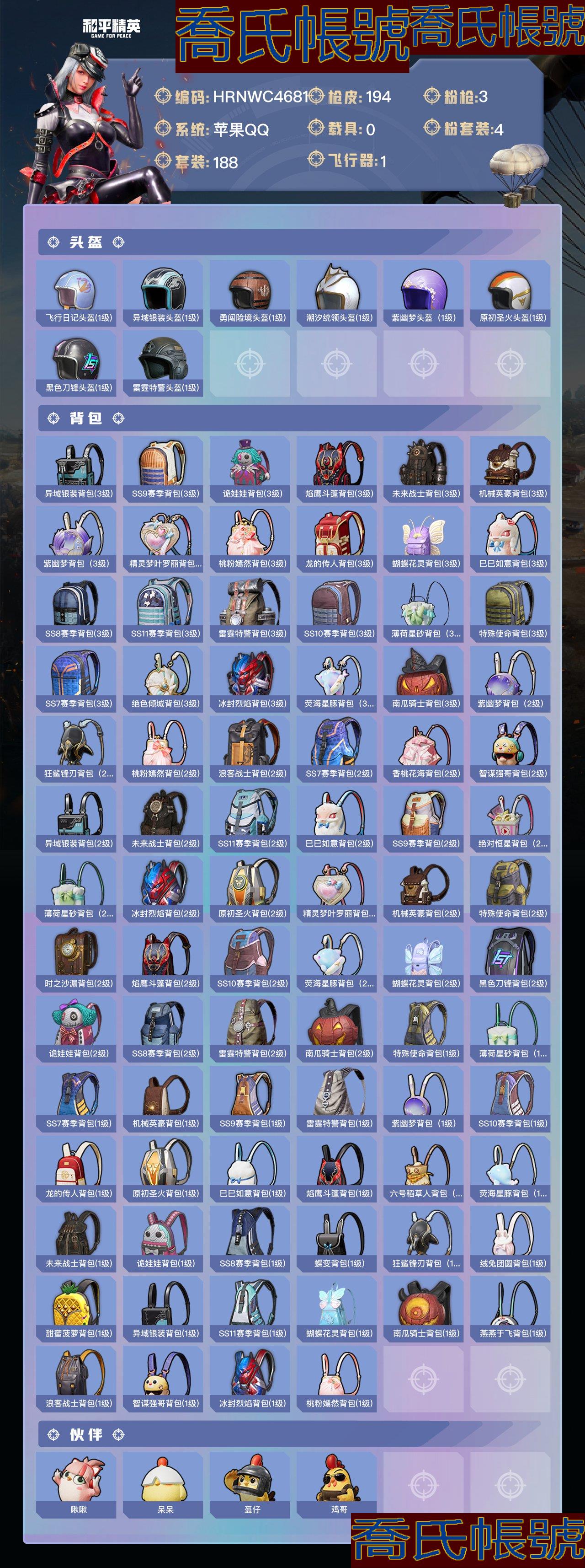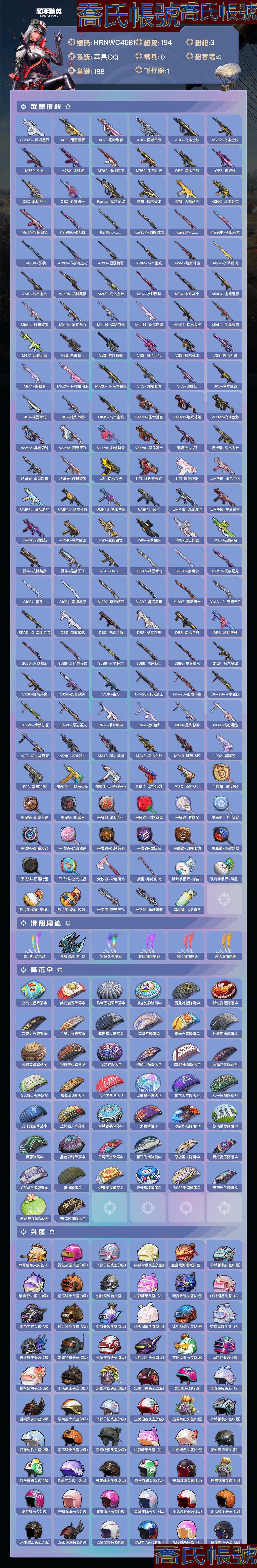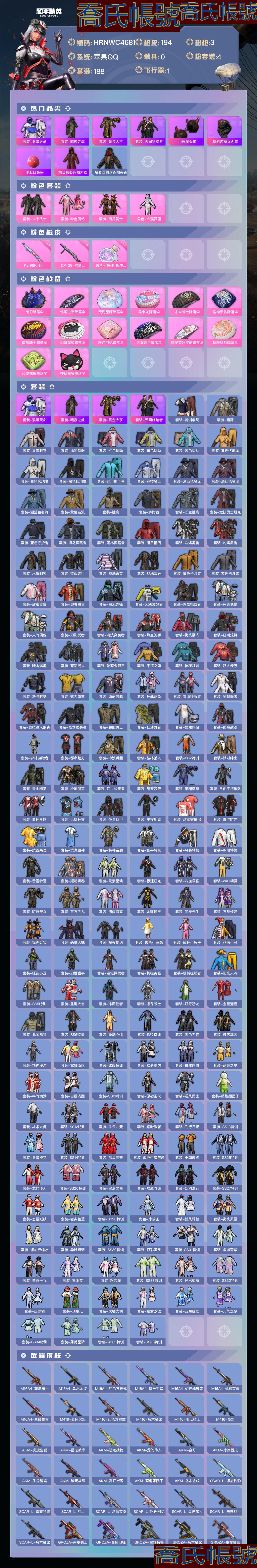 【OBHRNWC468142】熱力值:63112,4粉裝,3粉槍,14粉色戰備,188套裝,194槍械,177裝備,6滑翔尾翼,58降落傘;等級:Lv.63 歷史最高段位:卓越王牌13星 當前段位:超級.王牌2星;王牌印記5次 卓越印記2次;地鐵滿天賦; 【熱門品類】:套裝-浪漫天命,套裝-暗夜之虎,套裝-黃金大亨,套裝-天網終結者,小惡魔頭飾,熔岩遊騎兵面罩,小丑紅鼻頭,旭日初心兜帽大衣,熔岩遊騎兵連帽夾克;【粉色套裝】:粉裝-未來戰士,粉裝-粉色回憶,粉裝-南瓜騎士,角色-冷漠羅麗;【粉色槍械】:Kar98K-巳巳如意[5級],DP-28-豹影疾電[5級],破片手榴彈-瓶中星球[7級];【粉色降落傘】:鬼刀降落傘,快樂主宰降落傘,熒海星豚降落傘,馬卡龍降落傘,未來戰士降落傘,洛神天依降落傘,南瓜騎士降落傘,緋穹魔姬降落傘,粉色回憶降落傘,古堡領主降落傘,精靈夢葉羅麗降落傘,桃粉嫣然降落傘,恐龍拽拽降落傘,神秘黑貓降落傘;【其他套裝】:套裝-特訓學院,套裝-獵鷹,套裝-青年教官,套裝-橘黑制服,套裝-紅色運動,套裝-黃色運動,套裝-藍色運動,套裝-黃色伏地魔,套裝-白色伏地魔,套裝-黑色伏地魔,套裝-冰川格鬥者,套裝-競技名士,套裝-深藍色名流,套裝-酒紅色名流,套裝-湖藍色名流,套裝-黃色名流,套裝-猛禽,套裝-遊獵者,套裝-長空猛禽,套裝-競技勇士朋克,套裝-藍色守護者,套裝-海島探路者,套裝-雨林探路者,套裝-旭日情侶,套裝-冷焰舞者,套裝-灼焰舞者,套裝-水銀刺客,套裝-特戰裝甲,套裝-戰地菁英,套裝-戰地督導,套裝-黃色格鬥者,套裝-灰色格鬥者,套裝-甜蜜告白,套裝-迎春賜吉,套裝-潮流先鋒,套裝-5.56愛好者,套裝-冷酷挑戰者,套裝-完美偶像,套裝-人氣偶像,套裝-幻影武者,套裝-海濱突襲者,套裝-熱血騎手,套裝-街頭潮人,套裝-紅潮炫舞,套裝-暗金炫舞,套裝-藍彩潮人,套裝-酷萌兔限定,套裝-千禧之戀,套裝-神秘領域,套裝-怒火燎原,套裝-決勝時刻,套裝-魅力單車,套裝-綺麗塗鴉,套裝-狂戰萌兔,套裝-雪山征服者,套裝-堅韌舞者,套裝-競技達人朋克,套裝-夜鶯強襲者,套裝-超能勇士,套裝-狂沙舞者,套裝-酷熊伴侶,套裝-破曉戰魂,套裝-森林遊獵者,套裝-都市魅力,套裝-沙漠兵團,套裝-叢林獵人,套裝-SS2特訓,套裝-派對紳士,套裝-雪山精英,套裝-極地朋克,套裝-幻世戰舞者,套裝-甜蜜菠蘿,套裝-半糖藍莓,套裝-自由不朽樂隊,套裝-血色貴族,套裝-迅捷狂鯊,套裝-恆星戰甲,套裝-午夜朋克,套裝-甜蜜熊情侶,套裝-青澀時光,套裝-繽紛果語,套裝-濱海廚神,套裝-特種空勤,套裝-和平特警,套裝-風暴特警,套裝-冰川特警,套裝-雷霆特警,套裝-耀動青春,套裝-元素星魂,套裝-極速紅龍,套裝-冷血極客,套裝-WiFi精靈,套裝-曠野奇兵,套裝-東方飛龍,套裝-初雨海棠,套裝-金環蜂王,套裝-夢魘先生,套裝-萬聖娃娃,套裝-驚聲尖笑,套裝-惡魔人蛛,套裝-黑夜傳說,套裝-破蛋小黃雞,套裝-瘋狂小兔子,套裝-花面小丑,套裝-狂徒小丑,套裝-幻世獵手,套裝-迷域探索者,套裝-機械英豪,套裝-機械征服者,套裝-陽光火雞,套裝-SS5特訓,套裝-聖誕大吉,套裝-冰原使者,套裝-凜冬戰士,套裝-好奇恐龍,套裝-金鼠迎春,套裝-北國孤狼,套裝-SS6特訓,套裝-躍動心情,套裝-SS7特訓,套裝-黑色刀鋒,套裝-核芯基因,套裝-精神漫遊,套裝-霓虹街區,套裝-SS8特訓,套裝-軟萌銀虎,套裝-白熊同盟,套裝-萌黃之夏,套裝-牛氣滿滿,套裝-白糯湯圓,套裝-SS11特訓,套裝-原初聖火,套裝-逆風勇士,套裝-萌趣顏糰子,套裝-戰術大師,套裝-SS12特訓,套裝-牛氣沖天,套裝-耀粉歌者,套裝-飛行日記,套裝-SS13特訓,套裝-浪漫櫻花,套裝-SS14特訓,套裝-福星高照,套裝-虎虎生威吉莉,套裝-王牌教練,套裝-SS25特訓,套裝-龍的傳人,套裝-SS26特訓,套裝-空島之星,套裝-焰鷹斗篷,套裝-幻羽潛行,套裝-SS27特訓,套裝-戀語絨絨,套裝-老實芭蕉,套裝-SS28特訓,角色-冰公主,套裝-新風雅蘭,套裝-街頭風暴,套裝-海鹽綿綿冰,套裝-異域銀裝,套裝-SS30特訓,套裝-雙彩聖靈,套裝-SS31特訓,套裝-魚淵荷華,套裝-燕燕於飛,套裝-紫幽夢,套裝-粉戀花,套裝-SS33特訓,套裝-巳巳如意,套裝-SS32特訓,套裝-藍冰羽,套裝-頂瓜瓜,套裝-大橘大利,套裝-蜜露汐語,套裝-藍海鯨歌,套裝-元氣之夢,套裝-SS34特訓,套裝-薄荷星砂,套裝-SS35特訓,套裝-SS36特訓;其他槍械:M16A4-南瓜騎士,M16A4-烏木金紋,M16A4-紅色方程式,M16A4-快樂主宰,M16A4-幻世戰舞者,M16A4-機械英豪,M16A4-生命誓言,M416-藍色火焰,M416-紅色方程式,M416-烏木金紋,M416-南瓜騎士,M416-夜燈,AKM-虎虎生威,AKM-星之彼岸,AKM-恐龍拽拽,AKM-龍的傳人,AKM-夜燈,AKM-冰涼西瓜,AKM-生命誓言,AKM-破曉戰魂,AKM-霓虹街區,AKM-萌趣顏糰子,AKM-烏木金紋,SCAR-L-海鹽豹豹,SCAR-L-雷霆特警,SCAR-L-紅色方程式,SCAR-L-炫彩節奏,SCAR-L-粉色回憶,SCAR-L-星途旅人,SCAR-L-未來戰士,SCAR-L-烏木金紋,GROZA-南瓜騎士,GROZA-黑色刀鋒,GROZA-雷霆特警,GROZA-烏木金紋,GROZA-生命誓言,GROZA-熒海星豚,AUG-甜蜜菠蘿,AUG-耀粉歌者,AUG-異域銀裝,AUG-烏木金紋,M762-烏木金紋,M762-小丑,M762-詭娃娃,M762-緋紅前夜,M762-牛氣沖天,QBZ-烏木金紋,QBZ-詭娃娃,QBZ-原初聖火,QBZ-彩虹符號,Famas-烏木金紋,蜜獾-烏木金紋,蜜獾-天降萌嘰,G36C-烏木金紋,Mk47-粉色回憶,Kar98K-詭娃娃,Kar98K-王子的夏天,Kar98K-勇闖險境,Kar98K-紅色方程式,Kar98K-彩虹符號,Kar98K-影襲,AWM-不夜海上花,AWM-雷霆特警,AWM-烏木金紋,AWM-焰鷹斗篷,AWM-天降萌嘰,AMR-烏木金紋,Win94-機械英豪,M200-烏木金紋,M24-冰封烈焰,M24-未來戰士,Mini14-金鼠迎春,Mini14-耀粉歌者,Mini14-原初聖火