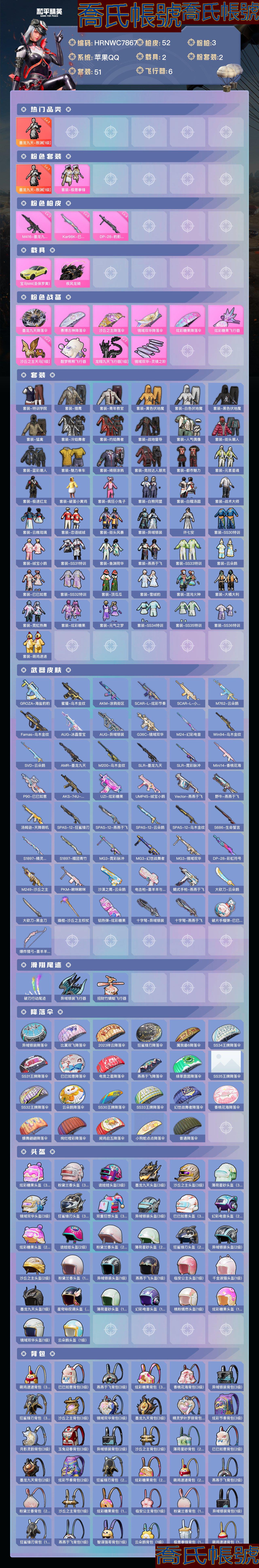 【OBHRNWC786742】熱力值:21032,1神裝,1粉裝,3粉槍,2載具,10粉色戰備,51套裝,52槍械,85裝備,8滑翔尾翼,28降落傘;等級:Lv.49 歷史最高段位:傳奇王牌12星 當前段位:不朽.星鑽Ⅳ;王牌印記6次 卓越印記3次 傳奇印記1次; 【熱門品類】:墨龍九天-敖淵[1級];【紅色套裝】:墨龍九天-敖淵[1級];【粉色套裝】:粉裝-極意拳鋒;【粉色槍械】:M416-墨龍九天[3級],Kar98K-巳巳如意[5級],DP-28-豹影疾電[4級];【粉色載具】:寶馬M4(聖保羅黃),疾風龍騎;【粉色滑翔尾翼】:炫彩糖果飛行器,沙丘之主天馬[1級],酣夢熊熊飛行器,龍翔九天飛行器[1級],鏡域雙華-靈鏡之階;【粉色降落傘】:墨龍九天降落傘,賽博古神降落傘,沙丘之主降落傘,鏡域雙華降落傘,炫彩糖果降落傘;【其他套裝】:套裝-特訓學院,套裝-獵鷹,套裝-青年教官,套裝-黃色伏地魔,套裝-白色伏地魔,套裝-黑色伏地魔,套裝-猛禽,套裝-冷焰舞者,套裝-灼焰舞者,套裝-戰地督導,套裝-人氣偶像,套裝-街頭潮人,套裝-藍彩潮人,套裝-魅力單車,套裝-綺麗塗鴉,套裝-競技達人朋克,套裝-都市魅力,套裝-元素星魂,套裝-極速紅龍,套裝-破蛋小黃雞,套裝-瘋狂小兔子,套裝-白熊同盟,套裝-白糯湯圓,套裝-戰術大師,套裝-雲魄琉璃,套裝-戀語絨絨,套裝-街頭風暴,套裝-異域銀裝,角色-許七安,套裝-SS30特訓,套裝-絨寶小鵝,套裝-SS31特訓,套裝-魚淵荷華,套裝-燕燕於飛,套裝-SS33特訓,套裝-雲朵鵝,套裝-巳巳如意,套裝-SS32特訓,套裝-頂瓜瓜,套裝-雪絨豹,套裝-混沌火種,套裝-大橘大利,套裝-霓虹熱舞,套裝-炫彩糖果,套裝-元氣之夢,套裝-SS34特訓,套裝-SS35特訓,套裝-SS36特訓,套裝-萌雞速遞;其他槍械:GROZA-海鹽豹豹,蜜獾-烏木金紋,AKM-塗鴉街區,SCAR-L-炫彩節奏,SCAR-L-小狗蛇點點,M762-雲朵鵝,Famas-烏木金紋,AUG-冰晶雪寶,AUG-異域銀裝,G36C-鏡域雙華,M24-幻彩電音,Win94-烏木金紋,SVD-雲朵鵝,AMR-墨龍九天,M200-烏木金紋,SLR-墨龍九天,SLR-霓彩脈衝,Mini14-香桃花海,P90-巳巳如意,AKS-74U-烏木金紋,UZI-炫彩糖果,UMP45-絨寶小鵝,Vector-燕燕於飛,野牛-燕燕於飛,湯姆遜-天降萌嘰,SPAS-12-狂鯊鋒刃,SPAS-12-燕燕於飛,SPAS-12-雲朵鵝,SPAS-12-烏木金紋,S686-生命誓言,S1897-精靈夢葉羅麗,S1897-糯團青竹,MG3-霓彩脈衝,MG3-幻世戰舞者,MG3-鏡域雙華,DP-28-彩虹符號,M249-沙丘之主,PKM-啾咪啾咪,沙漠之鷹-雲朵鵝,電擊槍-喜羊羊與灰太狼,蠍式手槍-燕燕於飛,大砍刀-雲朵鵝,大砍刀-黑金刀,撬棍-沙丘之主權杖,鋁熱彈-炫彩糖果,十字弩-異域銀裝,十字弩-燕燕於飛,破片手榴彈-巳巳如意,爆炸獵弓-喜羊羊與灰太狼;【其他滑翔尾翼】:破刃行動尾跡,異域銀裝飛行器,招財竹蜻蜓飛行器;【其他降落傘】:異域銀裝降落傘,比翼雙飛降落傘,2023祥雲降落傘,狂鯊鋒刃降落傘,屬我最6降落傘,SS34王牌降落傘,SS31王牌降落傘,巳巳如意降落傘,電競之星降落傘,燕燕於飛降落傘,綠草茵茵降落傘,SS35王牌降落傘,SS32王牌降落傘,雲朵鵝降落傘,SS30王牌降落傘,SS33王牌降落傘,幻世戰舞者降落傘,香桃花海降落傘,蝶舞翩翩降落傘,絢爛橙彩降落傘,聞雞啟五降落傘,小狗蛇點點降落傘,普通降落傘;【夥伴】:夥伴-啾啾,夥伴-粉雪蛇寶,夥伴-雞哥,夥伴-盔仔,【實際資訊請以最終驗號結果為準】【蘋果QQ】【區服】蘋果QQ 【**情況】無** 【沉迷情況】無防沉迷 【段位】不朽星鑽Ⅳ 【熱力值】21032 【歷史最高段位】傳奇王牌12星 【王牌印記】6 【卓越印記】3 【傳奇印記】1 【絕世印記】0 【遊戲等級】49 【當前賽季KD值】第三人稱-四排 0,第三人稱-雙排 0,第三人稱-單排 0,第一人稱-四排 0,第一人稱-雙排 0,第一人稱-單排 0, 【稀有資產數量】4 【套裝數量】51 【槍械數量】52 【粉槍械數量】3 【粉套裝數量】1 【載具數量】2 【飛行器數量】5 【稀有資產】墨龍九天-敖淵[1級]/M416-墨龍九天[3級]/套裝-絨寶小鵝/角色-許七安 【粉色套裝】套裝-極意拳鋒 【粉色槍皮】Kar98K-巳巳如意[5級]/DP-28-豹影疾電[4級] 【載具】寶馬M4(聖保羅黃)/疾風龍騎 【飛行器】炫彩糖果飛行器/沙丘之主天馬[1級]/酣夢熊熊飛行器/龍翔九天飛行器[1級]/鏡域雙華-靈鏡之階