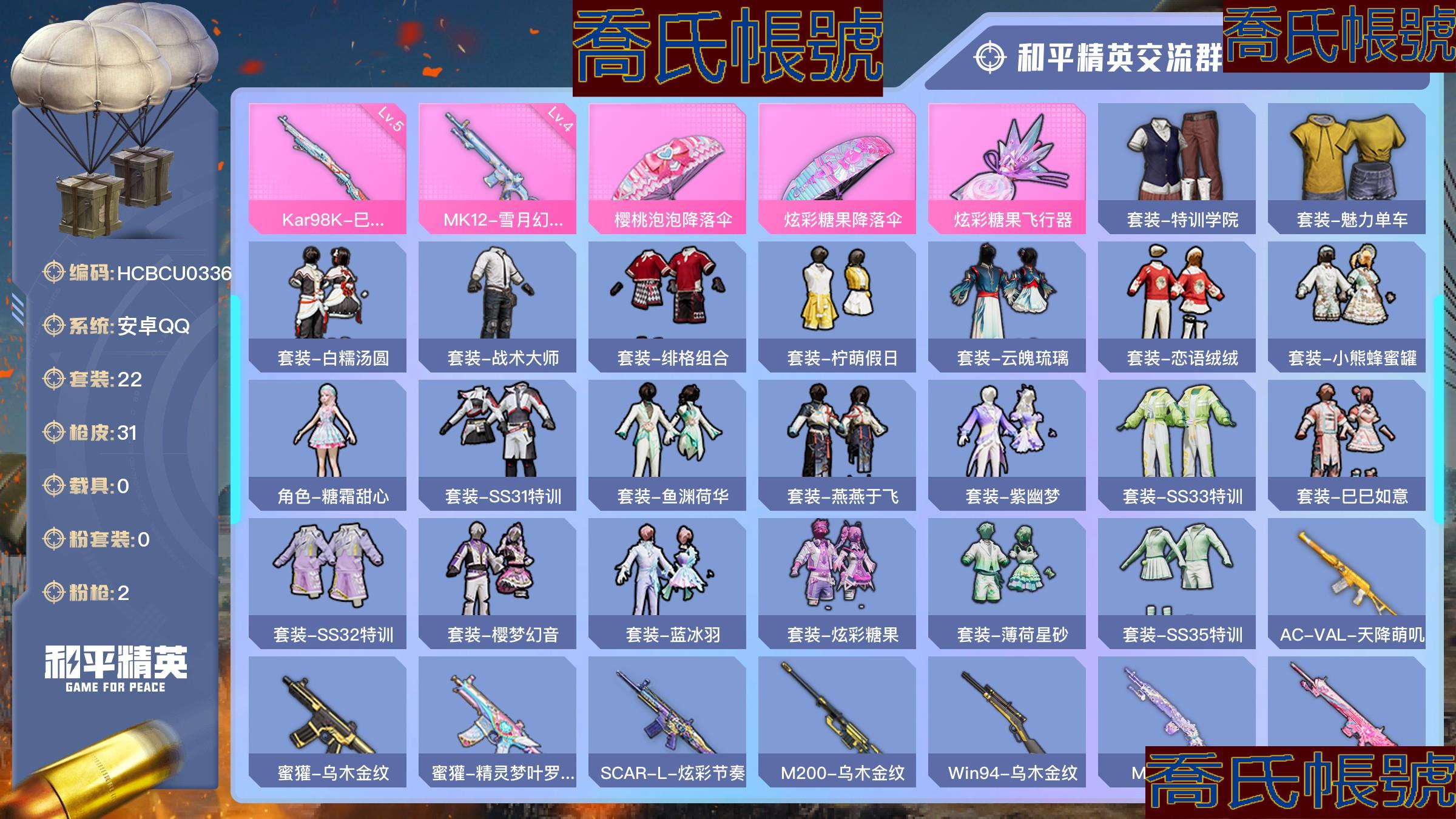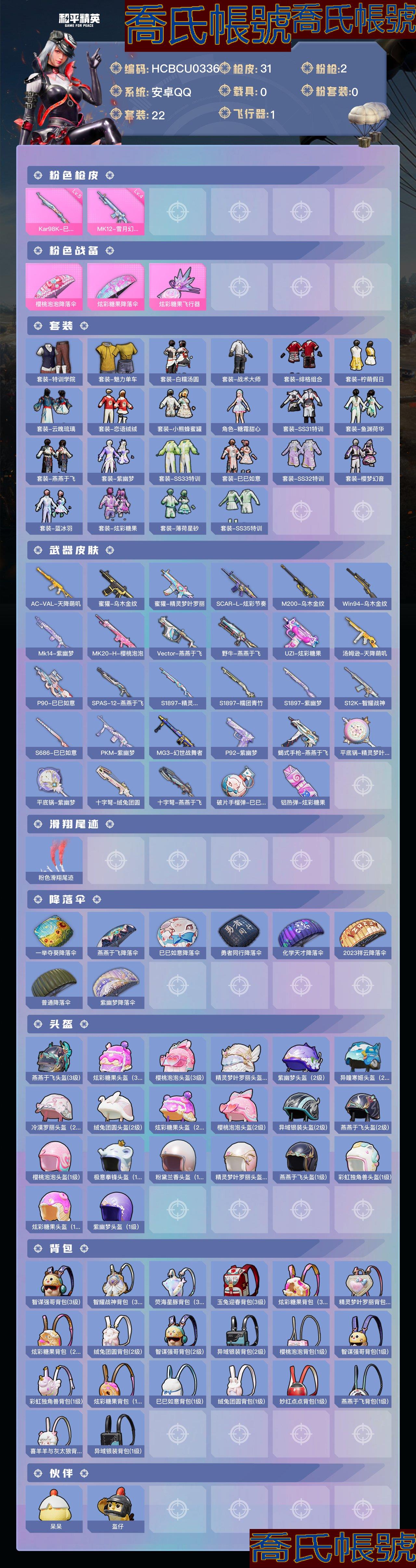 【OBHCBCU033642】熱力值:8984,2粉槍,3粉色戰備,22套裝,31槍械,45裝備,2滑翔尾翼,10降落傘;等級:Lv.30 歷史最高段位:榮耀皇冠Ⅴ 當前段位:英勇.黃金Ⅰ;; 【粉色槍械】:Kar98K-巳巳如意[5級],MK12-雪月幻音[4級];【粉色滑翔尾翼】:炫彩糖果飛行器;【粉色降落傘】:櫻桃泡泡降落傘,炫彩糖果降落傘;【其他套裝】:套裝-特訓學院,套裝-魅力單車,套裝-白糯湯圓,套裝-戰術大師,套裝-緋格組合,套裝-檸萌假日,套裝-雲魄琉璃,套裝-戀語絨絨,套裝-小熊蜂蜜罐,角色-糖霜甜心,套裝-SS31特訓,套裝-魚淵荷華,套裝-燕燕於飛,套裝-紫幽夢,套裝-SS33特訓,套裝-巳巳如意,套裝-SS32特訓,套裝-櫻夢幻音,套裝-藍冰羽,套裝-炫彩糖果,套裝-薄荷星砂,套裝-SS35特訓;其他槍械:AC-VAL-天降萌嘰,蜜獾-烏木金紋,蜜獾-精靈夢葉羅麗,SCAR-L-炫彩節奏,M200-烏木金紋,Win94-烏木金紋,Mk14-紫幽夢,MK20-H-櫻桃泡泡,Vector-燕燕於飛,野牛-燕燕於飛,UZI-炫彩糖果,湯姆遜-天降萌嘰,P90-巳巳如意,SPAS-12-燕燕於飛,S1897-精靈夢葉羅麗,S1897-糯團青竹,S1897-紫幽夢,S12K-智耀戰神,S686-巳巳如意,PKM-紫幽夢,MG3-幻世戰舞者,P92-紫幽夢,蠍式手槍-燕燕於飛,平底鍋-精靈夢葉羅麗,平底鍋-紫幽夢,十字弩-絨兔團圓,十字弩-燕燕於飛,破片手榴彈-巳巳如意,鋁熱彈-炫彩糖果;【其他滑翔尾翼】:粉色滑翔尾跡;【其他降落傘】:一舉奪葵降落傘,燕燕於飛降落傘,巳巳如意降落傘,勇者同行降落傘,化學天才降落傘,2023祥雲降落傘,普通降落傘,紫幽夢降落傘;【夥伴】:夥伴-呆呆,夥伴-盔仔,【實際資訊請以最終驗號結果為準】