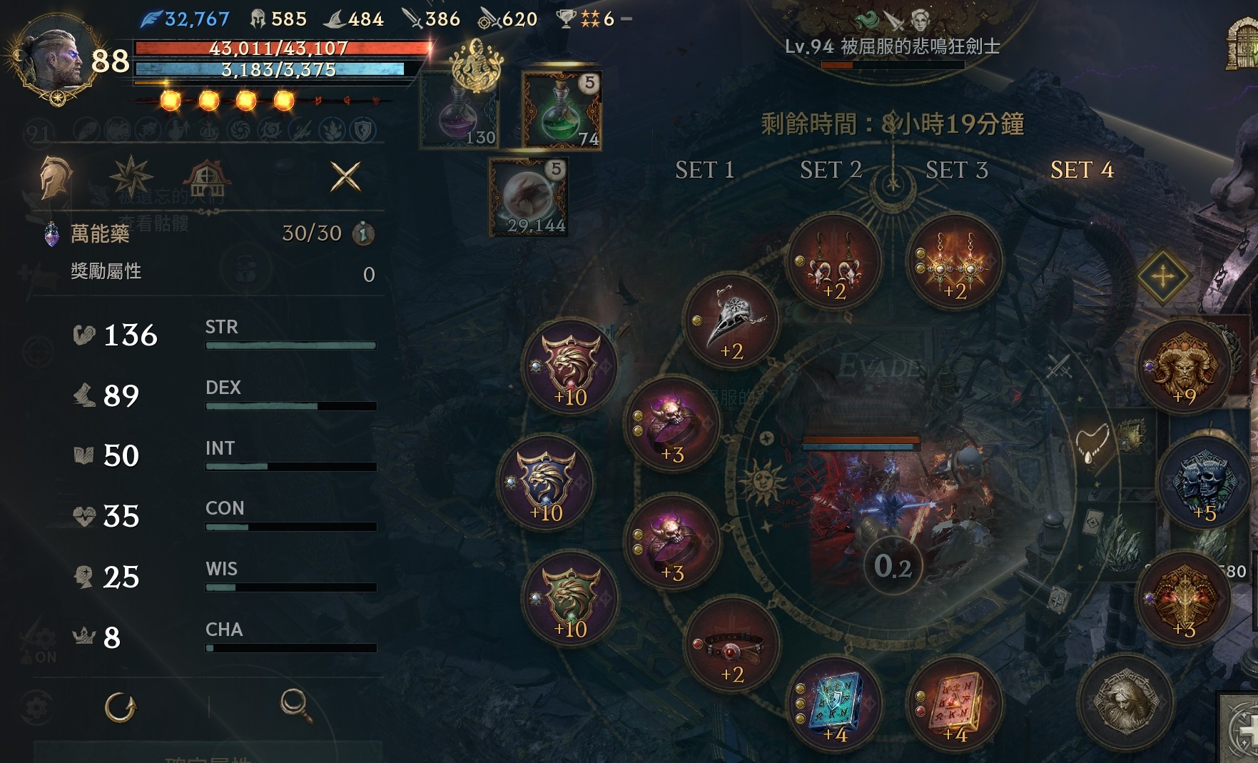 +5暗殺斗、+5祝雪壁靴、+2不死項鍊、+2力皮帶、+2怨恨耳