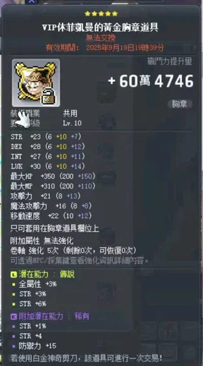 【胸章】VIP休菲凱曼的黃金胸章道具傳說12%力白3均2.6攻附加稀有