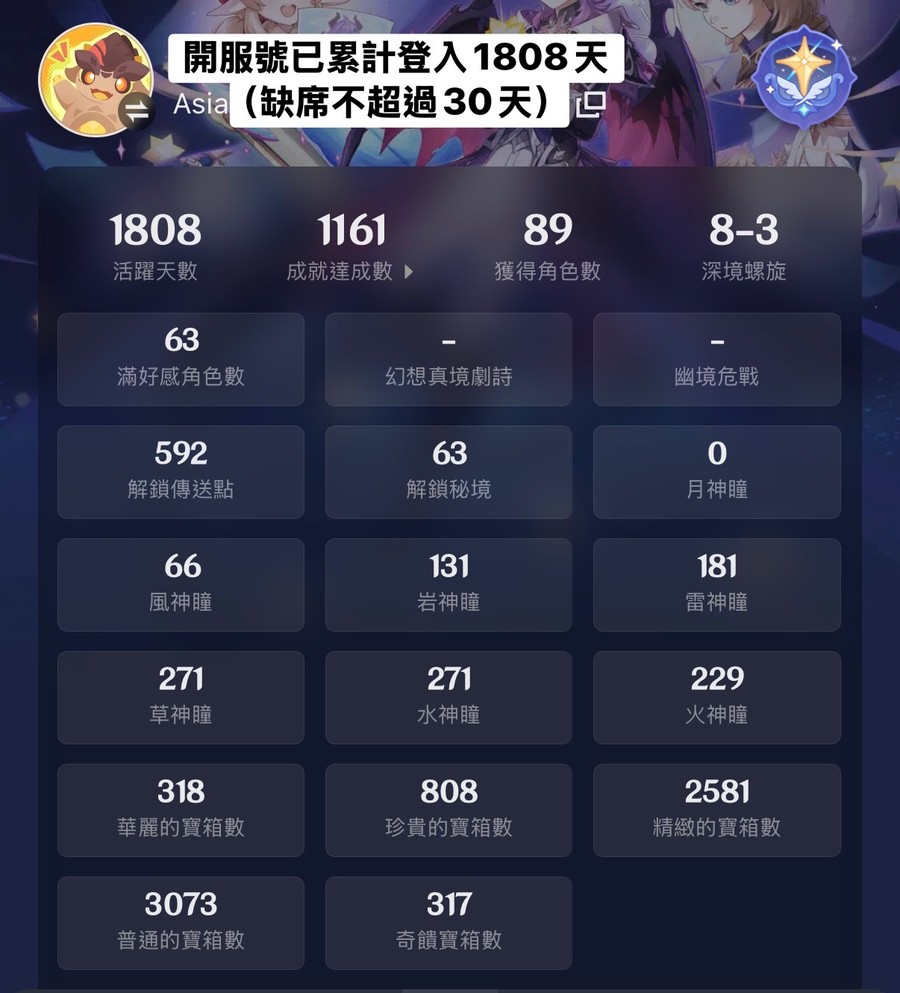 練度和聖遺物都很不錯,基本上深淵都能打滿。