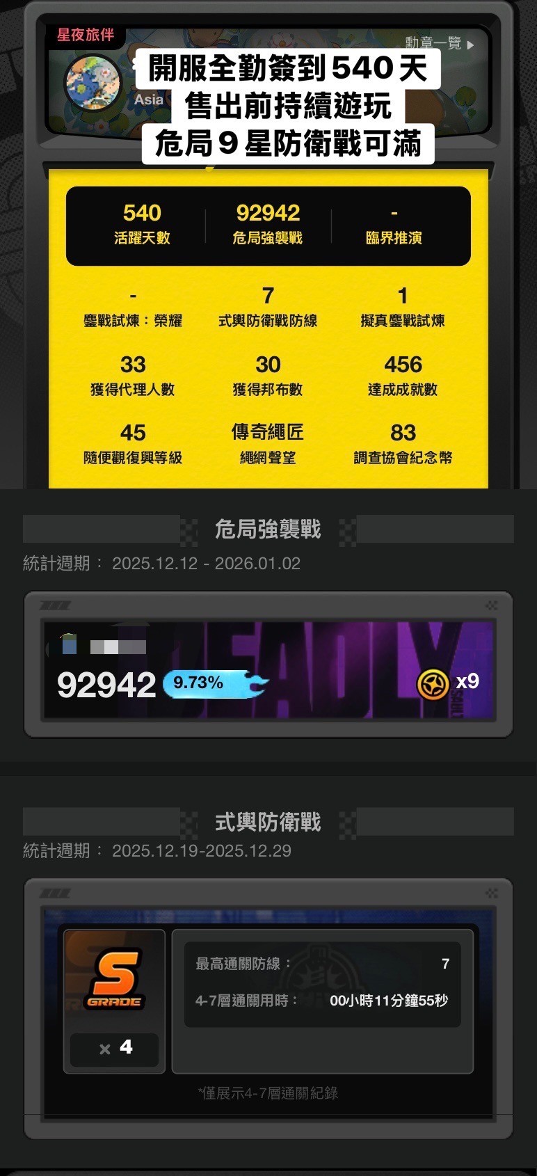 角色都有練度基本上每期危局跟防衛戰都能打滿,本期危局9星、防衛戰全S