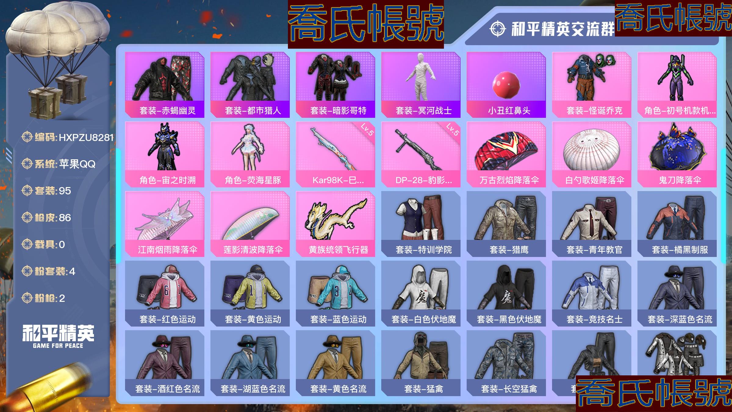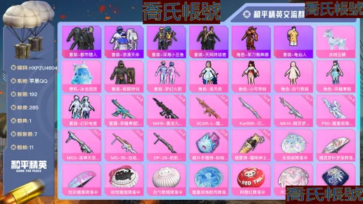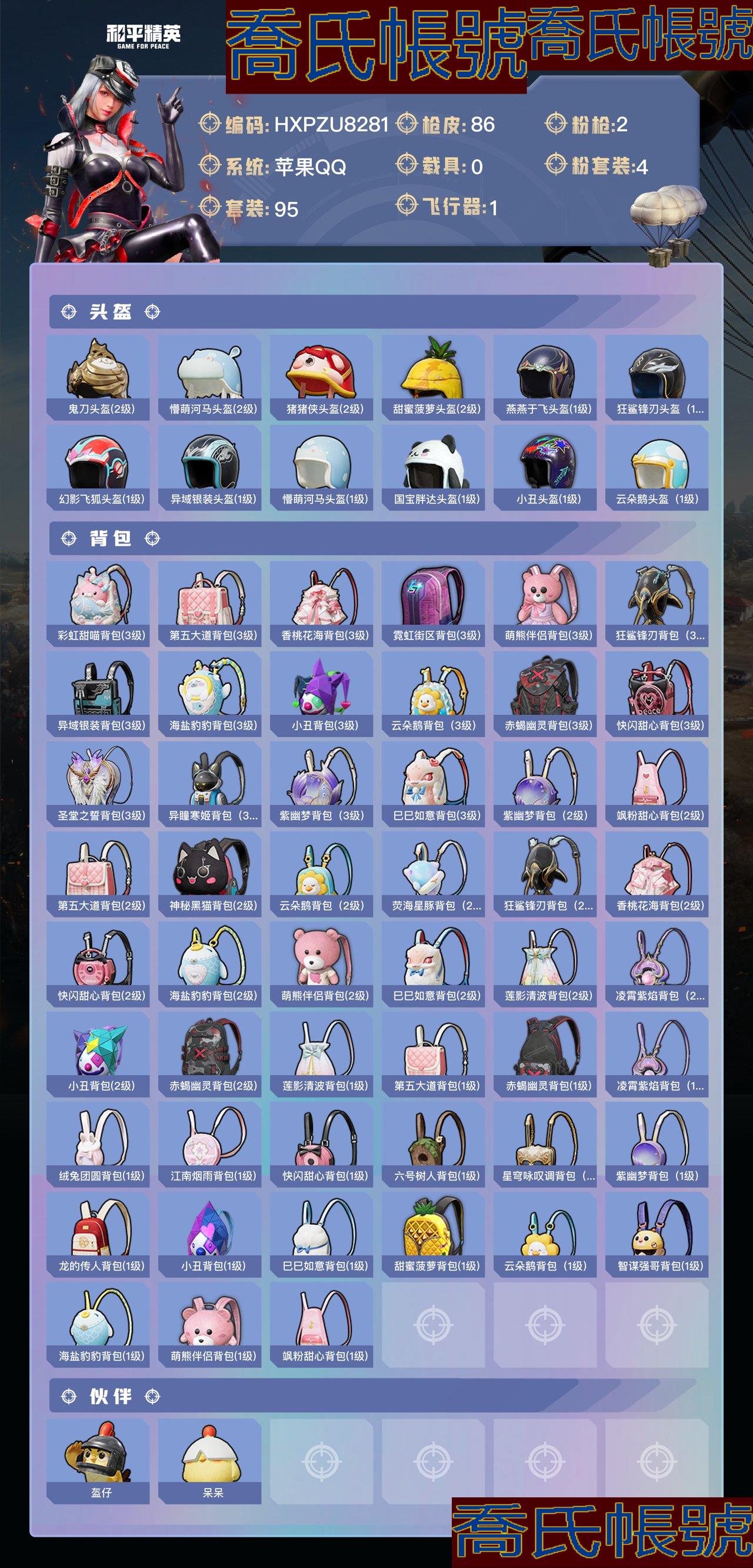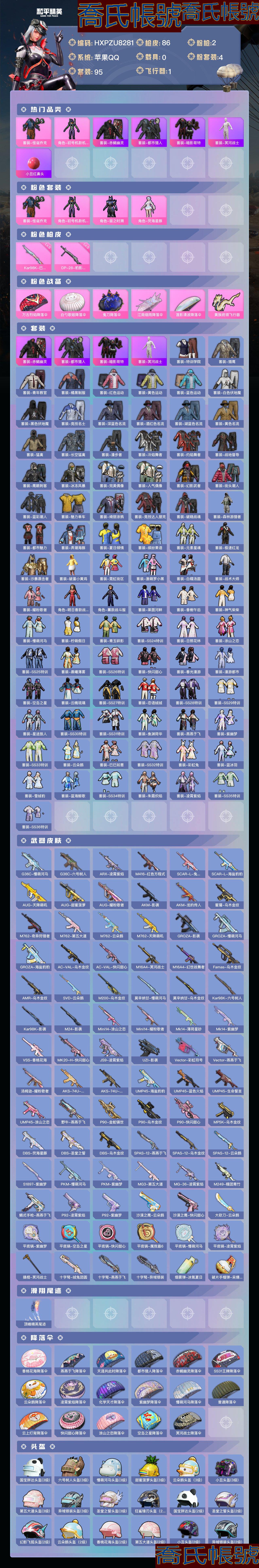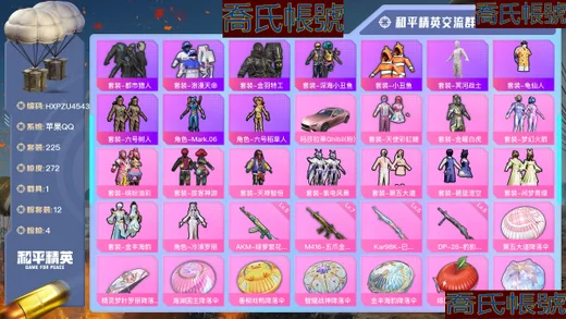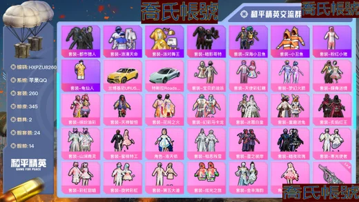 【OBHXPZU828142】熱力值:27053,4粉裝,2粉槍,6粉色戰備,95套裝,86槍械,97裝備,2滑翔尾翼,22降落傘;等級:Lv.45 歷史最高段位:超級王牌7星 當前段位:不朽.星鑽Ⅴ;王牌印記2次; 【熱門品類】:套裝-赤蠍幽靈,套裝-都市獵人,套裝-暗影哥特,套裝-冥河戰士,小丑紅鼻頭;【粉色套裝】:粉裝-怪誕喬克,角色-初號機款機體服,角色-宙之時溯,角色-熒海星豚;【粉色槍械】:Kar98K-巳巳如意[5級],DP-28-豹影疾電[5級];【粉色滑翔尾翼】:黃族統領飛行器;【粉色降落傘】:萬古烈焰降落傘,白勺歌姬降落傘,鬼刀降落傘,江南煙雨降落傘,蓮影清波降落傘;【其他套裝】:套裝-特訓學院,套裝-獵鷹,套裝-青年教官,套裝-橘黑制服,套裝-紅色運動,套裝-黃色運動,套裝-藍色運動,套裝-白色伏地魔,套裝-黑色伏地魔,套裝-競技名士,套裝-深藍色名流,套裝-酒紅色名流,套裝-湖藍色名流,套裝-黃色名流,套裝-猛禽,套裝-長空猛禽,套裝-漫步者,套裝-冷焰舞者,套裝-灼焰舞者,套裝-戰地督導,套裝-鷹眼刺客,套裝-冰凍風暴,套裝-完美偶像,套裝-人氣偶像,套裝-幻影武者,套裝-街頭潮人,套裝-藍彩潮人,套裝-魅力單車,套裝-綺麗塗鴉,套裝-競技達人朋克,套裝-破曉戰魂,套裝-森林遊獵者,套裝-都市魅力,套裝-弄潮海豚,套裝-夏日傾情,套裝-繽紛果語,套裝-元素星魂,套裝-極速紅龍,套裝-沙暴襲擊者,套裝-破蛋小黃雞,套裝-霓虹街區,套裝-激萌羅小黑,套裝-白糯湯圓,套裝-戰術大師,套裝-耀粉歌者,角色-明日香款戰鬥服,角色-薰款戰鬥服,套裝-萊茵河畔,套裝-香榭午後,套裝-神氣柴柴,套裝-懵萌河馬,套裝-檸萌假日,套裝-青玉碎影,套裝-SS24特訓,套裝-日照花林,套裝-塗山之戀,套裝-SS25特訓,套裝-晨曦薄霧,套裝-SS26特訓,套裝-快閃甜心,套裝-春光漫遊,套裝-漫遊都市,套裝-空島之星,套裝-雲魄琉璃,套裝-SS27特訓,套裝-戀語絨絨,套裝-SS28特訓,套裝-SS29特訓,套裝-星途旅人,套裝-SS30特訓,套裝-SS31特訓,套裝-魚淵荷華,套裝-燕燕於飛,套裝-紫幽夢,套裝-SS33特訓,套裝-雲朵鵝,套裝-巳巳如意,套裝-SS32特訓,套裝-彩虹兔,套裝-藍冰羽,套裝-雪絨豹,套裝-藍海鯨歌,套裝-SS34特訓,套裝-朱霞熾焰,套裝-凌霄紫焰,套裝-SS35特訓,套裝-SS36特訓;其他槍械:G36C-懵萌河馬,G36C-六號樹人,ARX-凌霄紫焰,M416-紅色方程式,SCAR-L-兔兔白日夢,SCAR-L-海鹽豹豹,AUG-天降萌嘰,AUG-甜蜜菠蘿,AUG-耀粉歌者,AKM-影襲,AKM-龍的傳人,蜜獾-烏木金紋,M762-奇異狩獵者,M762-第五大道,M762-雲朵鵝,M762-天降萌嘰,GROZA-影襲,GROZA-懵萌河馬,GROZA-海鹽豹豹,AC-VAL-烏木金紋,AC-VAL-快閃甜心,M16A4-冥河戰士,M16A4-幻世戰舞者,Famas-烏木金紋,AMR-烏木金紋,SVD-雲朵鵝,M200-烏木金紋,莫辛納甘-懵萌河馬,莫辛納甘-烏木金紋,Kar98K-六號樹人,Kar98K-影襲,M24-影襲,Mini14-塗山之戀,Mini14-耀粉歌者,Mk14-薄荷星砂,Mk14-紫幽夢,VSS-香桃花海,MK20-H-快閃甜心,JS9-凌霄紫焰,UZI-影襲,Vector-彩虹符號,Vector-燕燕於飛,湯姆遜-耀粉歌者,AKS-74U-黃油吐司,AKS-74U-烏木金紋,UMP45-海鹽豹豹,UMP45-藍色火焰,UMP45-生命誓言,UMP45-塗山之戀,野牛-燕燕於飛,P90-金蛇鎮世,P90-烏木金紋,P90-快閃甜心,MP5K-烏木金紋,DBS-熒海星豚,DBS-聖堂之誓,DBS-烏木金紋,SPAS-12-燕燕於飛,SPAS-12-烏木金紋,SPAS-12-雲朵鵝,S1897-紫幽夢,PKM-懵萌河馬,PKM-紫幽夢,MG3-第五大道,MG-36-凌霄紫焰,M249-糯團青竹,蠍式手槍-燕燕於飛,P92-凌霄紫焰,P92-紫幽夢,沙漠之鷹-雲朵鵝,沙漠之鷹-快閃甜心,大砍刀-雲朵鵝,平底鍋-紫幽夢,平底鍋-空島之星,平底鍋-快閃甜心,平底鍋-屬我最6,平底鍋-懵萌河馬,平底鍋-凌霄紫焰,撬棍-冥河戰士,十字弩-絨兔團圓,十字弩-燕燕於飛,十字弩-異域銀裝,煙霧彈-冰氧夏日,破片手榴彈-呆爆全場;【其他滑翔尾翼】:頂峰精英尾跡;【其他降落傘】:香桃花海降落傘,燕燕於飛降落傘,天涯共此時降落傘,都市獵人降落傘,赤蠍幽靈降落傘,SS31王牌降落傘,雲朵鵝降落傘,凌霄紫焰降落傘,化學天才降落傘,紫幽夢降落傘,懵萌河馬降落傘,普通降落傘,雲上燈宵降落傘,快閃甜心降落傘,塗山之戀降落傘,空島之星降落傘,冥河戰士降落傘;【夥伴】:夥伴-盔仔,夥伴-呆呆,【實際資訊請以最終驗號結果為準】【蘋果QQ】精氪男神號胖達頭粉熊包低段位炸魚