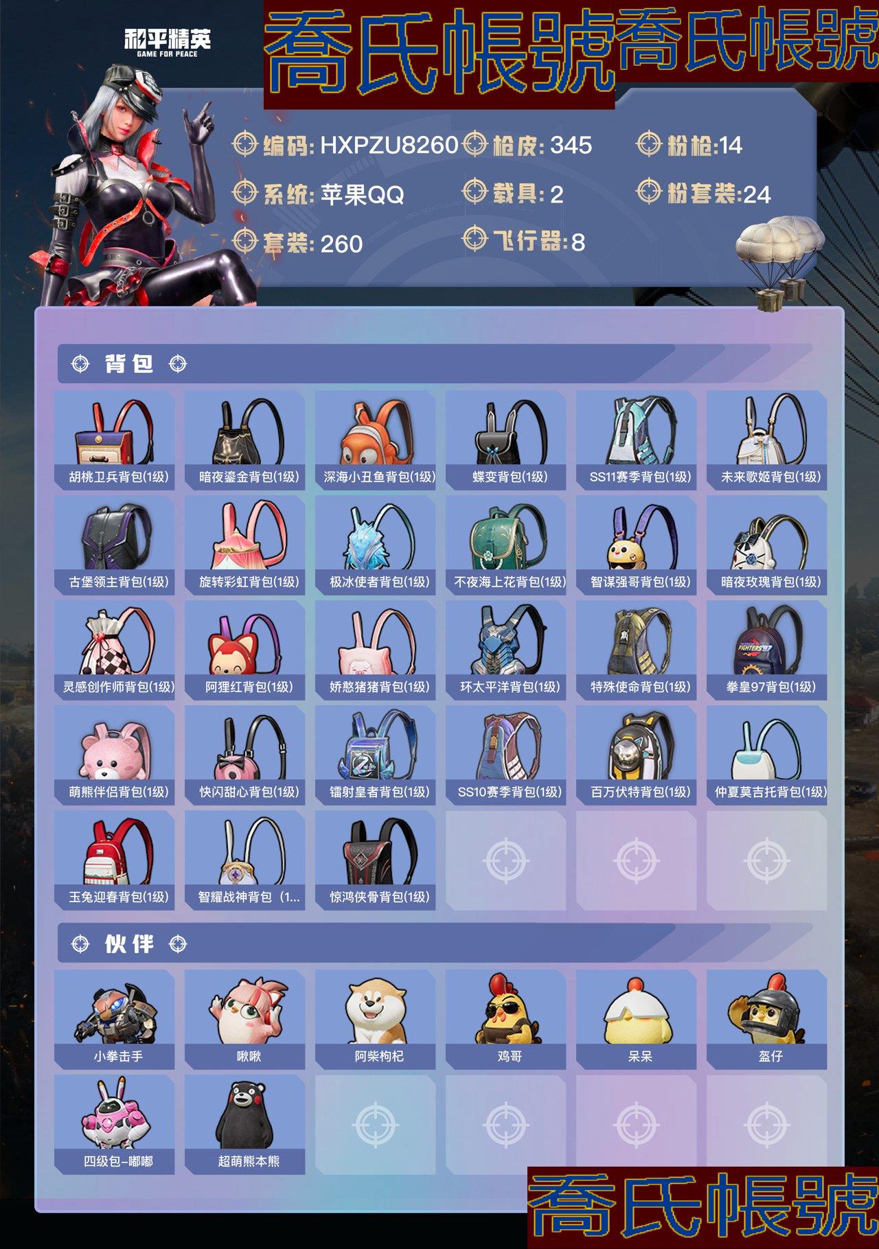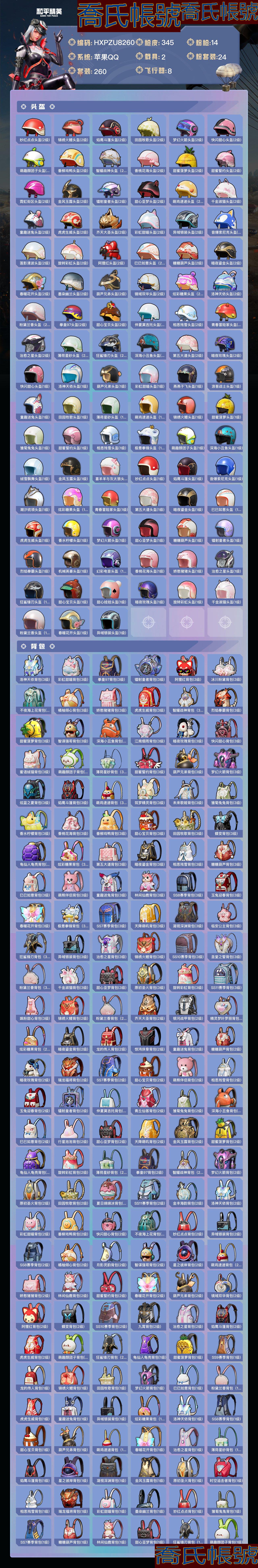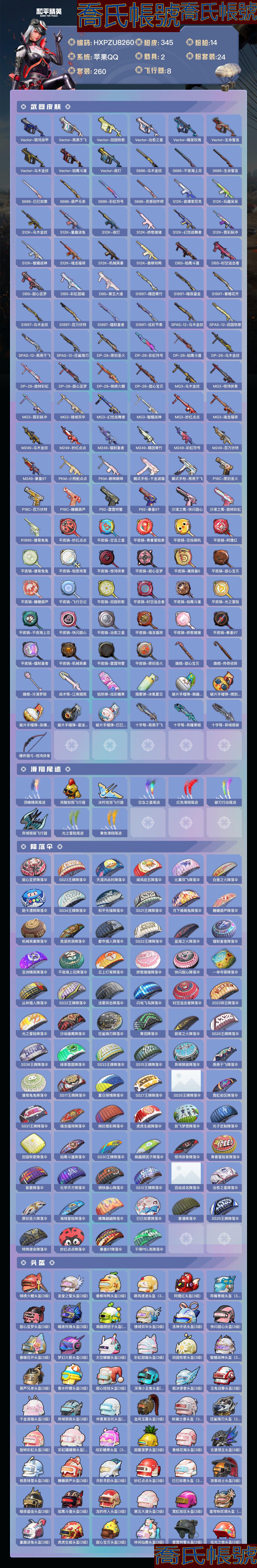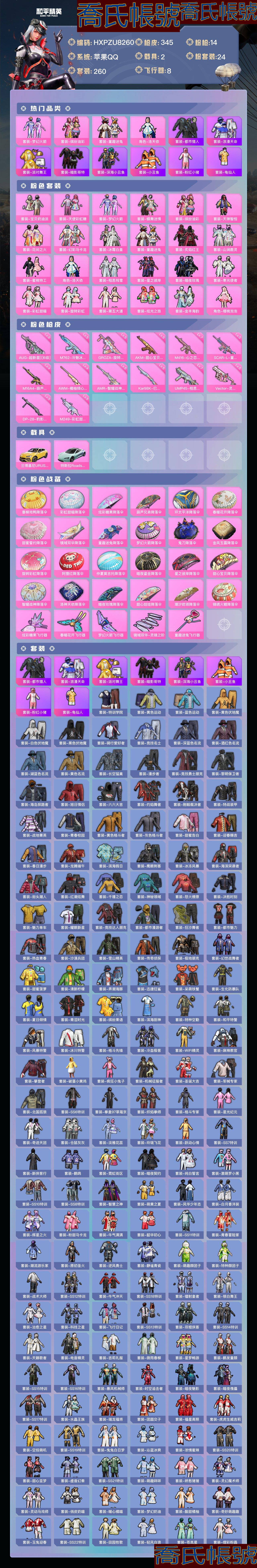【OBHXPZU826042】熱力值:123260,24粉裝,14粉槍,2載具,29粉色戰備,260套裝,345槍械,413裝備,14滑翔尾翼,100降落傘;等級:Lv.74 歷史最高段位:絕世王牌17星 當前段位:超級.王牌5星;王牌印記18次 卓越印記4次 傳奇印記3次 絕世印記1次;地鐵滿天賦; 【熱門品類】:套裝-都市獵人,套裝-浪漫天命,套裝-派對舞王,套裝-暗影哥特,套裝-深海小丑魚,套裝-小丑魚,套裝-粉紅小豬,套裝-龜仙人;【粉色套裝】:粉裝-寶貝奶油派,粉裝-天使彩虹糖,粉裝-夢幻火箭,粉裝-蝶舞迷情,粉裝-繽紛油彩,粉裝-天禪智恆,粉裝-花間之火,粉裝-幻彩馬卡龍,粉裝-冰霜白皇,粉裝-童趣迷兔,粉裝-炙焰紅王,粉裝-山澗鹿靈,粉裝-蜜桃特工,角色-洛天依,粉裝-相思殘雪,粉裝-星之彼岸,粉裝-暗夜玫瑰,粉裝-寒光使者,粉裝-彩虹甜喵,粉裝-旋轉彩虹,粉裝-第五大道,粉裝-炫光之旅,粉裝-金豐海韻,角色-櫻桃泡泡;【粉色槍械】:AUG-超新星[6級],M762-冷魅冰騎[5級],GROZA-旋轉彩虹[5級],AKM-甜心寶貝[5級],M416-心之戀語[7級],SCAR-L-童趣迷兔[5級],M16A4-葫蘆兄弟[4級],AWM-橘柚傾心[4級],AMR-智耀戰神[6級],Kar98K-巳巳如意[5級],UMP45-相思殘雪[7級],Vector-靈感創作師[5級],DP-28-豹影疾電[5級],M249-彩虹甜喵[5級];【粉色載具】:蘭博基尼URUS(明豔黃),特斯拉Roadster(水滴藍);【粉色滑翔尾翼】:炫彩糖果飛行器,春暖花開飛行器,夢幻火箭飛行器,鏡域雙華-靈鏡之階,童趣迷兔飛行器;【粉色降落傘】:垂柳戲鴨降落傘,彩虹甜喵降落傘,炫彩糖果降落傘,葫蘆兄弟降落傘,環太平洋降落傘,春暖花開降落傘,甜蜜誓約降落傘,鏡域雙華降落傘,童趣迷兔降落傘,夢幻火箭降落傘,鬼刀降落傘,金風玉露降落傘,旋轉彩虹降落傘,阿狸紅降落傘,仲夏莫吉托降落傘,暗夜鎏金降落傘,星之彼岸降落傘,甜心寶貝降落傘,智耀戰神降落傘,洛神天依降落傘,暗夜玫瑰降落傘,甜心娃娃降落傘,潮汐統領降落傘,錦繡火鯉降落傘;【其他套裝】:套裝-特訓學院,套裝-黃色運動,套裝-藍色運動,套裝-黃色伏地魔,套裝-白色伏地魔,套裝-黑色伏地魔,套裝-騎行愛好者,套裝-競技名士,套裝-深藍色名流,套裝-酒紅色名流,套裝-湖藍色名流,套裝-黃色名流,套裝-長空猛禽,套裝-漫步者,套裝-競技勇士朋克,套裝-黎明保衛者,套裝-海島探路者,套裝-旭日情侶,套裝-六六大吉,套裝-灼焰舞者,套裝-剛毅裁決者,套裝-特戰裝甲,套裝-戰地菁英,套裝-青春校園,套裝-黃色格鬥者,套裝-灰色格鬥者,套裝-甜蜜告白,套裝-迎春賜吉,套裝-春日漫步,套裝-龍騰端午,套裝-濱海假日,套裝-鷹眼刺客,套裝-冰凍風暴,套裝-海濱突襲者,套裝-街頭潮人,套裝-紅潮炫舞,套裝-千禧之戀,套裝-神秘領域,套裝-怒火燎原,套裝-決勝時刻,套裝-魅力單車,套裝-耀眼新星,套裝-競技達人朋克,套裝-都市漫遊者,套裝-狂沙舞者,套裝-都市魅力,套裝-熱血青春,套裝-沙漠兵團,套裝-雪山精英,套裝-傳奇偵探,套裝-極地朋克,套裝-幻世戰舞者,套裝-甜蜜菠蘿,套裝-清新檸檬,套裝-弄潮海豚,套裝-迅捷狂鯊,套裝-呆萌鐵蟹,套裝-生化防暴隊,套裝-夏日傾情,套裝-青澀時光,套裝-繽紛果語,套裝-濱海廚神,套裝-特種空勤,套裝-和平特警,套裝-風暴特警,套裝-冰川特警,套裝-格鬥先鋒,套裝-冷血極客,套裝-WiFi精靈,套裝-麻辣教官,套裝-攀登者,套裝-破蛋小黃雞,套裝-瘋狂小兔子,套裝-機械征服者,套裝-聖誕大吉,套裝-軍械專家,套裝-北國孤狼,套裝-SS6特訓,套裝-拳皇97草薙京,套裝-熾焰拳師,套裝-格鬥專家,套裝-星光紀元,套裝-奇蹟天團,套裝-倉鼠灰灰,套裝-淡雅花蕊,套裝-玲瓏飛花,套裝-躍動心情,套裝-SS7特訓,套裝-新俠客行,套裝-鶴鳴,套裝-霓虹街區,套裝-暗夜契約,套裝-純白誓言,套裝-激萌羅小黑,套裝-SS10特訓,套裝-SS8特訓,套裝-智慧之神,套裝-萌黃之夏,套裝-風華少年志,套裝-白月香洋裝,套裝-輝星之火,套裝-粉甜馬卡龍,套裝-牛氣滿滿,套裝-韶華初心,套裝-SS11特訓,套裝-青春冒險家,套裝-潮流遊樂家,套裝-原初聖火,套裝-逆風勇士,套裝-靜謐青瓷,套裝-萌趣顏糰子,套裝-特種顏糰子,套裝-戰術大師,套裝-SS12特訓,套裝-牛氣沖天,套裝-SS18特訓,套裝-鐳射皇者,套裝-銀白舞王,套裝-治癒之星,套裝-科技之星,套裝-飛行日記,套裝-SS13特訓,套裝-雙棍俠客,套裝-SS14特訓,套裝-天籟歌者,套裝-電音精靈,套裝-吉莉禮服,套裝-微雨春柳,套裝-星夢暢遊,套裝-鶴髮童顏,套裝-SS15特訓,套裝-SS16特訓,套裝-暴風機械師,套裝-時空追擊者,套裝-暗夜魅影,套裝-暗夜傀儡,套裝-SS17特訓,套裝-水晶王族,套裝-瑞龍福將,套裝-團圓交子,套裝-福星高照,套裝-虎虎生威吉莉,套裝-空投萌嘰,套裝-SS19特訓,套裝-兔兔白日夢,套裝-沁藍冰爽,套裝-濃情蜜辣,套裝-SS20特訓,套裝-甜心亞夢,套裝-虛音幻奏,套裝-SS21特訓,套裝-萌趣咩咩,套裝-嬌憨豬豬,套裝-靈幻魔術師,套裝-靈動馬戲師,套裝-俏皮奶喵,套裝-暖心橘喵,套裝-夢幻奶油,套裝-酸甜橘柚,套裝-奇妙萌趣趣,套裝-玉兔迎春,套裝-SS22特訓,套裝-田園牧歌,套裝-輕風白浪,套裝-蒼嵐星,套裝-熠彩粉晶,套裝-光之冒險,套裝-緋格組合,套裝-SS23特訓,套裝-萊茵河畔,套裝-香榭午後,套裝-妙紅點點,套裝-幻彩翩翩,套裝-王牌教練,套裝-檸萌假日,套裝-SS24特訓,套裝-SS25特訓,套裝-驚鴻俠骨,套裝-錦衣飛揚,套裝-晨曦薄霧,套裝-果汁能量,套裝-龍的傳人,套裝-SS26特訓,套裝-快閃甜心,套裝-春光漫遊,套裝-空島之星,套裝-貝斯之夜,套裝-焰鷹斗篷,套裝-幻羽潛行,套裝-SS27特訓,套裝-戀語絨