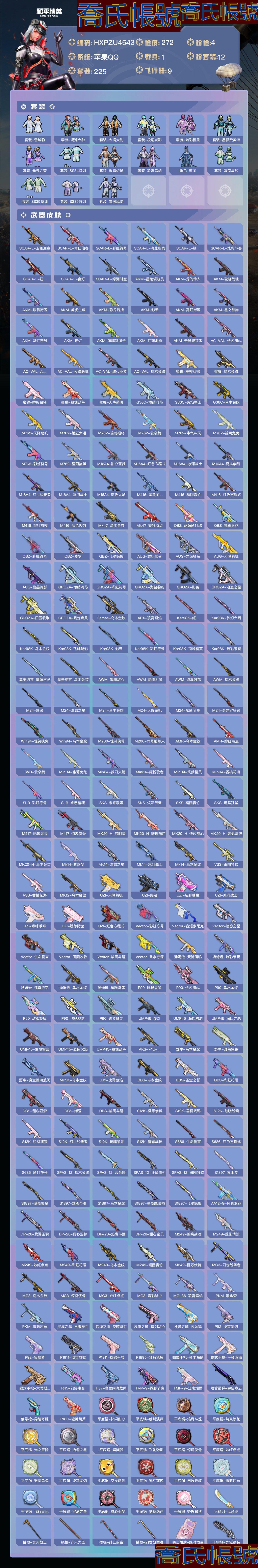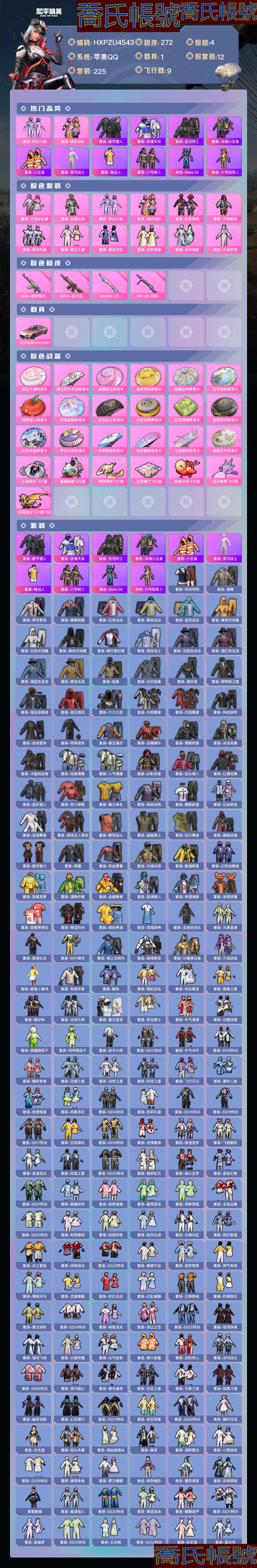【OBHXPZU454342】熱力值:97466,12粉裝,4粉槍,1載具,25粉色戰備,225套裝,272槍械,376裝備,14滑翔尾翼,103降落傘;等級:Lv.74 歷史最高段位:超級王牌12星 當前段位:超級.王牌;王牌印記18次 卓越印記1次; 【熱門品類】:套裝-都市獵人,套裝-浪漫天命,套裝-金羽特工,套裝-深海小丑魚,套裝-小丑魚,套裝-冥河戰士,套裝-龜仙人,套裝-六號樹人,角色-Mark.06,角色-六號稻草人;【粉色套裝】:粉裝-天使彩虹糖,粉裝-金曜白虎,粉裝-夢幻火箭,粉裝-繽紛油彩,粉裝-放客神遊,粉裝-天禪智恆,粉裝-紫電風暴,粉裝-第五大道,粉裝-碧藍澄空,粉裝-閒夢青纓,粉裝-金豐海韻,角色-冷漠羅麗;【粉色槍械】:AKM-綠蘿繁花[5級],M416-五爪金龍[7級],Kar98K-巳巳如意[5級],DP-28-豹影疾電[5級];【粉色載具】:瑪莎拉蒂Ghibli(粉);【粉色滑翔尾翼】:幻星艦長飛行器,智趣喵喵飛行器,拂曉神騎飛行器,百變魔方飛行器,歌者泠鳶飛行器,炫彩糖果飛行器,聖域金龍飛行器[1級];【粉色降落傘】:第五大道降落傘,精靈夢葉羅麗降落傘,海淵國主降落傘,垂柳戲鴨降落傘,智耀戰神降落傘,金豐海韻降落傘,緋果甜心降落傘,熒海星豚降落傘,未來戰士降落傘,創世救贖降落傘,恐龍拽拽降落傘,極限特訓降落傘,幻彩電音降落傘,夢幻火箭降落傘,未來歌姬降落傘,炫彩糖果降落傘,江南煙雨降落傘,春暖花開降落傘;【其他套裝】:套裝-特訓學院,套裝-獵鷹,套裝-青年教官,套裝-橘黑制服,套裝-紅色運動,套裝-黃色運動,套裝-藍色運動,套裝-黃色伏地魔,套裝-白色伏地魔,套裝-黑色伏地魔,套裝-騎行愛好者,套裝-競技名士,套裝-深藍色名流,套裝-酒紅色名流,套裝-湖藍色名流,套裝-黃色名流,套裝-猛禽,套裝-長空猛禽,套裝-漫步者,套裝-黎明保衛者,套裝-海島探路者,套裝-旭日情侶,套裝-六六大吉,套裝-冷焰舞者,套裝-灼焰舞者,套裝-特戰裝甲,套裝-戰地督導,套裝-特殊使命,套裝-春日漫步,套裝-龍騰端午,套裝-鷹眼刺客,套裝-冰凍風暴,套裝-冷酷挑戰者,套裝-完美偶像,套裝-人氣偶像,套裝-幻影武者,套裝-街頭潮人,套裝-紅潮炫舞,套裝-藍彩潮人,套裝-怒火燎原,套裝-魅力單車,套裝-綺麗塗鴉,套裝-耀眼新星,套裝-狂戰萌兔,套裝-堅韌舞者,套裝-競技達人朋克,套裝-野性戰心,套裝-超能勇士,套裝-狂沙舞者,套裝-破曉戰魂,套裝-都市魅力,套裝-榮耀,套裝-熱血青春,套裝-沙漠兵團,套裝-酷潮明星,套裝-幻世戰舞者,套裝-甜蜜菠蘿,套裝-清新檸檬,套裝-金耀舞者,套裝-藍調潮人,套裝-弄潮海豚,套裝-呆萌鐵蟹,套裝-甜蜜熊情侶,套裝-青澀時光,套裝-繽紛果語,套裝-濱海廚神,套裝-龍魂突擊隊,套裝-元素星魂,套裝-極速紅龍,套裝-WiFi精靈,套裝-海上生明月,套裝-麻辣教官,套裝-沙暴襲擊者,套裝-萬聖娃娃,套裝-破蛋小黃雞,套裝-軍械專家,套裝-鶴鳴,套裝-霓虹街區,套裝-純白誓言,套裝-萌黃之夏,套裝-隱空刺,套裝-擊劍大師,套裝-夏日音浪,套裝-探寶勇士,套裝-牛氣滿滿,套裝-白糯湯圓,套裝-萌趣顏糰子,套裝-特種顏糰子,套裝-戰術大師,套裝-SS12特訓,套裝-牛氣沖天,套裝-SS18特訓,套裝-耀粉歌者,套裝-迅捷之星,套裝-治癒之星,套裝-科技之星,套裝-飛行日記,套裝-曼妙人魚,套裝-熱情海星,套裝-純真浪花,套裝-SS14特訓,套裝-吉莉禮服,套裝-SS15特訓,套裝-SS16特訓,套裝-SS17特訓,套裝-空投萌嘰,套裝-SS19特訓,套裝-濃情蜜辣,套裝-極速競夢,套裝-飛馳魅影,套裝-音速流光,套裝-炫藍之夏,套裝-SS20特訓,套裝-獵夢紀元,套裝-甜心亞夢,套裝-虛音幻奏,套裝-SS21特訓,套裝-萌趣咩咩,套裝-嬌憨豬豬,套裝-夏雨遊龍,套裝-荷畔雨呱,套裝-玉兔迎春,套裝-SS22特訓,套裝-和煦暖陽,套裝-田園牧歌,套裝-輕風白浪,套裝-白嘯長虹,套裝-絢爛繁星,套裝-光之冒險,套裝-緋格組合,套裝-SS23特訓,套裝-香榭午後,套裝-甜夢熊熊,套裝-神氣柴柴,套裝-懵萌河馬,套裝-靈蜜圈圈,套裝-妙紅點點,套裝-幻彩翩翩,套裝-王牌教練,套裝-檸萌假日,套裝-青玉碎影,套裝-SS24特訓,套裝-絢紫流光,套裝-塗山之戀,套裝-SS25特訓,套裝-驚鴻俠骨,套裝-錦衣飛揚,套裝-雲霞荷露,套裝-元氣發射,套裝-果汁能量,套裝-龍的傳人,套裝-冰河戰士,套裝-SS26特訓,套裝-快閃甜心,套裝-春光漫遊,套裝-空島之星,套裝-貝斯之夜,套裝-焰鷹斗篷,套裝-幽夜迷蹤,套裝-幻羽潛行,套裝-SS27特訓,套裝-老實芭蕉,套裝-SS28特訓,角色-蝶吟花詞,角色-白光瑩,套裝-街頭風暴,套裝-海鹽綿綿冰,套裝-蝶變,套裝-湖畔霞光,套裝-小熊娃娃,套裝-SS29特訓,套裝-雛菊兔兔,套裝-蘿蘭蝴蝶,角色-緋色魅影,角色-魔藥課室,套裝-異域銀裝,角色-摩登魅貓,套裝-星途旅人,套裝-SS30特訓,套裝-青團波波,套裝-糖糖葫蘆,套裝-SS31特訓,套裝-紫幽夢,套裝-SS33特訓,套裝-雲朵鵝,套裝-SS32特訓,套裝-彩虹兔,套裝-藍冰羽,套裝-雪絨豹,套裝-混沌火種,套裝-大橘大利,套裝-極速光影,套裝-炫彩糖果,套裝-星影讚美詩,套裝-元氣之夢,套裝-SS34特訓,套裝-朱霞熾焰,套裝-凌霄紫焰,角色-敖閏,套裝-薄荷星砂,套裝-SS35特訓,套裝-SS36特訓,套裝-雪國風尚;其他槍械:SCAR-L-玉兔迎春,SCAR-L-青丘仙客,SCAR-L-彩虹符號,SCAR-L-海鹽豹豹,SCAR-L-銀碳小老虎,SCAR-L-炫彩節奏,SCAR-L-紅色方程式,SCAR-L-夜燈,SCAR-L-綠洲時空,AKM-星兔領航員,AKM-龍的傳人,AKM-破曉戰魂,AKM-塗鴉街區,AKM-虎虎生威,AKM-恐龍拽拽,AKM-影襲,AKM-霓虹街區,AKM-星之彼岸,AKM-彩虹符號,AKM-夜燈,AKM-萌趣顏糰子,AKM-江南煙雨,AKM-奇異狩獵者,AC-VAL-快閃甜心,AC-VAL-六號稻草人,AC-