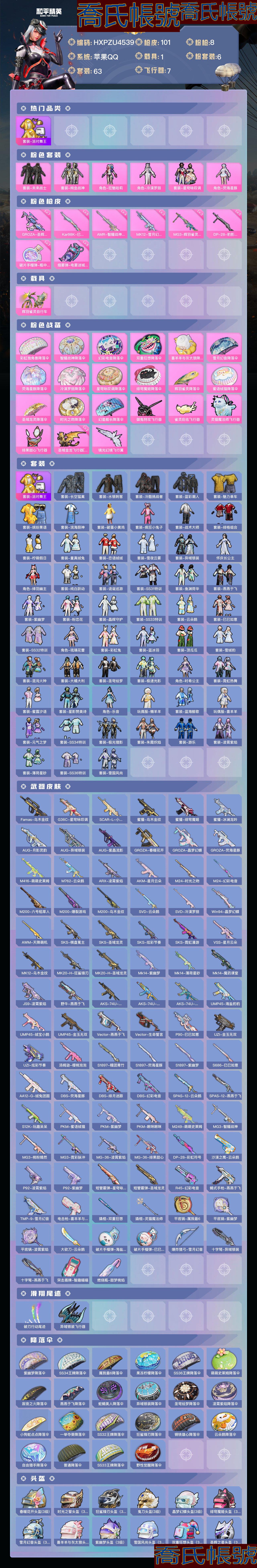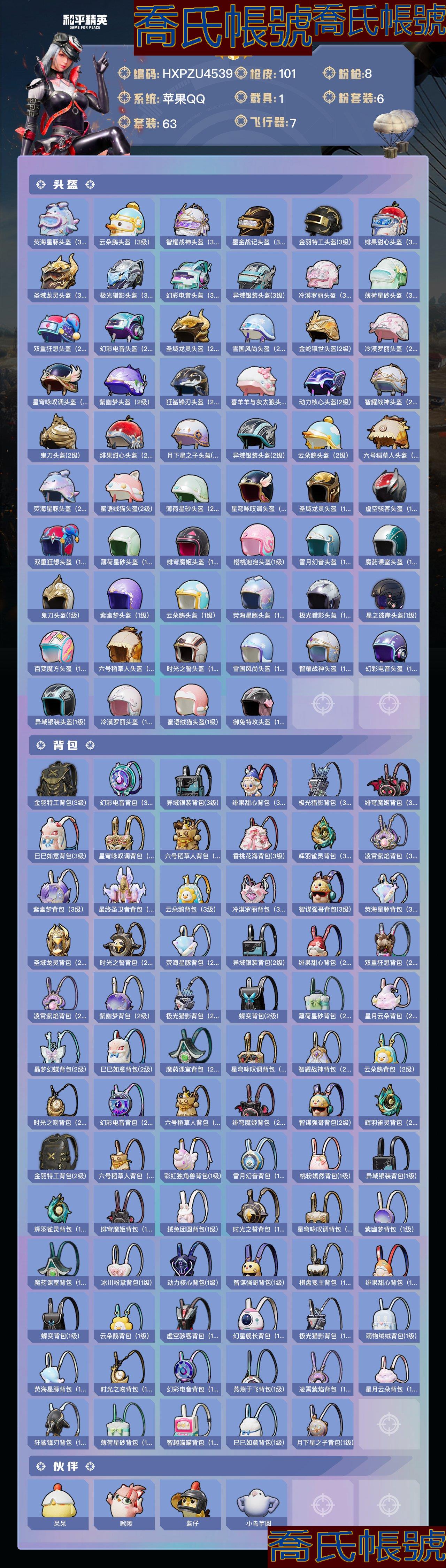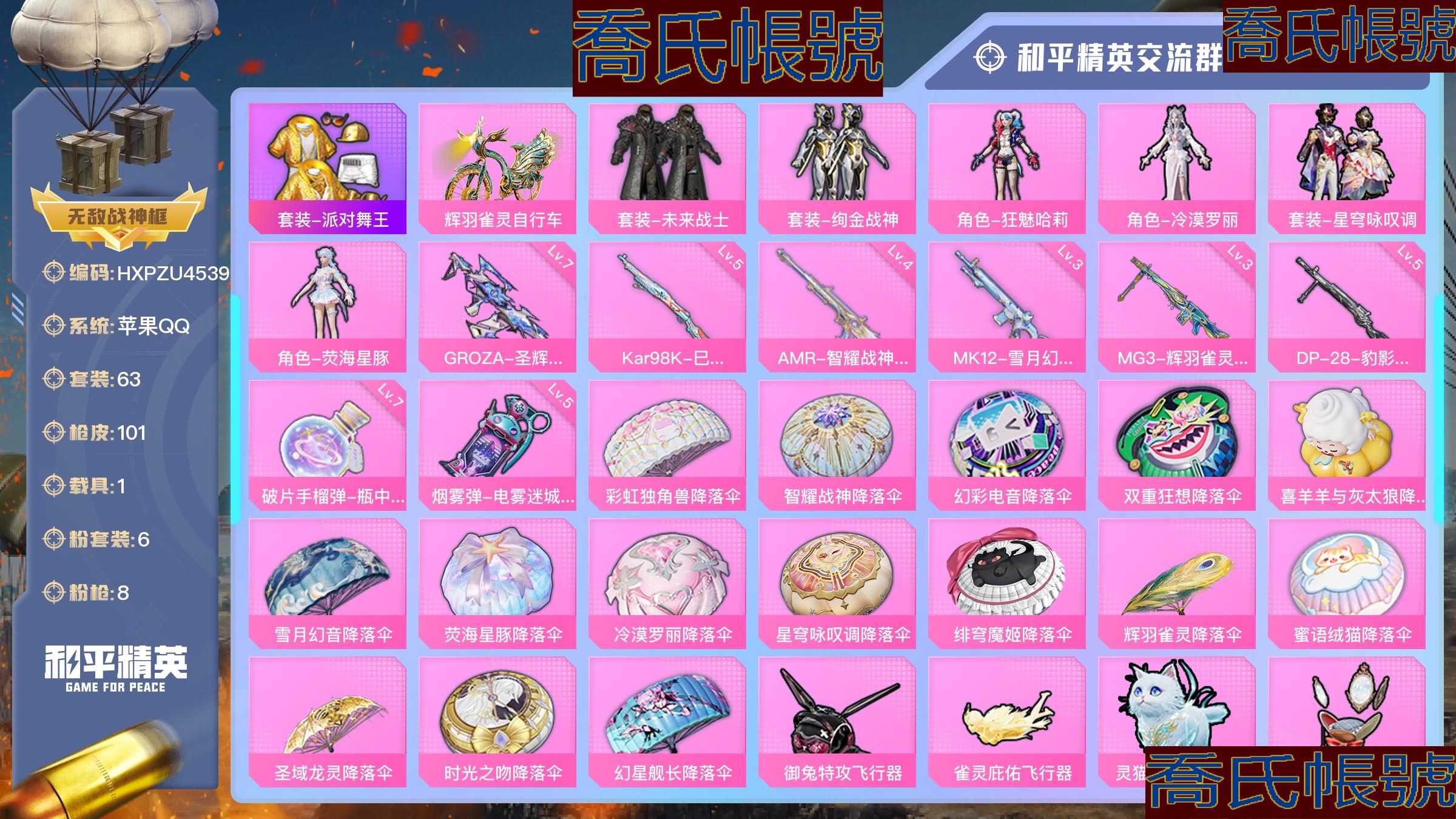 【OBHXPZU453942】熱力值:35831,6粉裝,8粉槍,1載具,21粉色戰備,63套裝,101槍械,164裝備,8滑翔尾翼,37降落傘;等級:Lv.48 歷史最高段位:無敵戰神 當前段位:超級.王牌;王牌印記4次 卓越印記3次 傳奇印記2次 絕世印記2次;地鐵滿天賦; 【熱門品類】:套裝-派對舞王;【粉色套裝】:粉裝-未來戰士,粉裝-絢金戰神,角色-狂魅哈莉,角色-冷漠羅麗,粉裝-星穹詠嘆調,角色-熒海星豚;【粉色槍械】:GROZA-聖輝之星[7級],Kar98K-巳巳如意[5級],AMR-智耀戰神[4級],MK12-雪月幻音[3級],MG3-輝羽雀靈[3級],DP-28-豹影疾電[5級],破片手榴彈-瓶中星球[7級],煙霧彈-電霧迷城[5級];【粉色載具】:輝羽雀靈腳踏車;【粉色滑翔尾翼】:御兔特攻飛行器,雀靈庇佑飛行器,靈貓魔法師飛行器,緋果甜心飛行器,聖域金龍飛行器[2級],鏡光幻境飛行翼;【粉色降落傘】:彩虹獨角獸降落傘,智耀戰神降落傘,幻彩電音降落傘,雙重狂想降落傘,喜羊羊與灰太狼降落傘,雪月幻音降落傘,熒海星豚降落傘,冷漠羅麗降落傘,星穹詠嘆調降落傘,緋穹魔姬降落傘,輝羽雀靈降落傘,蜜語絨貓降落傘,聖域龍靈降落傘,時光之吻降落傘,幻星艦長降落傘;【其他套裝】:套裝-長空猛禽,套裝-水銀刺客,套裝-冷酷挑戰者,套裝-藍彩潮人,套裝-魅力單車,套裝-繽紛果語,套裝-濱海廚神,套裝-破蛋小黃雞,套裝-瘋狂小兔子,套裝-戰術大師,套裝-緋格組合,套裝-檸萌假日,套裝-童真絨兔,套裝-戀語絨絨,套裝-雪夜雲霧,套裝-異域銀裝,角色-懷慶長公主,角色-絳羽幽主,套裝-純白躍動,套裝-詭誕巡遊,套裝-SS31特訓,套裝-魚淵荷華,套裝-燕燕於飛,套裝-紫幽夢,套裝-粉戀花,套裝-晶輝守護,套裝-SS33特訓,套裝-雲朵鵝,套裝-巳巳如意,套裝-SS32特訓,角色-琉璃花蕾,套裝-彩虹兔,套裝-藍冰羽,套裝-頂瓜瓜,套裝-雪絨豹,套裝-混沌火種,套裝-大橘大利,套裝-聖穹繪夢,套裝-極速光影,角色-時希公主,套裝-霓虹熱舞,套裝-蜜露汐語,套裝-星影讚美詩,角色-樂音,玩偶服-懶羊羊,套裝-藍海鯨歌,玩偶服-喜羊羊,套裝-元氣之夢,套裝-SS34特訓,套裝-極光獵影,套裝-朱霞熾焰,套裝-遊樂,套裝-凌霄紫焰,套裝-薄荷星砂,套裝-SS36特訓,套裝-雪國風尚;其他槍械:Famas-烏木金紋,G36C-星穹詠嘆調,SCAR-L-小狗蛇點點,蜜獾-烏木金紋,蜜獾-緋穹魔姬,蜜獾-冰瀾龍吟,AUG-月影靈韻,AUG-異域銀裝,AUG-紫晶流影,GROZA-春暖花開,GROZA-晶夢幻蝶,GROZA-熒海星豚,M416-萌萌史萊姆,M762-雲朵鵝,ARX-凌霄紫焰,AKM-星月雲朵,M24-時光之吻,M24-幻彩電音,M200-六號稻草人,M200-爆裂遊戲,M200-烏木金紋,SVD-雲朵鵝,SVD-冷漠羅麗,Win94-晶夢幻蝶,AWM-天降萌嘰,SKS-棋盤冕主,SKS-聖域龍靈,SKS-炫彩節奏,SKS-霓虹漫遊,VSS-星月雲朵,MK12-烏木金紋,MK20-H-狂鯊鋒刃,MK20-H-聖域龍靈,Mk14-紫幽夢,Mk14-薄荷星砂,Mk14-魔藥課室,JS9-凌霄紫焰,野牛-燕燕於飛,AKS-74U-烏木金紋,AKS-74U-雞智如我,AKS-74U-輝羽雀靈,UMP45-海鹽豹豹,UMP45-絨寶小鵝,UMP45-金玉無雙,Vector-燕燕於飛,Vector-生命誓言,P90-巳巳如意,UZI-金玉無雙,UZI-炫彩節奏,湯姆遜-櫻桃泡泡,S1897-糯團青竹,S1897-熒海星豚,S1897-紫幽夢,S686-巳巳如意,AA12-G-絨兔團圓,DBS-熒海星豚,DBS-緋月迷蹤,DBS-幻彩電音,SPAS-12-雲朵鵝,SPAS-12-燕燕於飛,S12K-玩趣呆呆,PKM-蜜語絨貓,PKM-紫幽夢,PKM-啾咪啾咪,M249-萌萌史萊姆,MG3-智耀戰神,MG3-桃粉嫣然,MG3-霓彩脈衝,MG-36-凌霄紫焰,MG-36-緋果甜心,DP-28-彩虹符號,沙漠之鷹-雲朵鵝,P92-凌霄紫焰,P92-紫幽夢,短管霰彈-星穹詠嘆調,短管霰彈-聖域龍靈,R45-幻彩電音,蠍式手槍-燕燕於飛,TMP-9-雪月幻音,電擊槍-喜羊羊與灰太狼,撬棍-雙重狂想,撬棍-靈貓魔法師,平底鍋-屬我最6,平底鍋-紫幽夢,平底鍋-凌霄紫焰,大砍刀-雲朵鵝,破片手榴彈-海鹽豹豹,破片手榴彈-巳巳如意,爆炸獵弓-雪月幻音,十字弩-異域銀裝,十字弩-燕燕於飛,突擊盾牌-智趣喵喵,燃燒瓶-甜夢桃焰;【其他滑翔尾翼】:破刃行動尾跡,異域銀裝飛行器;【其他降落傘】:紫幽夢降落傘,SS34王牌降落傘,屬我最6降落傘,果凍檸檬降落傘,SS36王牌降落傘,萌萌史萊姆降落傘,寂夜之火降落傘,燕燕於飛降落傘,蛇蠍美人降落傘,異域銀裝降落傘,聖穹繪夢降落傘,凌霄紫焰降落傘,小狗蛇點點降落傘,一舉奪葵降落傘,SS32王牌降落傘,狂鯊鋒刃降落傘,鋼鐵雄心降落傘,雲朵鵝降落傘,自由獵手降落傘,普通降落傘,SS33王牌降落傘,野性覺醒降落傘;【夥伴】:夥伴-呆呆,夥伴-啾啾,夥伴-盔仔,夥伴-小鳥芋圓,【實際資訊請以最終驗號結果為準】【蘋果QQ】12月13號1200買的又充了一百多現在急用錢底價1000 258扭蛋碎片 200榮耀勳章 清寂之聖 挺好的不用改 頭盔雙重幻想一套 揹包輝羽雀羚一套 小丑女基本上也可以焊在身上一輩子了 也可以玩公主穿搭有蝴蝶眼罩純白躍動 一秒兵團副團長