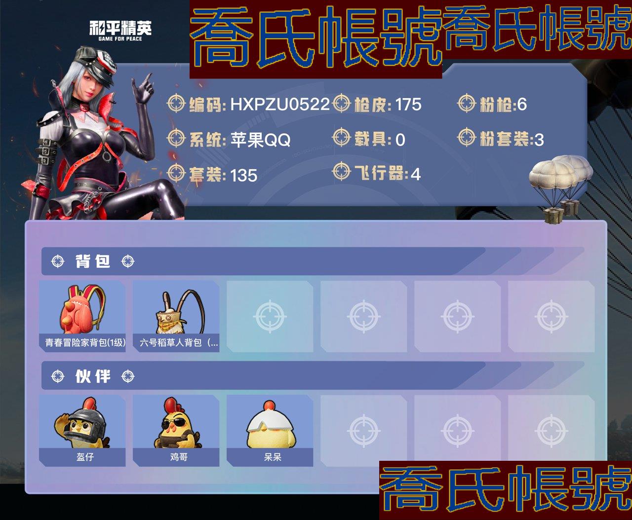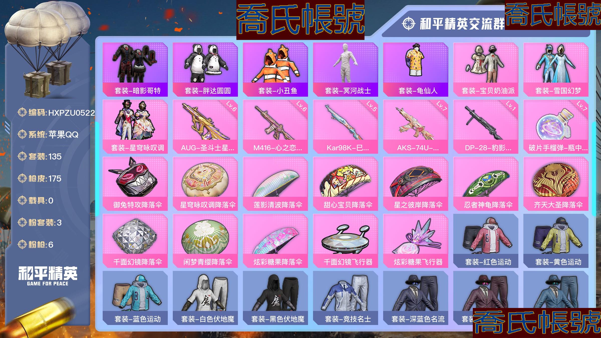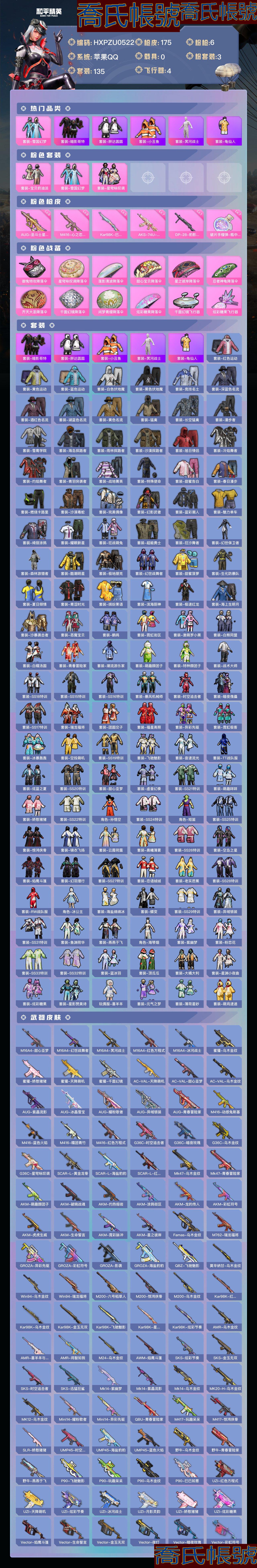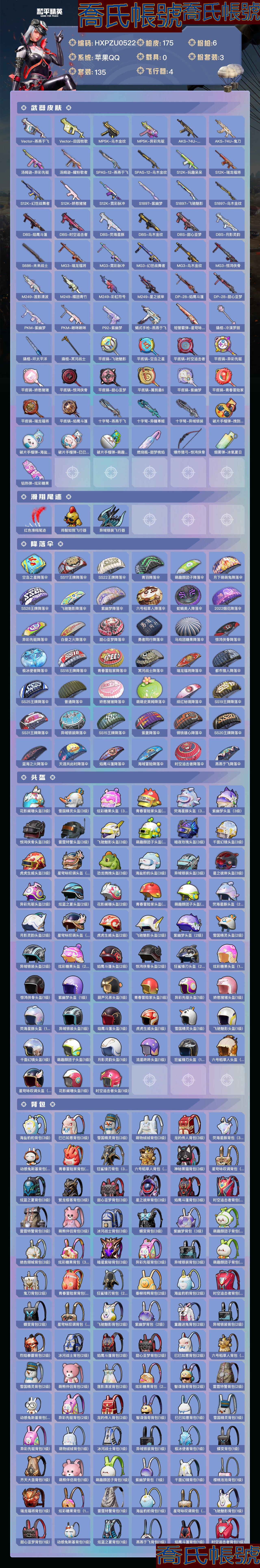 【OBHXPZU052242】熱力值:53005,3粉裝,6粉槍,12粉色戰備,135套裝,175槍械,169裝備,5滑翔尾翼,52降落傘;等級:Lv.63 歷史最高段位:卓越王牌15星 當前段位:英勇.黃金Ⅲ;王牌印記9次 卓越印記1次;地鐵滿天賦; 【熱門品類】:套裝-暗影哥特,套裝-胖達圓圓,套裝-小丑魚,套裝-冥河戰士,套裝-龜仙人;【粉色套裝】:粉裝-寶貝奶油派,粉裝-雪國幻夢,粉裝-星穹詠嘆調;【粉色槍械】:AUG-聖鬥士星矢[6級],M416-心之戀語[6級],Kar98K-巳巳如意[5級],AKS-74U-星穹詠嘆調[7級],DP-28-豹影疾電[1級],破片手榴彈-瓶中星球[7級];【粉色滑翔尾翼】:千面幻鏡飛行器,炫彩糖果飛行器;【粉色降落傘】:御兔特攻降落傘,星穹詠嘆調降落傘,蓮影清波降落傘,甜心寶貝降落傘,星之彼岸降落傘,忍者神龜降落傘,齊天大聖降落傘,千面幻鏡降落傘,閒夢青纓降落傘,炫彩糖果降落傘;【其他套裝】:套裝-紅色運動,套裝-黃色運動,套裝-藍色運動,套裝-白色伏地魔,套裝-黑色伏地魔,套裝-競技名士,套裝-深藍色名流,套裝-酒紅色名流,套裝-湖藍色名流,套裝-黃色名流,套裝-猛禽,套裝-長空猛禽,套裝-漫步者,套裝-雪鷹學院,套裝-海島探路者,套裝-雨林探路者,套裝-沙漠探路者,套裝-旭日情侶,套裝-冷焰舞者,套裝-灼焰舞者,套裝-青羽突襲者,套裝-戰地菁英,套裝-特殊使命,套裝-甜蜜告白,套裝-春日漫步,套裝-燃燒卡路里,套裝-沙漠毒蛇,套裝-完美偶像,套裝-幻影武者,套裝-藍彩潮人,套裝-魅力單車,套裝-綺麗塗鴉,套裝-耀眼新星,套裝-狂戰萌兔,套裝-超能勇士,套裝-狂沙舞者,套裝-幻世保衛者,套裝-森林遊獵者,套裝-酷潮明星,套裝-極地朋克,套裝-幻世戰舞者,套裝-甜蜜菠蘿,套裝-生化防暴隊,套裝-夏日傾情,套裝-青澀時光,套裝-繽紛果語,套裝-濱海廚神,套裝-極速紅龍,套裝-海上生明月,套裝-沙暴襲擊者,套裝-惡魔寶貝,套裝-鶴鳴,套裝-霓虹街區,套裝-激萌羅小黑,套裝-白熊同盟,套裝-白糯湯圓,套裝-青春冒險家,套裝-潮流遊樂家,套裝-萌趣顏糰子,套裝-特種顏糰子,套裝-戰術大師,套裝-SS18特訓,套裝-SS15特訓,套裝-SS16特訓,套裝-暴風機械師,套裝-時空追擊者,套裝-暗夜傀儡,套裝-SS17特訓,套裝-瑞龍福將,套裝-團圓交子,套裝-福星高照,套裝-異彩先驅,套裝-霓虹極客,套裝-冰暴轟轟,套裝-空投萌嘰,套裝-SS19特訓,套裝-飛馳魅影,套裝-音速流光,套裝-TT戰隊服,套裝-炫藍之夏,套裝-SS20特訓,套裝-甜心亞夢,套裝-虛音幻奏,套裝-SS21特訓,套裝-萌趣咩咩,套裝-嬌憨豬豬,套裝-SS22特訓,角色-孫悟空,套裝-SS24特訓,角色-短笛,套裝-SS25特訓,套裝-驚鴻俠骨,套裝-錦衣飛揚,套裝-雲霞荷露,套裝-晨曦薄霧,套裝-SS26特訓,套裝-空島之星,套裝-焰鷹斗篷,套裝-幻羽潛行,套裝-SS27特訓,套裝-戀語絨絨,套裝-老實芭蕉,套裝-SS28特訓,套裝-RW戰隊服,角色-冰公主,套裝-海鹽綿綿冰,套裝-蝶變,套裝-SS29特訓,套裝-異域銀裝,套裝-SS31特訓,套裝-魚淵荷華,套裝-燕燕於飛,角色-海琴煙,套裝-紫幽夢,套裝-粉戀花,套裝-SS33特訓,套裝-SS32特訓,套裝-藍冰羽,套裝-頂瓜瓜,套裝-大橘大利,套裝-星淵小夜曲,套裝-炫彩糖果,套裝-星影讚美詩,玩偶服-喜羊羊,套裝-元氣之夢,套裝-薄荷星砂,套裝-萌雞速遞;其他槍械:M16A4-甜心亞夢,M16A4-幻世戰舞者,M16A4-冥河戰士,M16A4-紅色方程式,M16A4-冰河戰士,蜜獾-烏木金紋,蜜獾-嬌憨豬豬,蜜獾-天降萌嘰,蜜獾-千面幻鏡,AC-VAL-天降萌嘰,AC-VAL-甜心亞夢,AC-VAL-烏木金紋,AUG-紫晶流影,AUG-冰晶雪寶,AUG-耀粉歌者,AUG-異域銀裝,AUG-青春冒險家,M416-動感兔斯基,M416-藍色火焰,M416-糯團青竹,M416-紅色方程式,G36C-時空追擊者,G36C-暗夜玫瑰,G36C-烏木金紋,G36C-星穹詠嘆調,SCAR-L-黃金龍骨,SCAR-L-海鹽豹豹,SCAR-L-紅色方程式,Mk47-烏木金紋,Mk47-青春冒險家,AKM-萌趣顏糰子,AKM-破曉戰魂,AKM-灼熱熔岩,AKM-塗鴉街區,AKM-龍的傳人,AKM-彩虹符號,AKM-虎虎生威,AKM-生命誓言,AKM-霓彩脈衝,AKM-星之彼岸,Famas-烏木金紋,M762-瑞龍福將,GROZA-異彩先驅,GROZA-彩虹符號,GROZA-影襲,GROZA-海鹽豹豹,QBZ-飛馳魅影,莫辛納甘-烏木金紋,Win94-烏木金紋,Win94-瑞龍福將,M200-六號稻草人,M200-驚鴻俠骨,M200-烏木金紋,Kar98K-紅色方程式,Kar98K-烏木金紋,Kar98K-金玉無雙,Kar98K-飛馳魅影,Kar98K-星穹詠嘆調,Kar98K-炫彩節奏,AMR-烏木金紋,AMR-喜羊羊與灰太狼,AMR-雞智如我,M24-烏木金紋,AWM-焰鷹斗篷,SKS-炫彩節奏,SKS-金玉無雙,SKS-時空追擊者,SKS-迅猛狂鯊,Mk14-紫幽夢,Mk14-紫晶流影,Mk14-烏木金紋,MK20-H-烏木金紋,MK12-烏木金紋,Mini14-耀粉歌者,Mini14-異彩先驅,QBU-青春冒險家,M417-玩趣呆呆,M417-驚鴻俠骨,SLR-嬌憨豬豬,UMP45-時空追擊者,UMP45-海鹽豹豹,UMP45-藍色火焰,野牛-烏木金紋,野牛-青春冒險家,野牛-燕燕於飛,P90-飛馳魅影,P90-玩趣呆呆,P90-烏木金紋,P90-巳巳如意,UZI-紅色方程式,UZI-天降萌嘰,UZI-炫彩節奏,UZI-冰河戰士,UZI-月影靈韻,UZI-嬌憨豬豬,UZI-炫彩糖果,Vector-焰鷹斗篷,Vector-生命誓言,Vector-金玉無雙,Vector-夜燈,Vector-暗夜玫瑰,Vector-彩虹符號,Vector-燕燕於飛,Vector-田園牧歌,MP5K-烏木金紋,MP5K-異彩先驅,AKS-74U-烏木金紋,AKS-74U-鬼刀,湯姆遜-異彩先驅,湯姆遜-耀粉歌者,SPAS-12-燕燕於飛,SPAS-12-烏木金紋,S12K-玩趣呆呆,S12K-瑞龍福將,S12K-幻世戰舞者,S12K-嬌憨豬豬,S12K-霓彩脈衝,S1897-紫幽夢,S1897-飛馳魅影,S1897-烏木金紋,DBS-焰鷹斗篷,DBS-時空追擊者,DBS-熒海星豚,DBS-烏木金紋,DBS-甜心亞夢,DBS-月影靈韻,S686-未來戰士,MG3-瑞龍福將,MG3-霓彩脈衝,MG3-幻世戰舞者,MG3-烏木金紋,MG3-驚鴻俠骨,M
