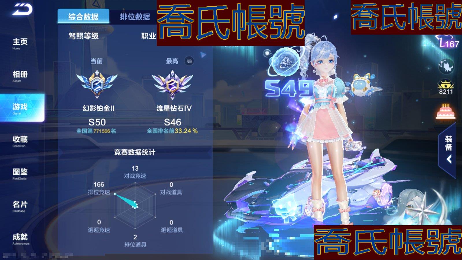 【OBQLRYA227542】賬號等級68,段位:幻影鉑金Ⅱ,魅力值0.82萬,閃耀等級7級,貴族特權:貴族6,車總數量:16,T車數量:0,A車數量:16,車皮數量:6,A車:S-絃音,幽夜赤魅,飛馳人身,微光晶恆,飛馳獵手,鈴語星橇,阿斯頓馬丁Valkyrie,青鋒寒影,星河逐影,AE86,墨染青花波瀾,閃耀之星,星河戰刃,貂蟬·閉月,赤焰天啟,極音戰歌;車皮:月影甜心夢櫻,絃音天使之羽,布加迪淵虹,星河逐影夜曜,墨染青花波潤,微光晶恆星漪;寵物:乾麵霧使,古堡幻靈,雪熊靈寶,叮噹花鼠,詠歎歌靈,流螢夜火,幽藍行影,熊星人,金錢豹,飛虎王,麻婆豆腐,企鵝溜溜,極光糰子,企鵝囡囡,企鵝仔仔;絃音+天使之羽+起步寵物