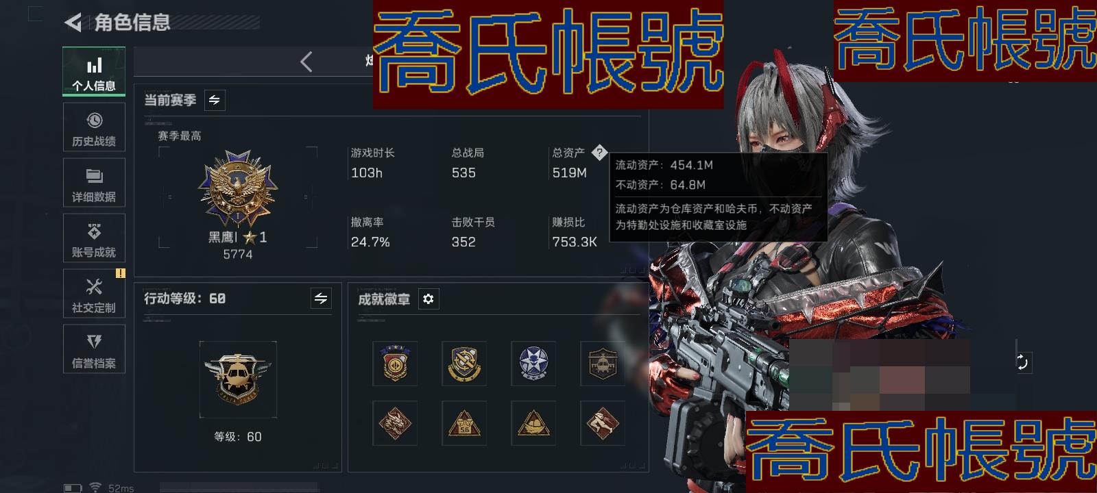 【OBSUUHK341642】總資產:519M,哈夫幣:10400W,武器皮膚:4,烽火60級:黑鷹_,【安全箱】基礎安全箱;【特勤處等級】倉庫LV.9,靶場LV.4,訓練中心LV.4;【幹員皮膚】紅狼電鋸驚魂;【近戰武器】近戰武器-電鋸驚魂;【步槍皮膚】AK-12突擊步槍-特斯拉線圈,KC17突擊步槍-電鋸驚魂;【衝鋒槍皮膚】UZI衝鋒槍-特斯拉線圈;(資訊源於賣家釋出,實際資訊以驗號為準)【QQ登入】總資產519m/現金104m/維什戴爾/電鋸驚魂紅狼/無題密令/不破誓約/awm160發/3x3已做/電鋸驚魂捆綁包/滿潛水/