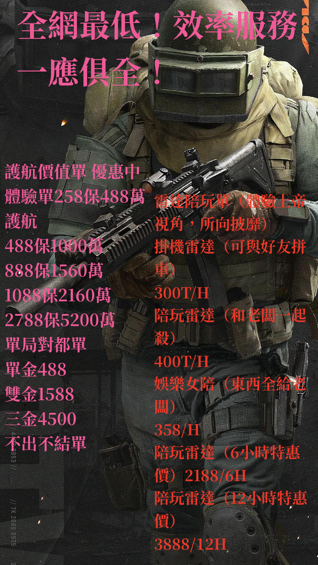掛機雷達(可與好友拼車)300T/H 陪玩雷達(和老闆一起殺)400T/H 娛樂女陪(東西全給老闆)358T/H 陪玩雷達(6小時特惠價)2188T/6H 陪玩雷達(12小時特惠價)3888/12H