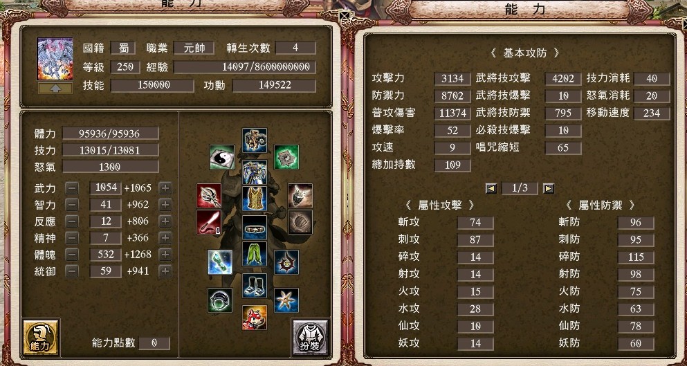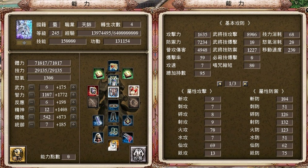 +15胤婪手甲、+17強4戌豚套、+17資訊貓、+15封射66%祕製護腕 、+6封斬46%奇聞護腕、+17三洞血月披風、雙聖龍護符、+17強4剛甲武雙內衣、+10天下布武配戒、+5真.射裂配飾