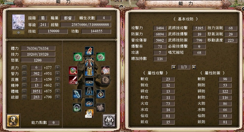 +18魂玉槍、+15未羊套強344、+17三洞武雙秘衣、+17強3黑星闇翼盾衝剛護、+20強4封刺33%奇聞護腕、+17三洞血月、+17萊西、3空星軒轅槍2軒轅槍、+10統兵遣將配飾、+5真.斬破配飾