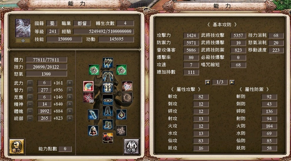 +20血啼櫻、+17強4申犬套、+15強4剛甲高階馬甲、+17三洞黑星金麟塔盾、+20強4七星腰帶、+17三洞秘製蒼天護腕、+17三洞血月、4軒轅槍、+6統兵遣將配飾、+5射裂配飾