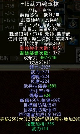 +18魂玉槍、+15未羊套強344、+17三洞武雙秘衣、+17強3黑星闇翼盾衝剛護、+20強4封刺33%奇聞護腕、+17三洞血月、+17萊西、3空星軒轅槍2軒轅槍、+10統兵遣將配飾、+5真.斬破配飾