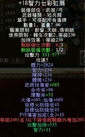 +18七彩虹扇、+17強4極.柳宿套、+15強3剛甲武雙內衣、+17強4黑星聚精盾衝剛護、+15三洞秘製蒼天護腕、+17三洞血月、+17木棉貓、4軒轅槍、+7統兵遣將配飾