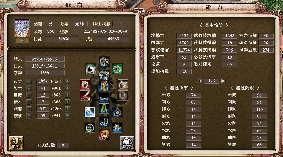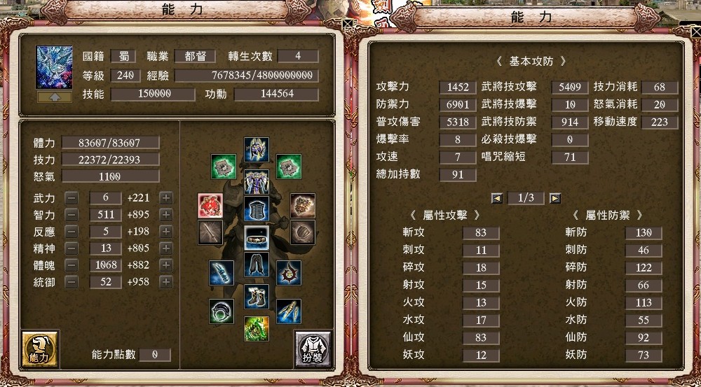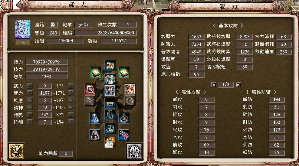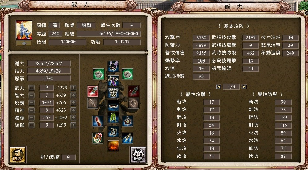 +15胤婪手甲、+17強4戌豚套、+17資訊貓、+15封射66%祕製護腕 、+6封斬46%奇聞護腕、+17三洞血月披風、雙聖龍護符、+17強4剛甲武雙內衣、+10天下布武配戒、+5真.射裂配飾