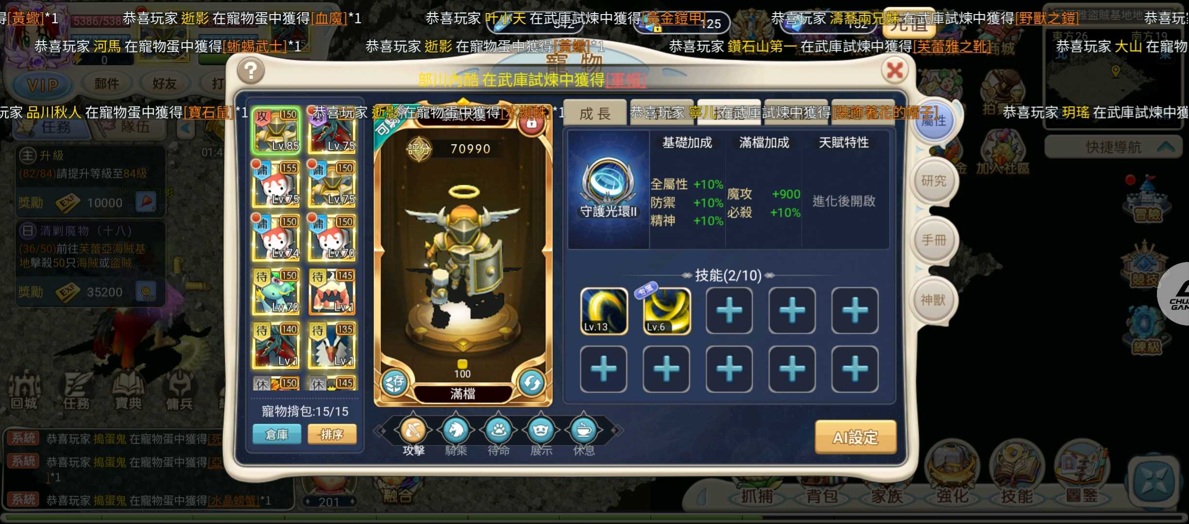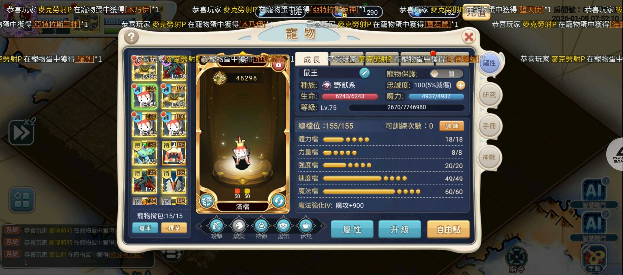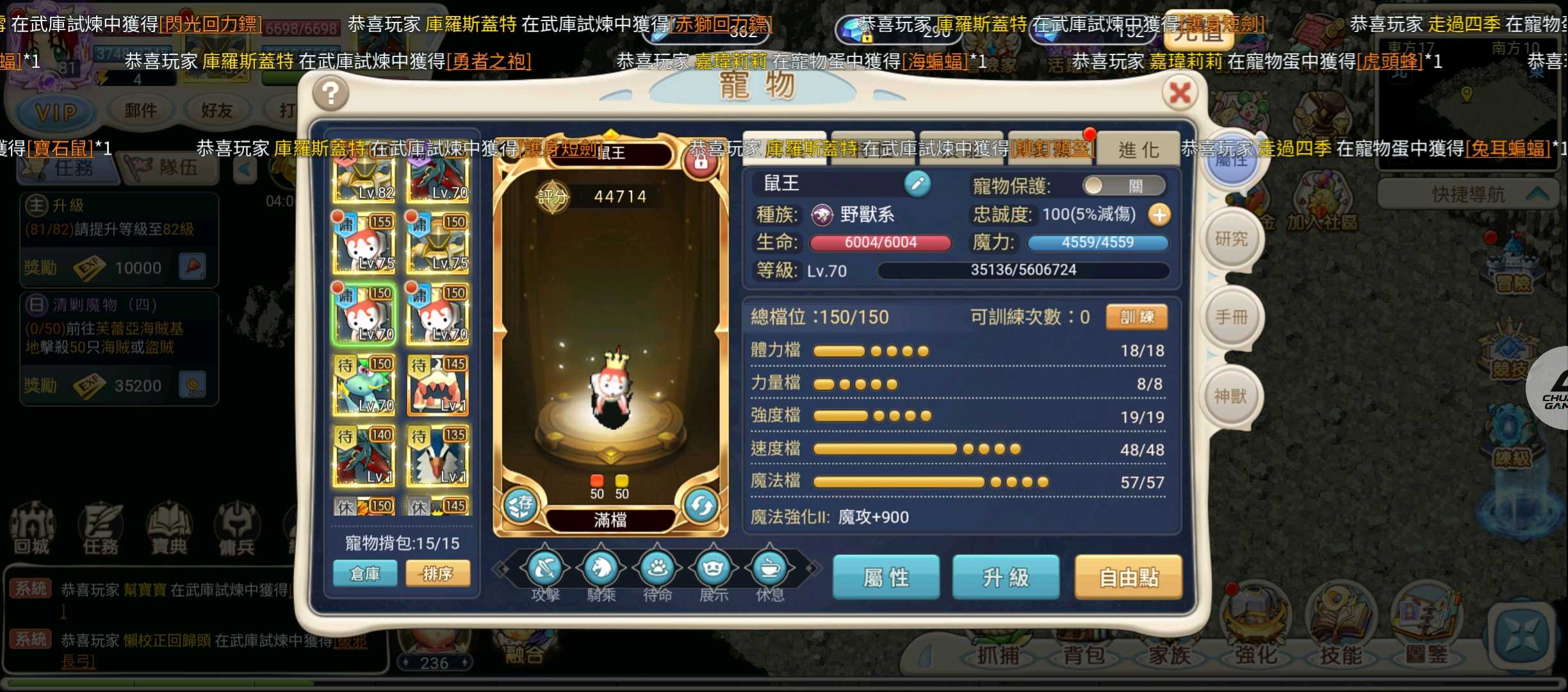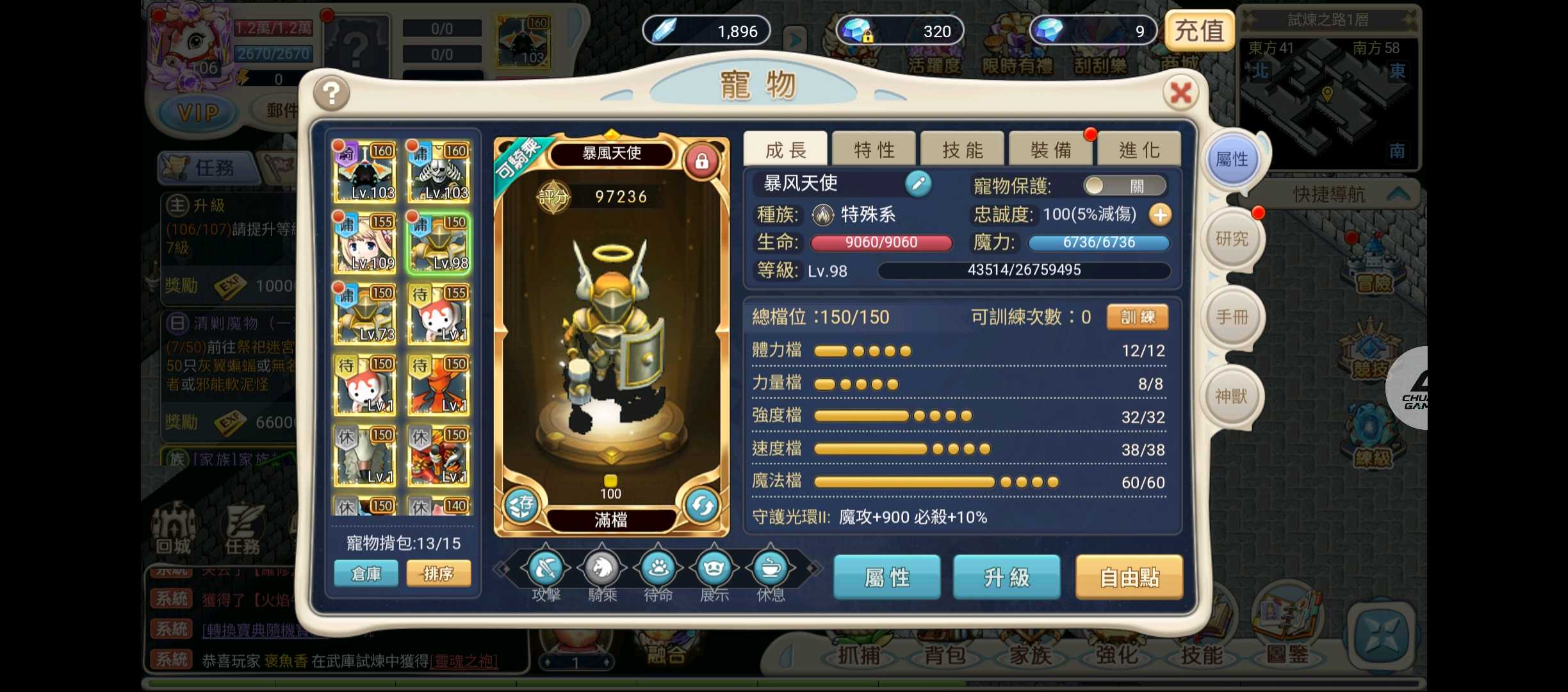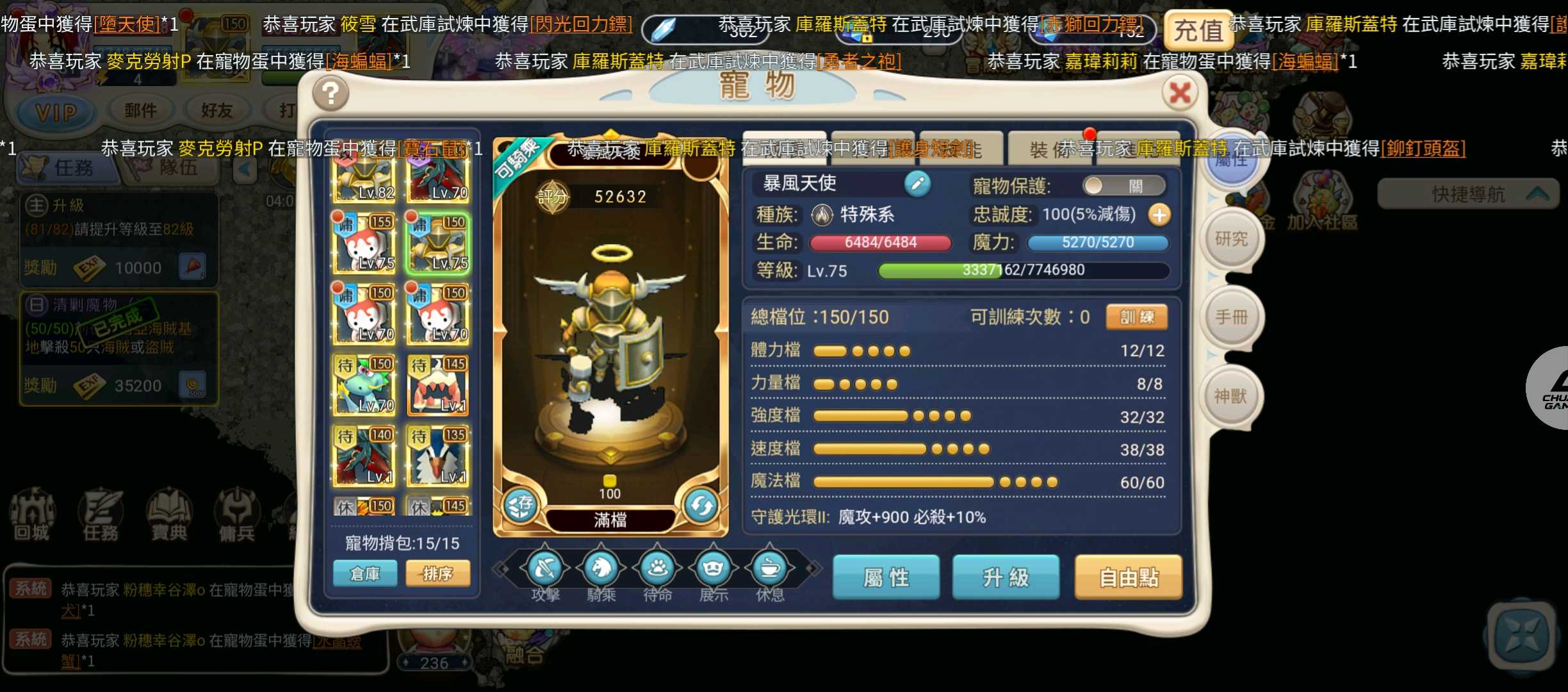 雙子1 110級格鬥(持續進度中)160魟魚 160鐮刀魔 150滿檔天使2隻 155謝雷簡 155滿檔鼠王1隻 150滿檔寵1隻 155滿檔寵2隻 (價格可談)
