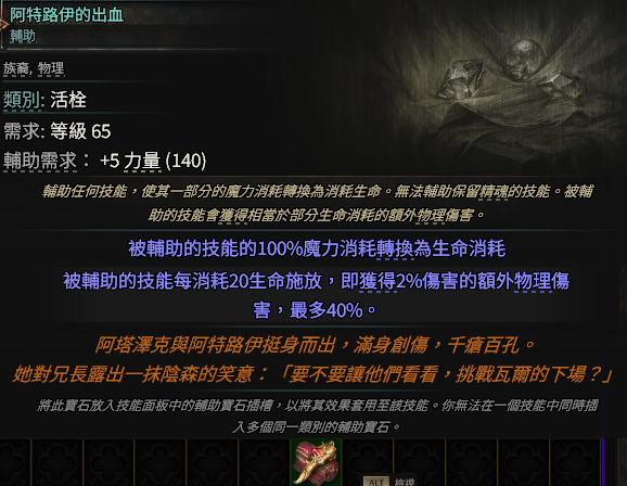 道具 【輔助寶石】 阿特路伊的出血 消耗生命提升傷害